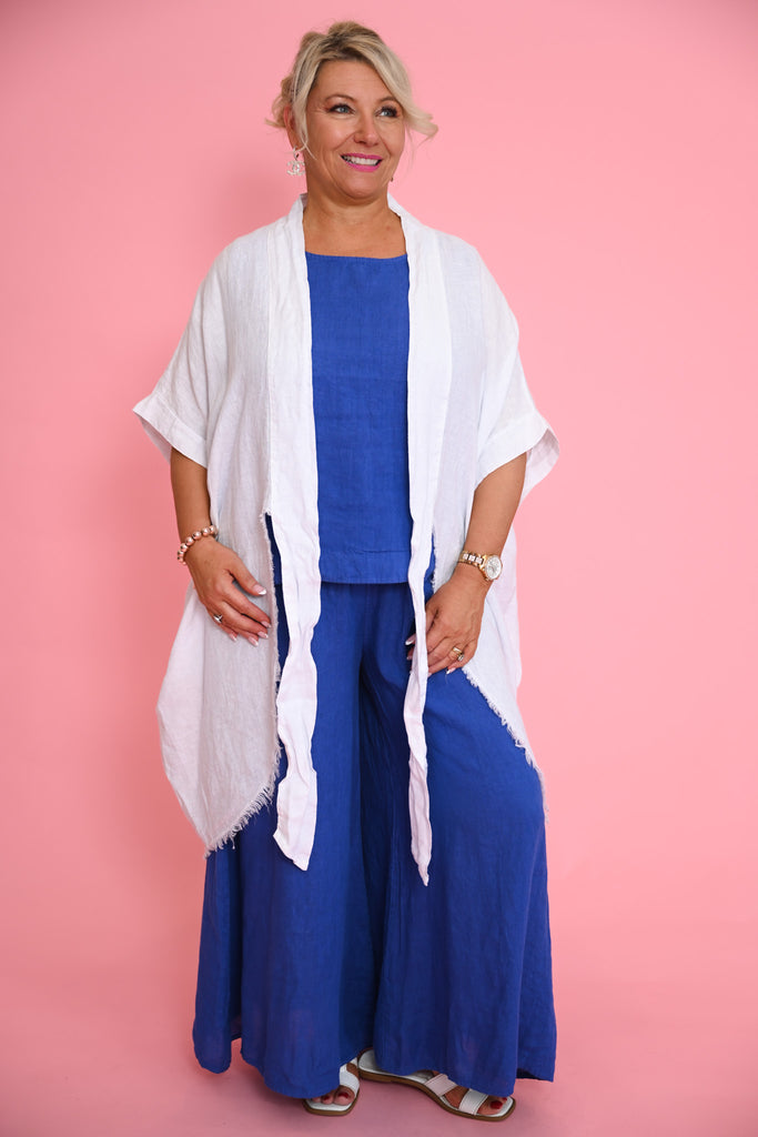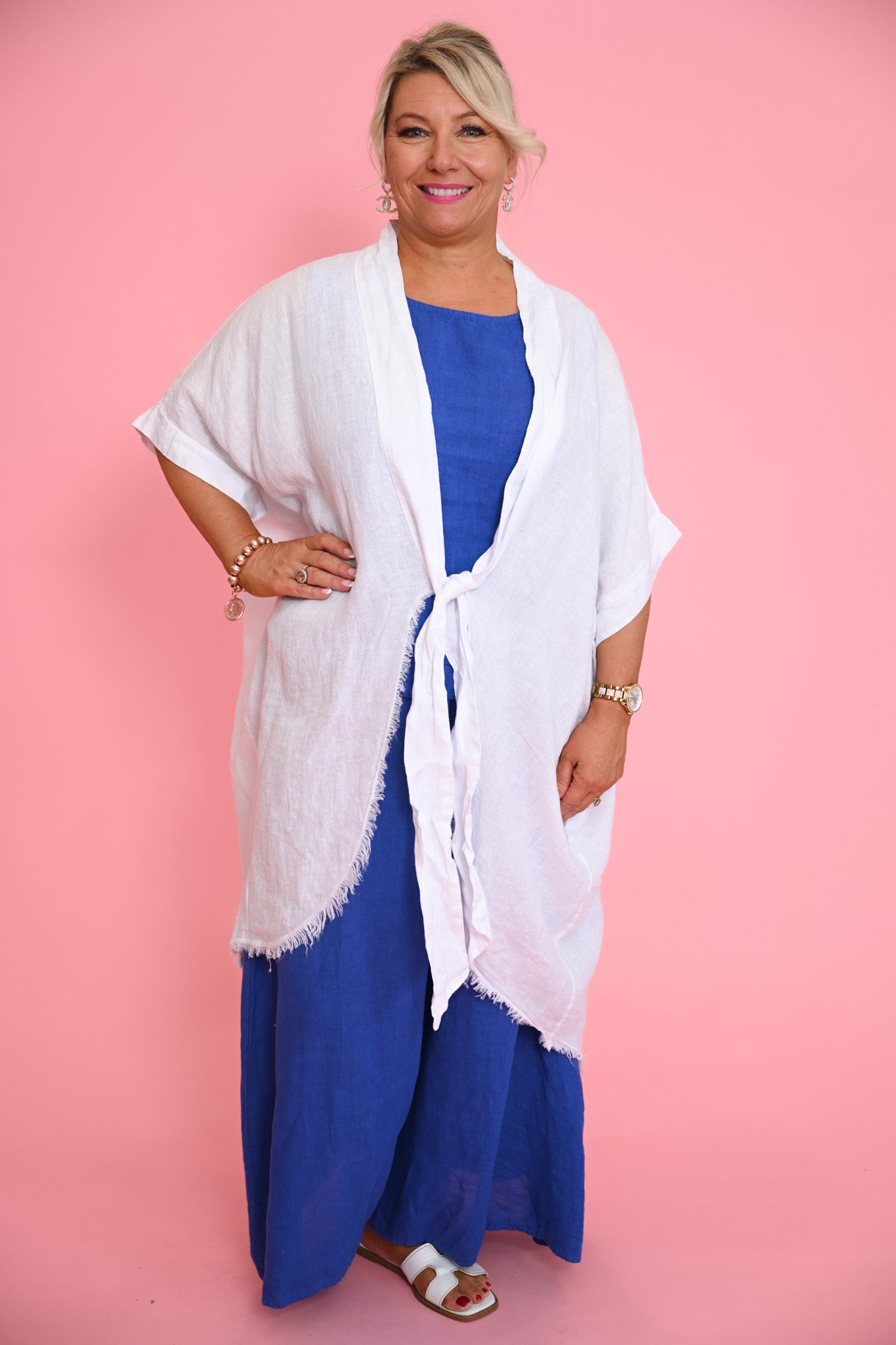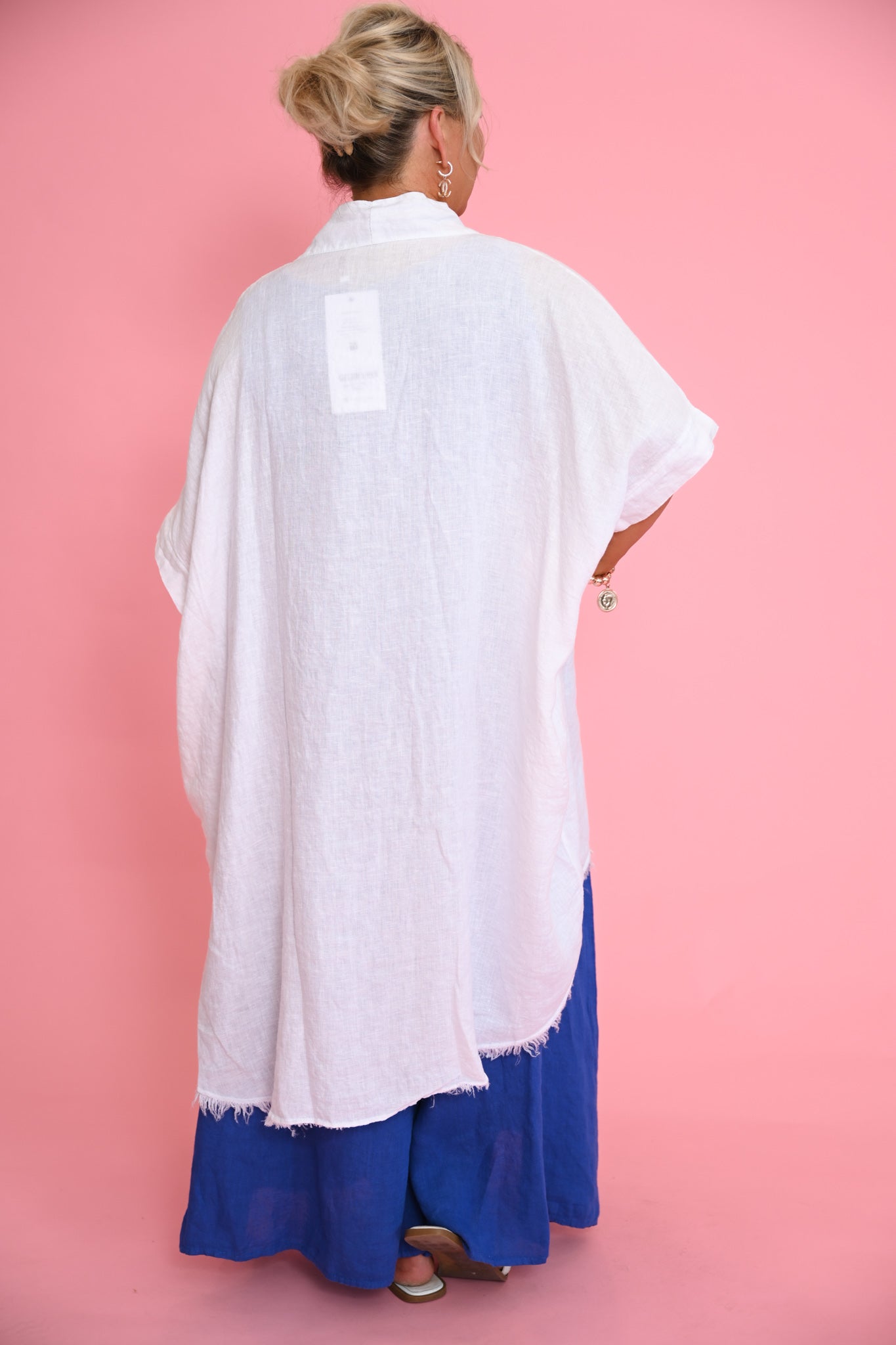 The Isabella Top in crisp white is a breath of fresh air—pure, effortless, and timeless. Crafted from 100% Italian linen, this longline jacket-inspired piece flows gracefully to mid-calf at the back, offering a relaxed yet refined silhouette that moves with ease.