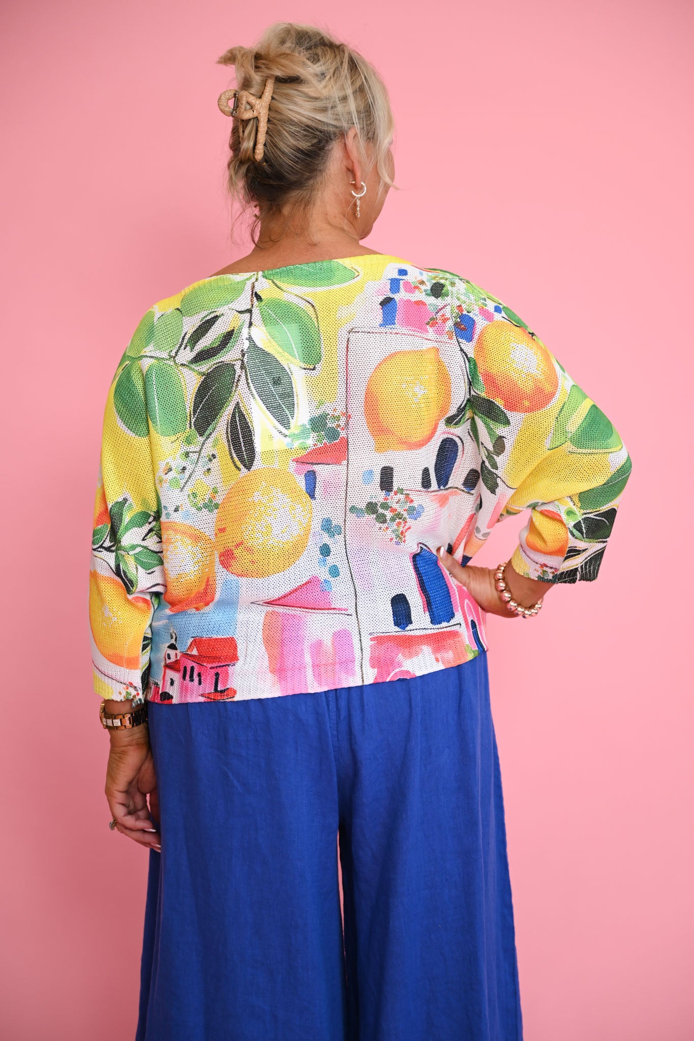 Meet the Italy Knit, a lively, colourful piece inspired by the charm and energy of the Mediterranean. Bursts of vibrant hues create a sun-kissed backdrop, adorned with artistic scenes of quaint buildings and abundant fruit. Soft flickers of gold weave through the design, giving the entire knit a gentle shimmer reminiscent of warm Italian evenings.