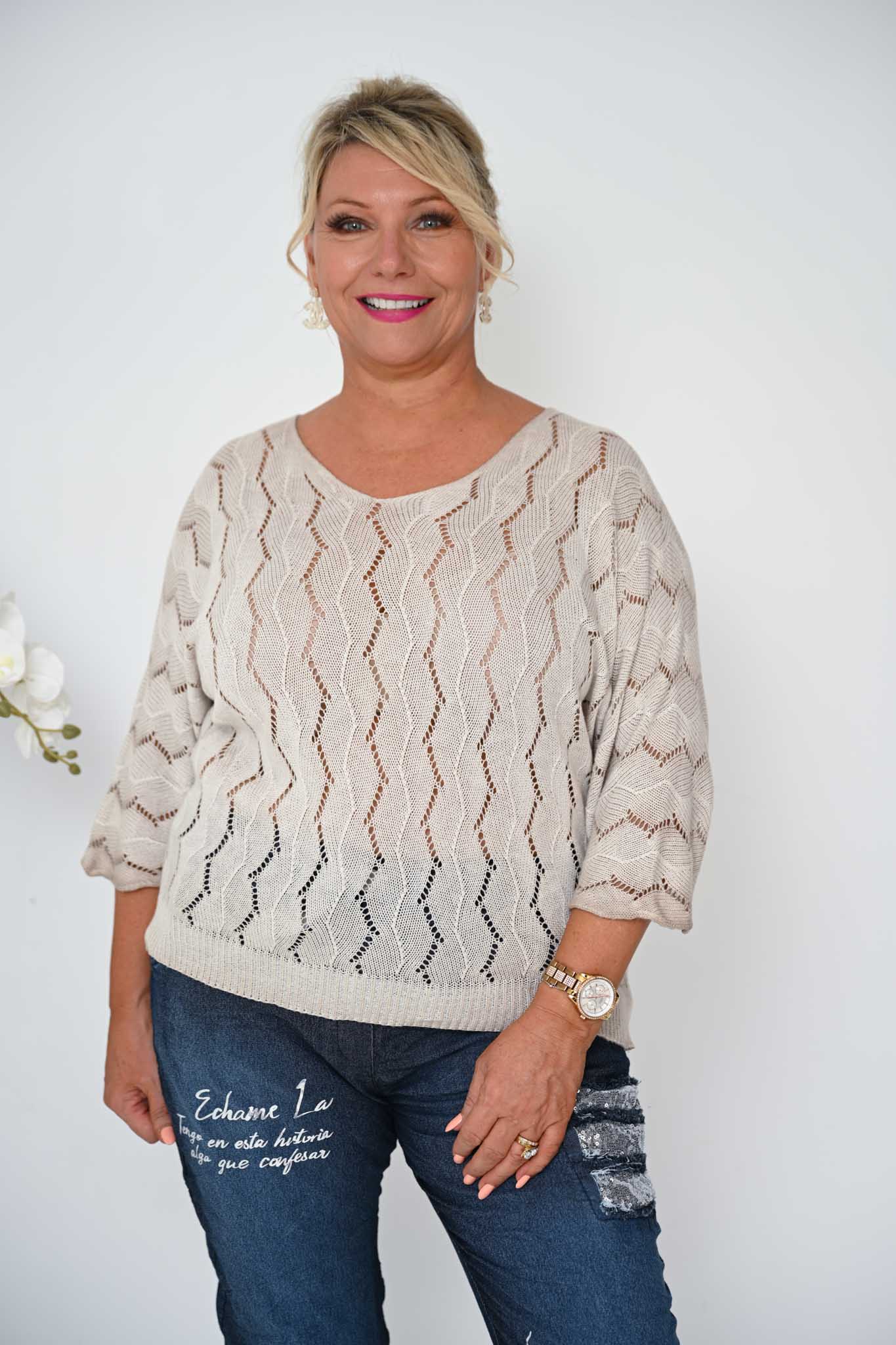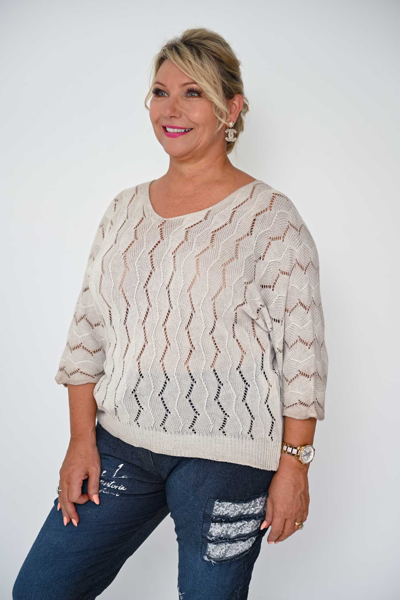 Lightweight yet cozy, the top is perfect layered over tailored trousers, denim, or skirts. With its gentle drape, unique stitch pattern, and understated elegance, the Janice Top in beige is a versatile piece that blends comfort with quiet sophistication.