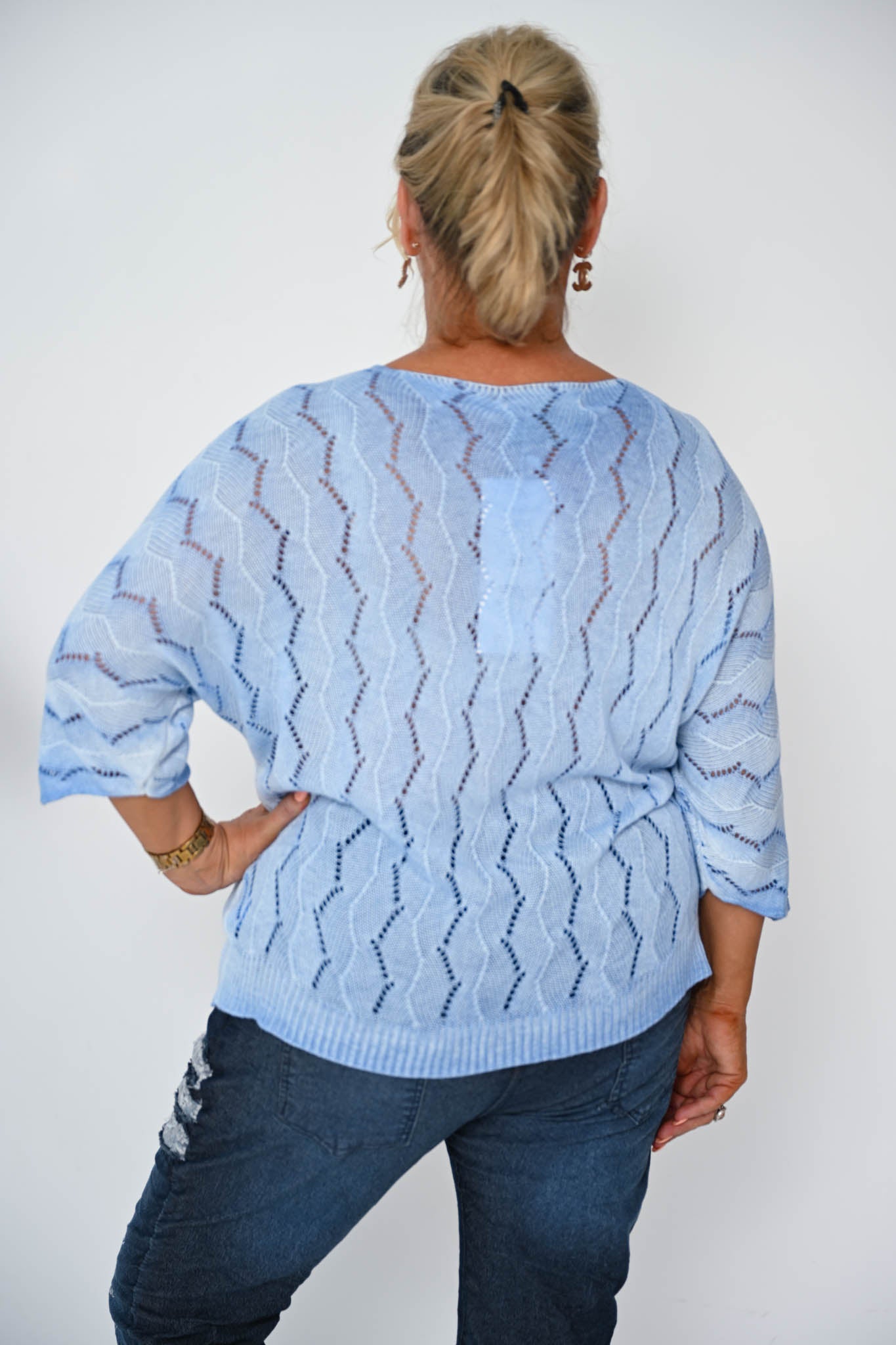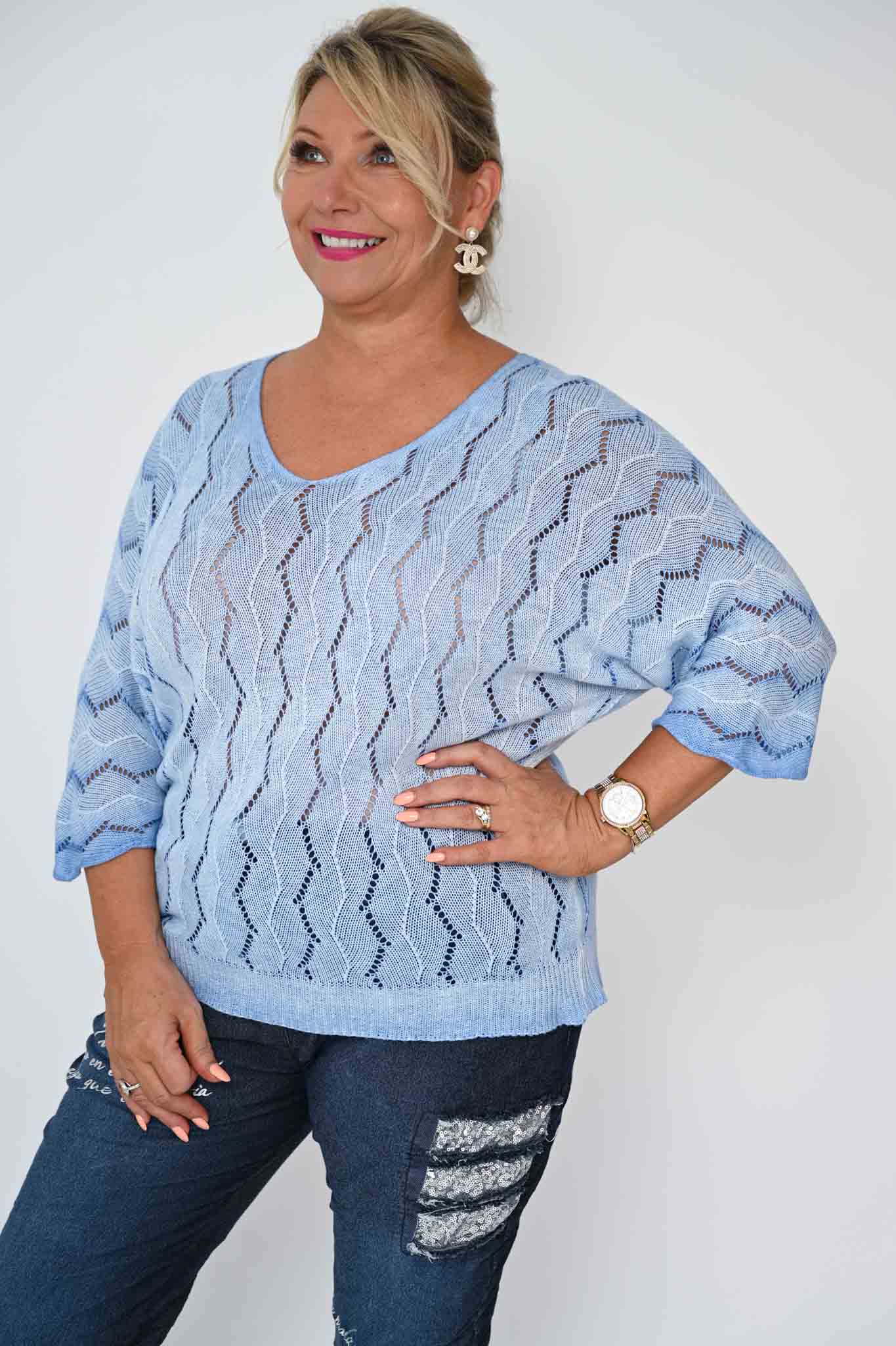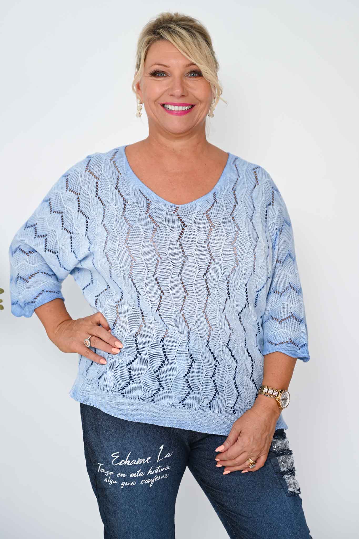The Janice Top in soft blue is a knit that balances relaxed comfort with understated elegance. Its gentle V-neckline and 3/4-length batwing sleeves create a breezy, flowing silhouette that moves gracefully with the body.
