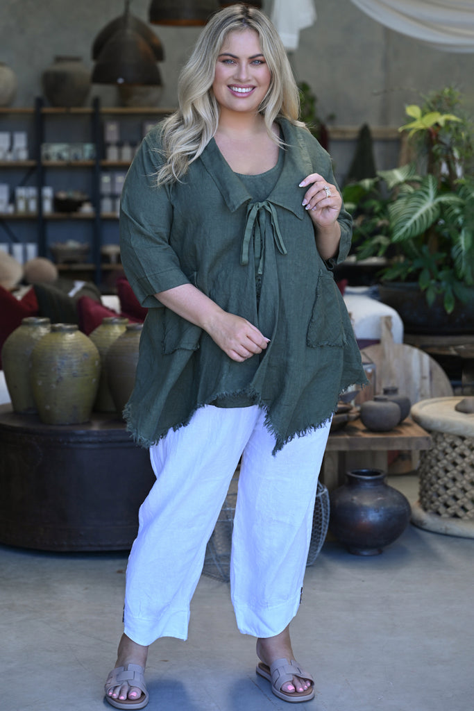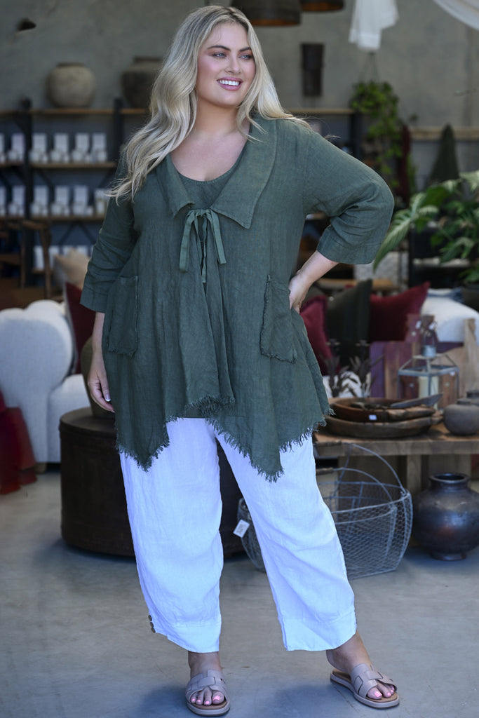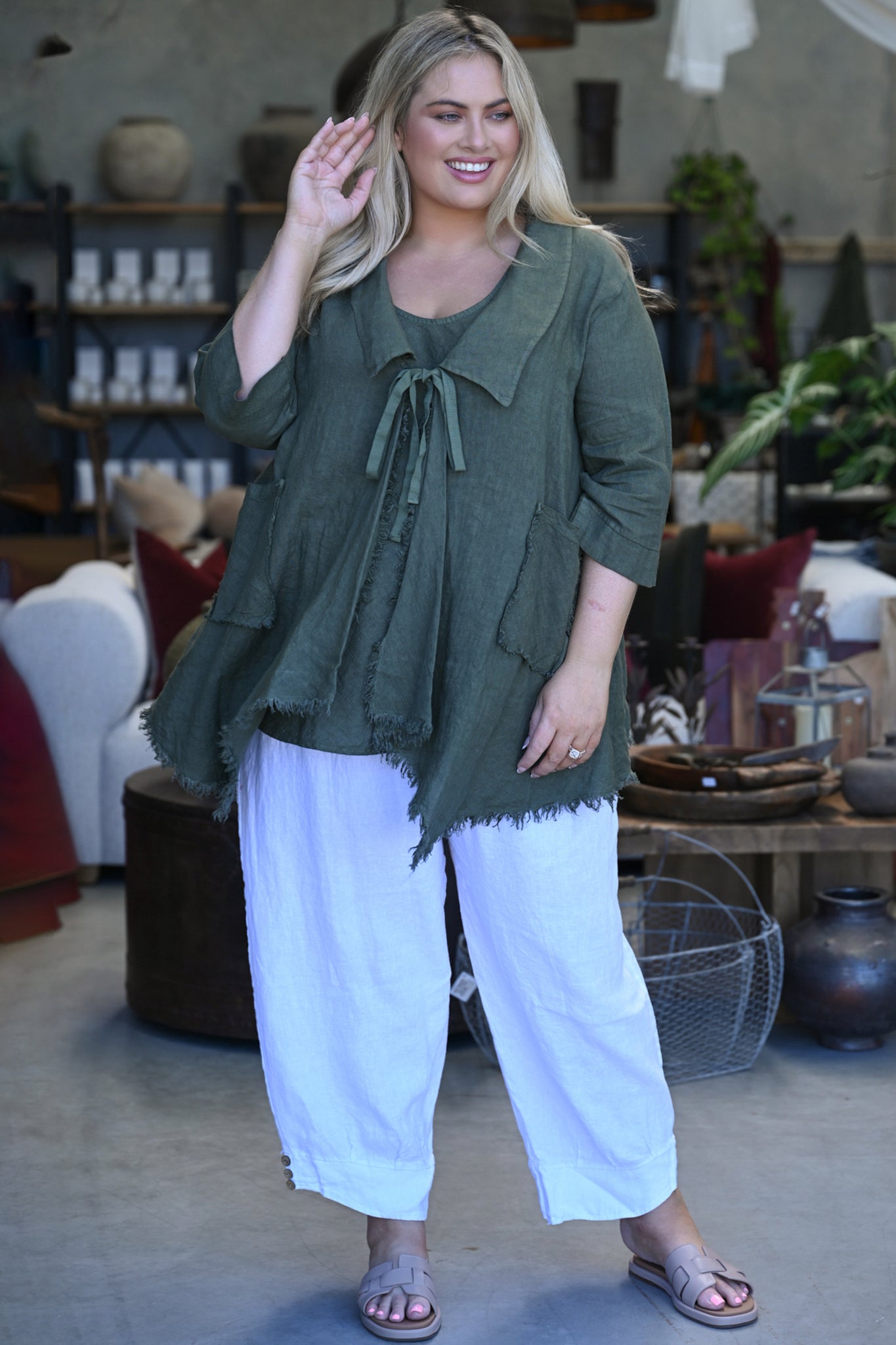 The Jaylo Jacket in Khaki is a standout layering piece that blends relaxed elegance with unique details. Crafted from breathable linen, it features an oversized sailor-style collar that gracefully ends in a ribboned bow, adding a touch of femininity and charm.