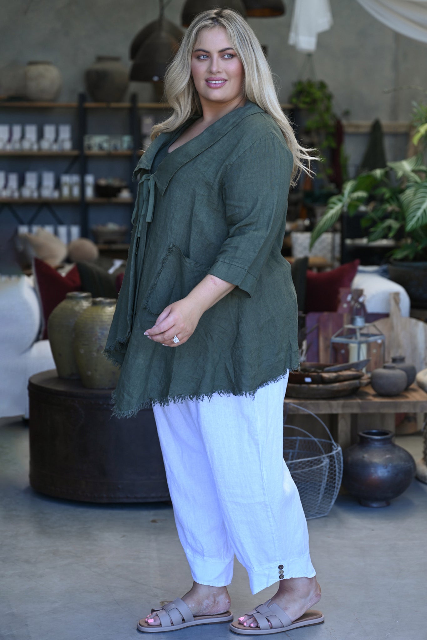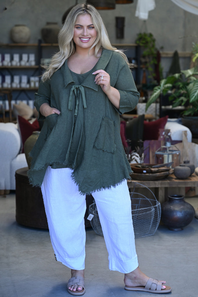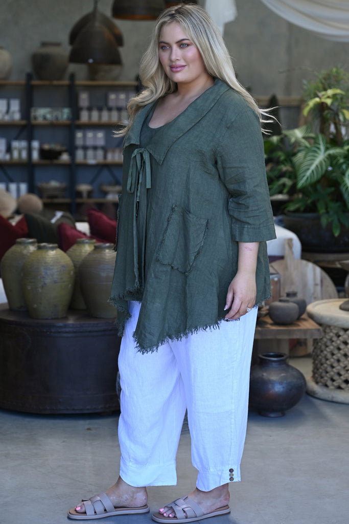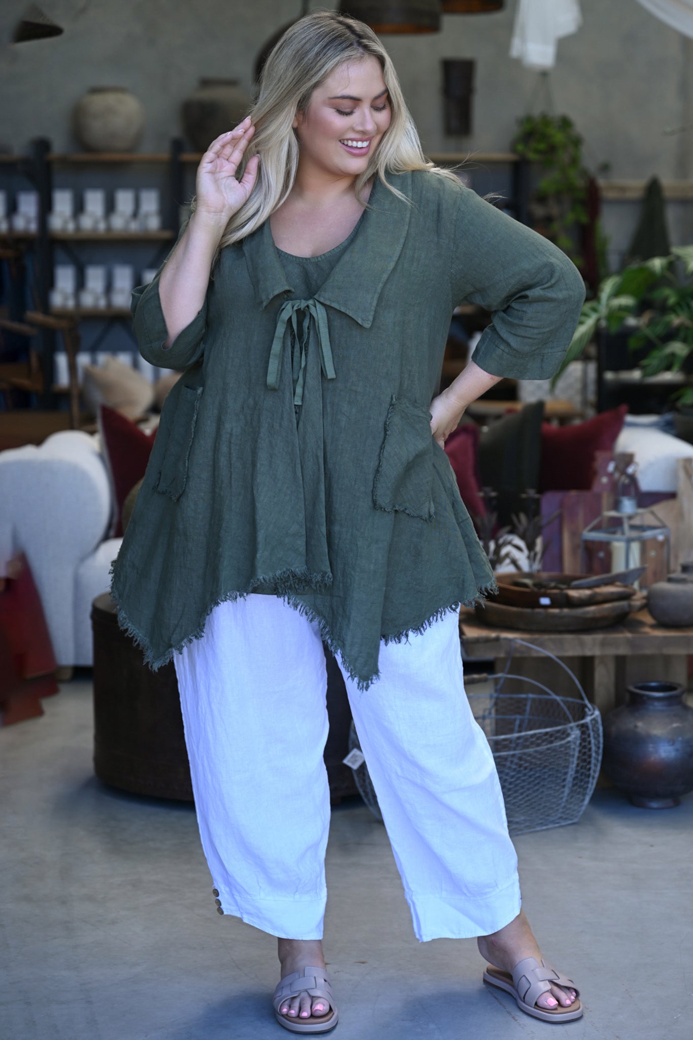 The Jaylo Jacket in Khaki is a standout layering piece that blends relaxed elegance with unique details. Crafted from breathable linen, it features an oversized sailor-style collar that gracefully ends in a ribboned bow, adding a touch of femininity and charm.