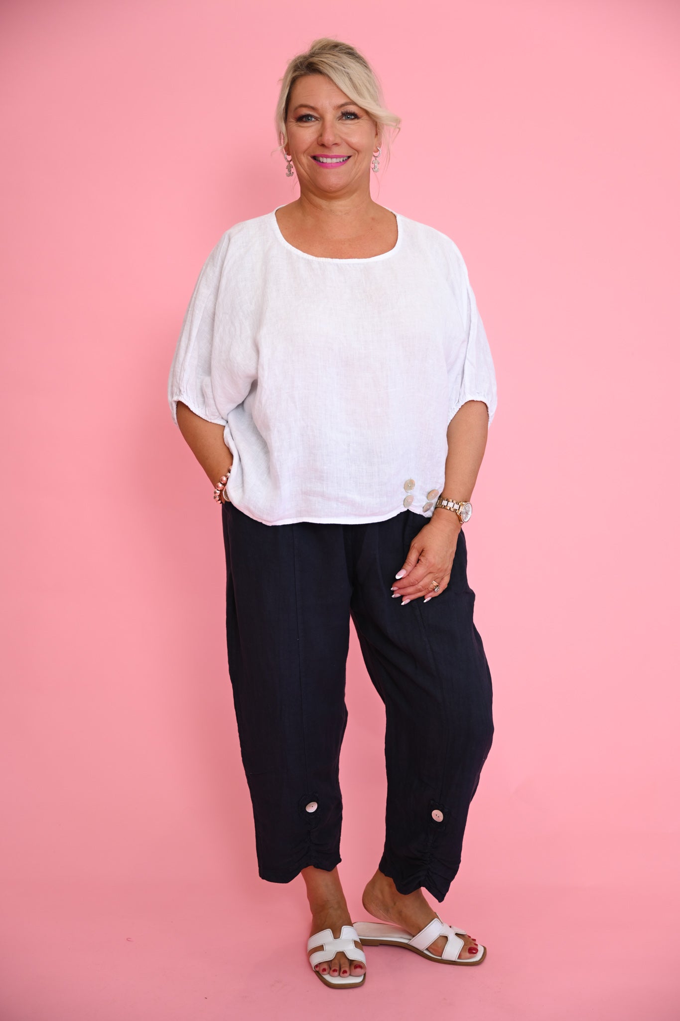 Designed with a wide, boxy silhouette, the Jenna Top offers an easy, contemporary fit. The round neckline keeps the style refined, while the 3/4 batwing sleeves add gentle movement and finish with elasticated cuffs for comfort and shape. Four feature buttons, placed just off-centre at the hem, introduce a subtle design detail that sets this piece apart.