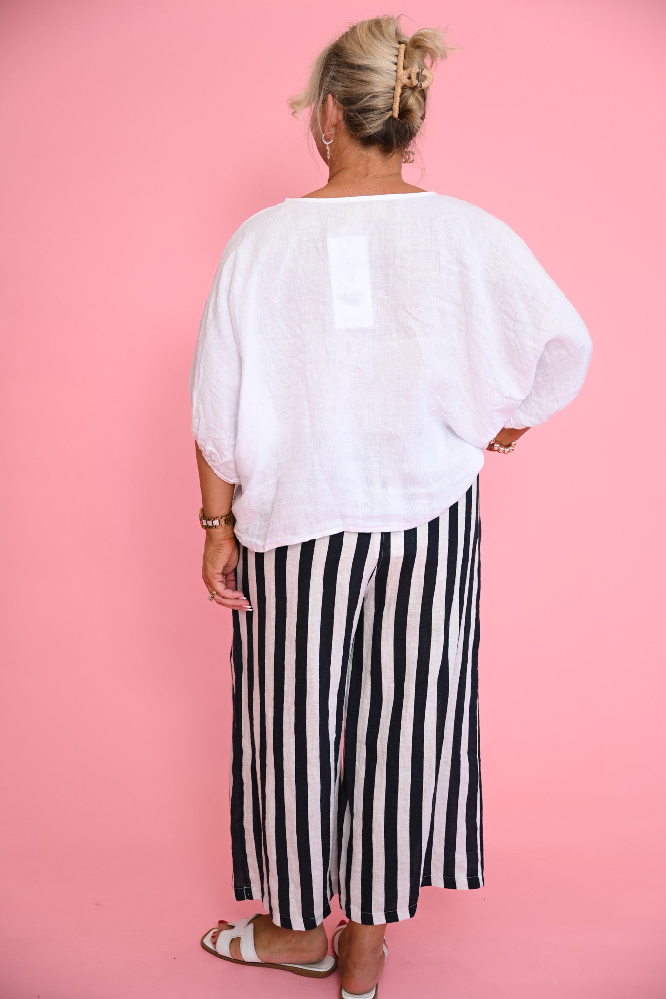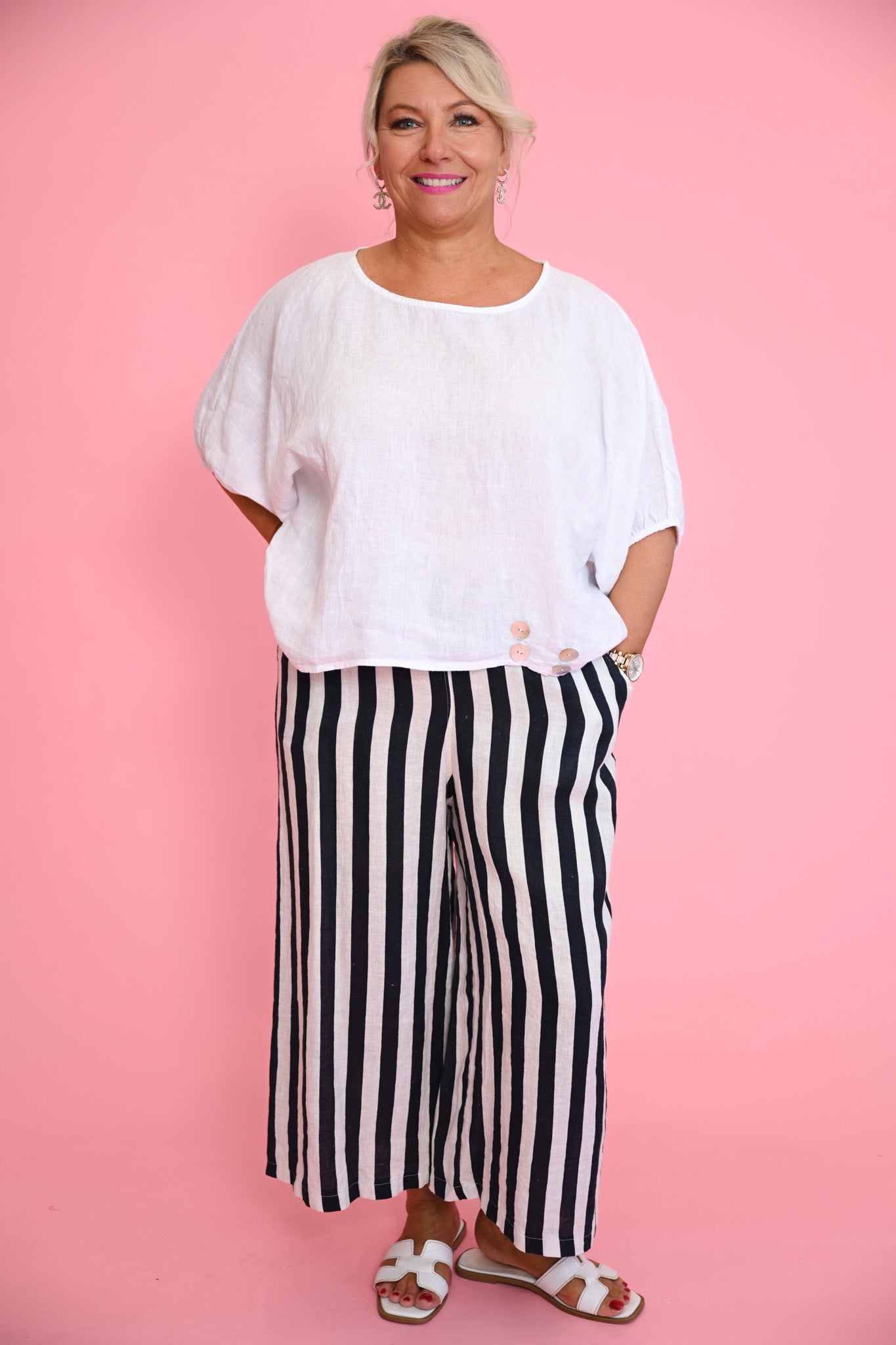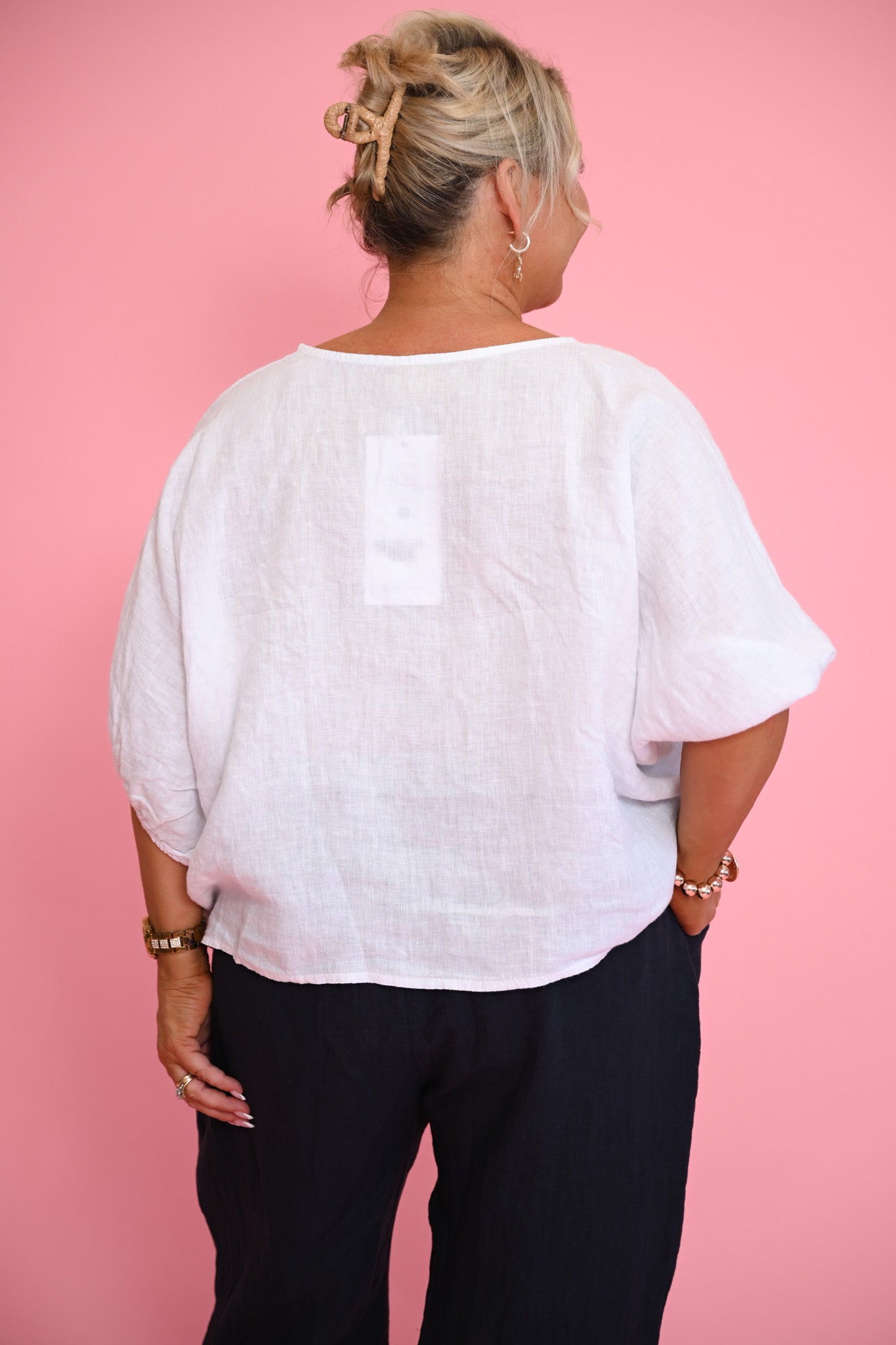 The Jenna Top is a crisp, modern essential crafted from premium Italian linen. Its clean white tone highlights the natural texture of the fabric, creating a fresh, timeless look that pairs effortlessly with everything from relaxed pants to tailored skirts.