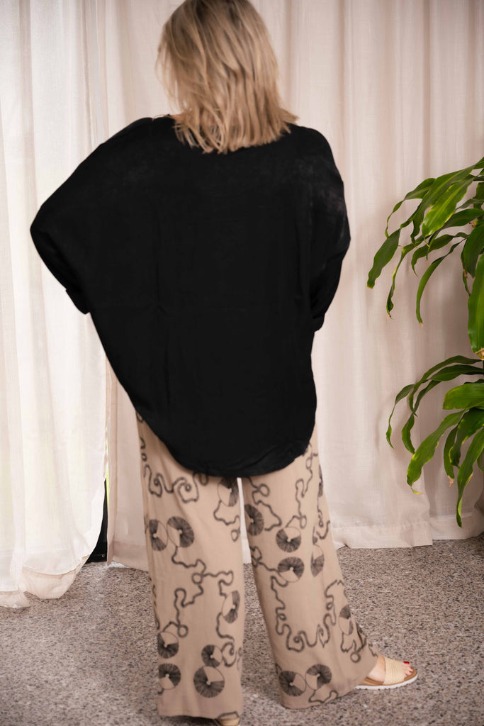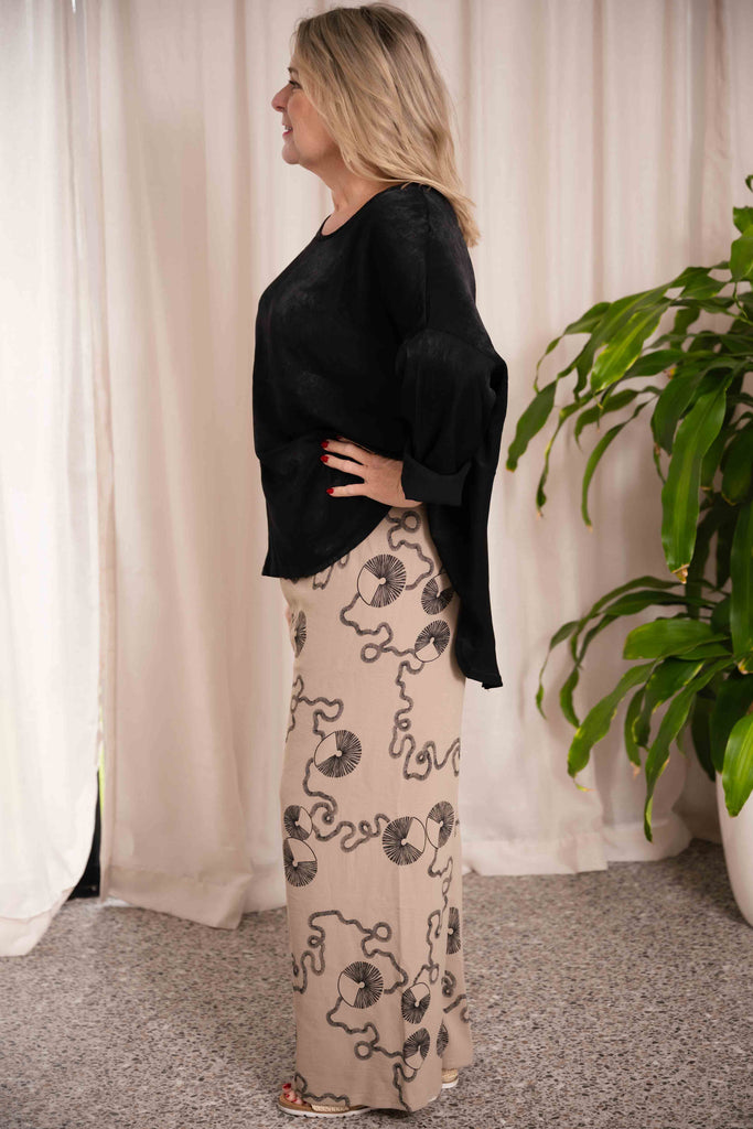 The Joan pants combine relaxed comfort with subtle style. A soft all-over pattern adds quiet interest, while the lightweight fabric drapes gently for easy wear. The elasticated waistband ensures a comfortable fit, and minimal detailing keeps the silhouette clean and versatile. Perfect for pairing with simple tops or knitwear, these pants offer a modern, effortless look.