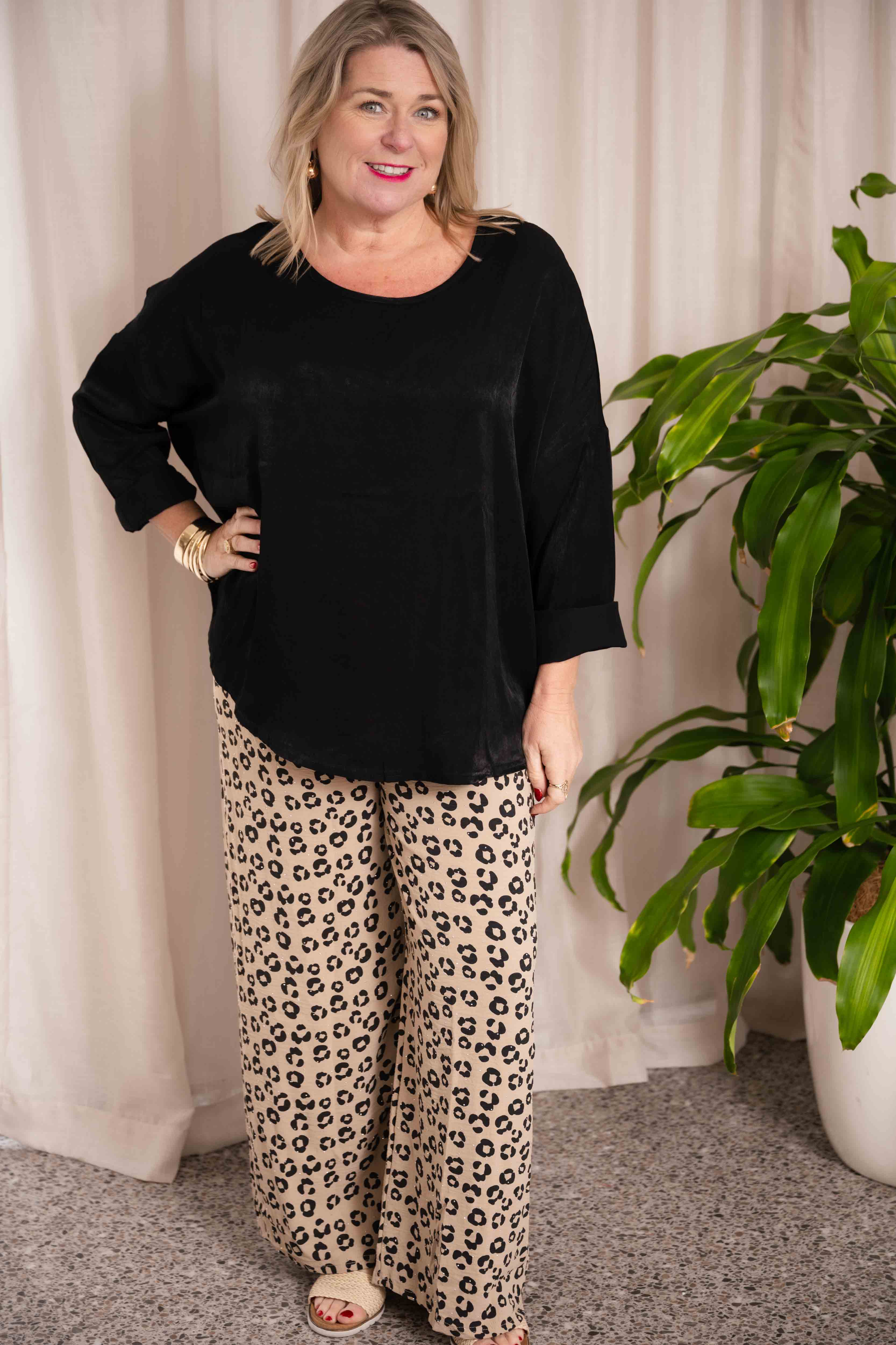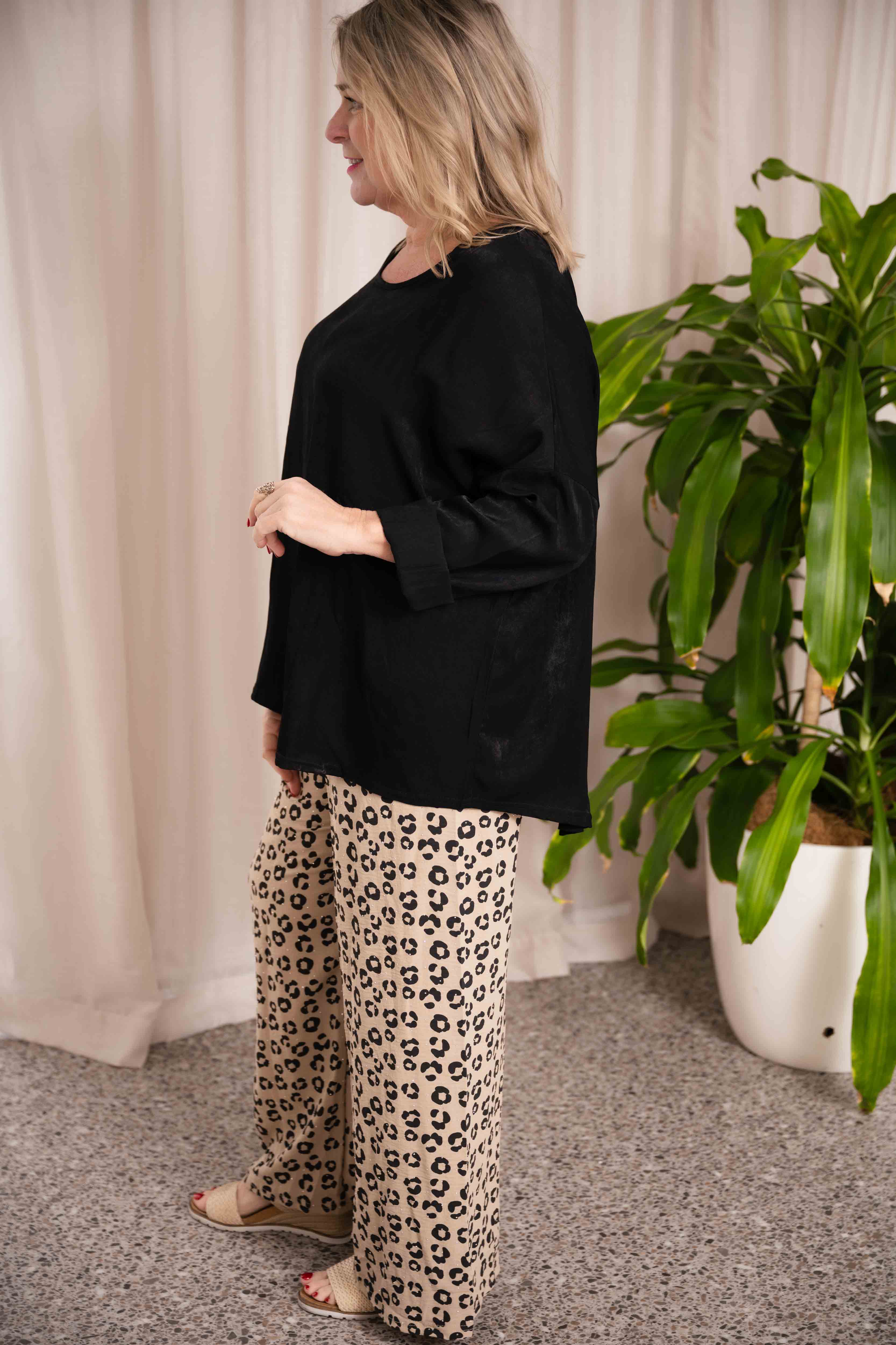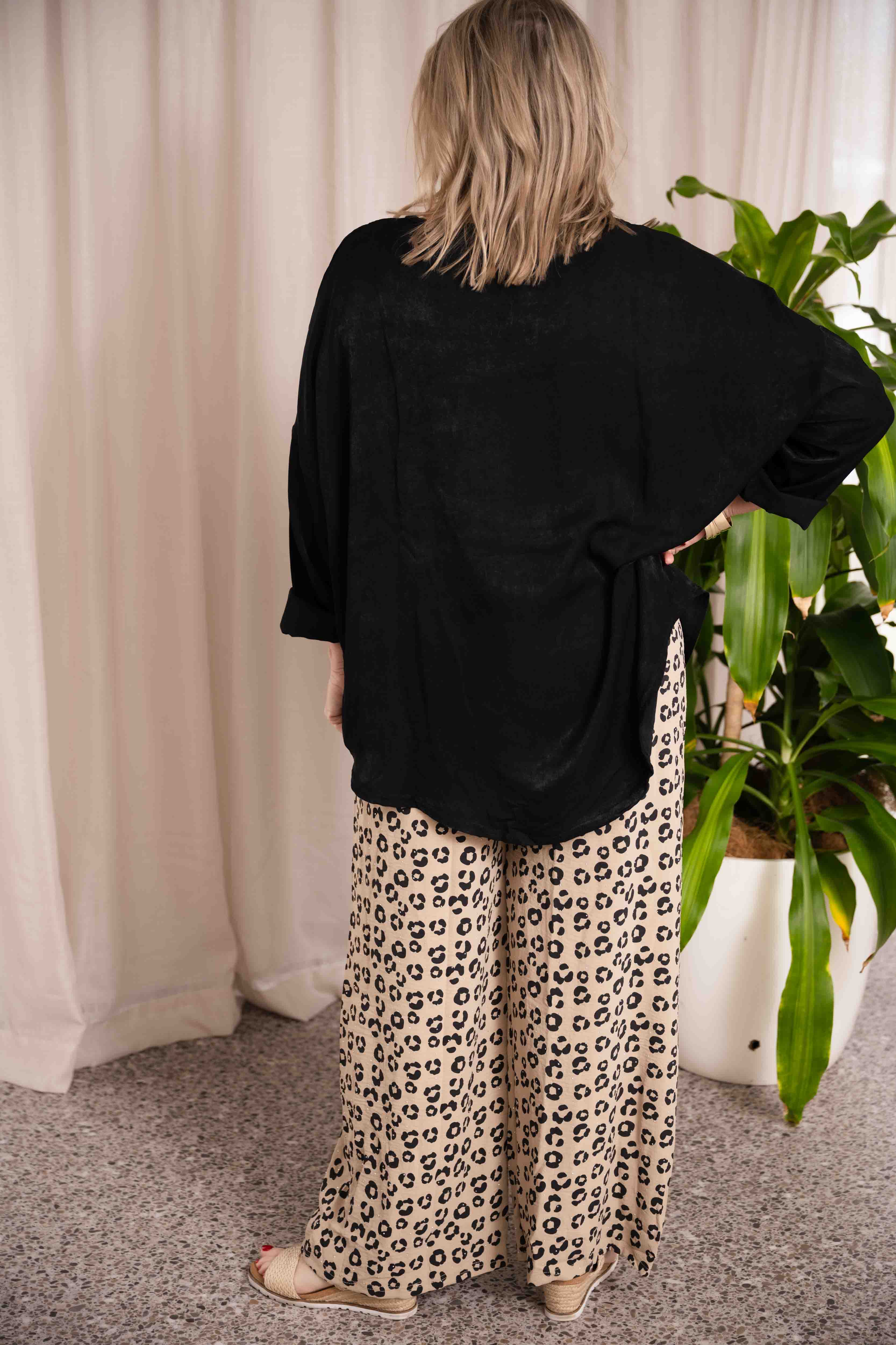 The Joan pants bring a sense of relaxed sophistication to everyday dressing. Crafted with a subtle all-over pattern, they balance simplicity with quiet detail. The lightweight fabric offers a soft, fluid drape, while the elasticated waistband provides comfort and ease of wear. Finished with minimal detailing for a clean silhouette, these versatile pants pair effortlessly with plain tops or knitwear for a modern, understated look.