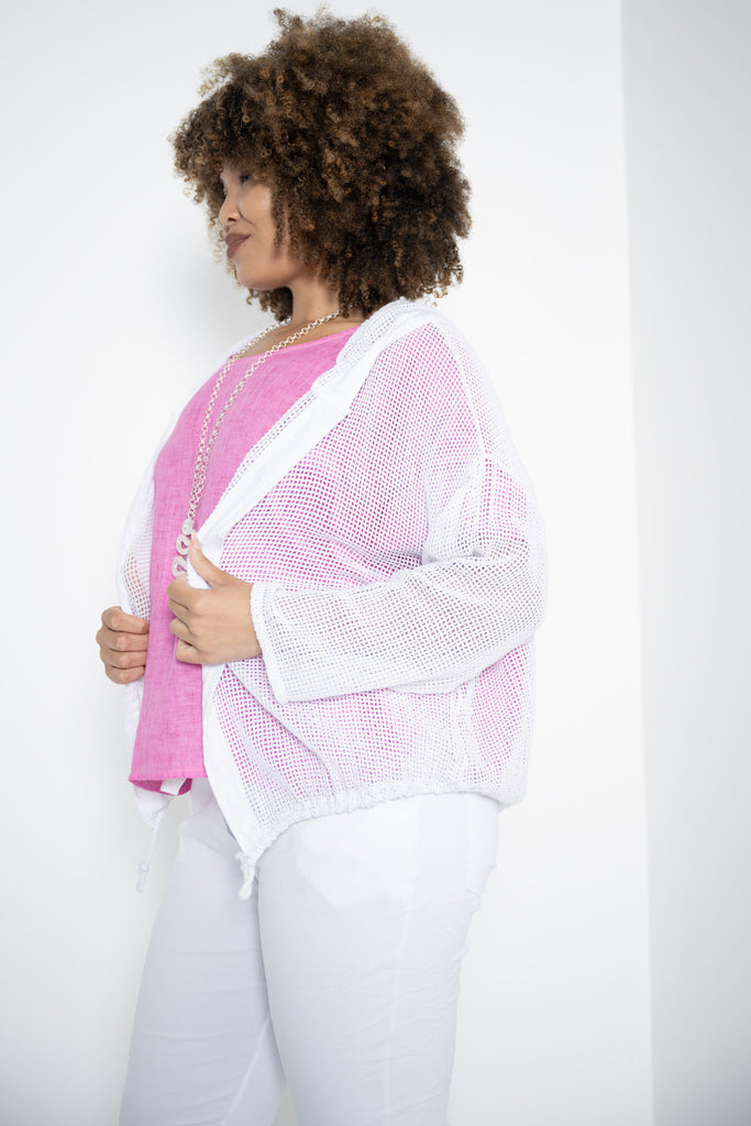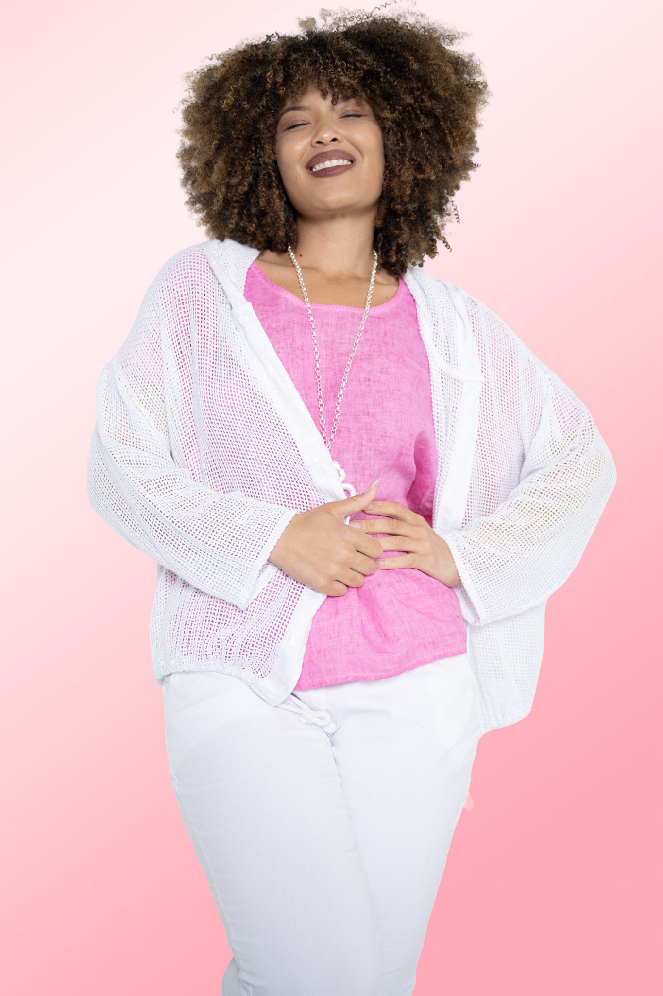Add an easy, coastal-luxe layer to your wardrobe with the Juzzy Jacket in crisp white—a light, breezy piece that combines comfort with standout detailing. Styled here with our coordinating Linen Camio and Runaway Pants, Jess shows how effortlessly elevated this jacket looks in a fresh, tonal palette.