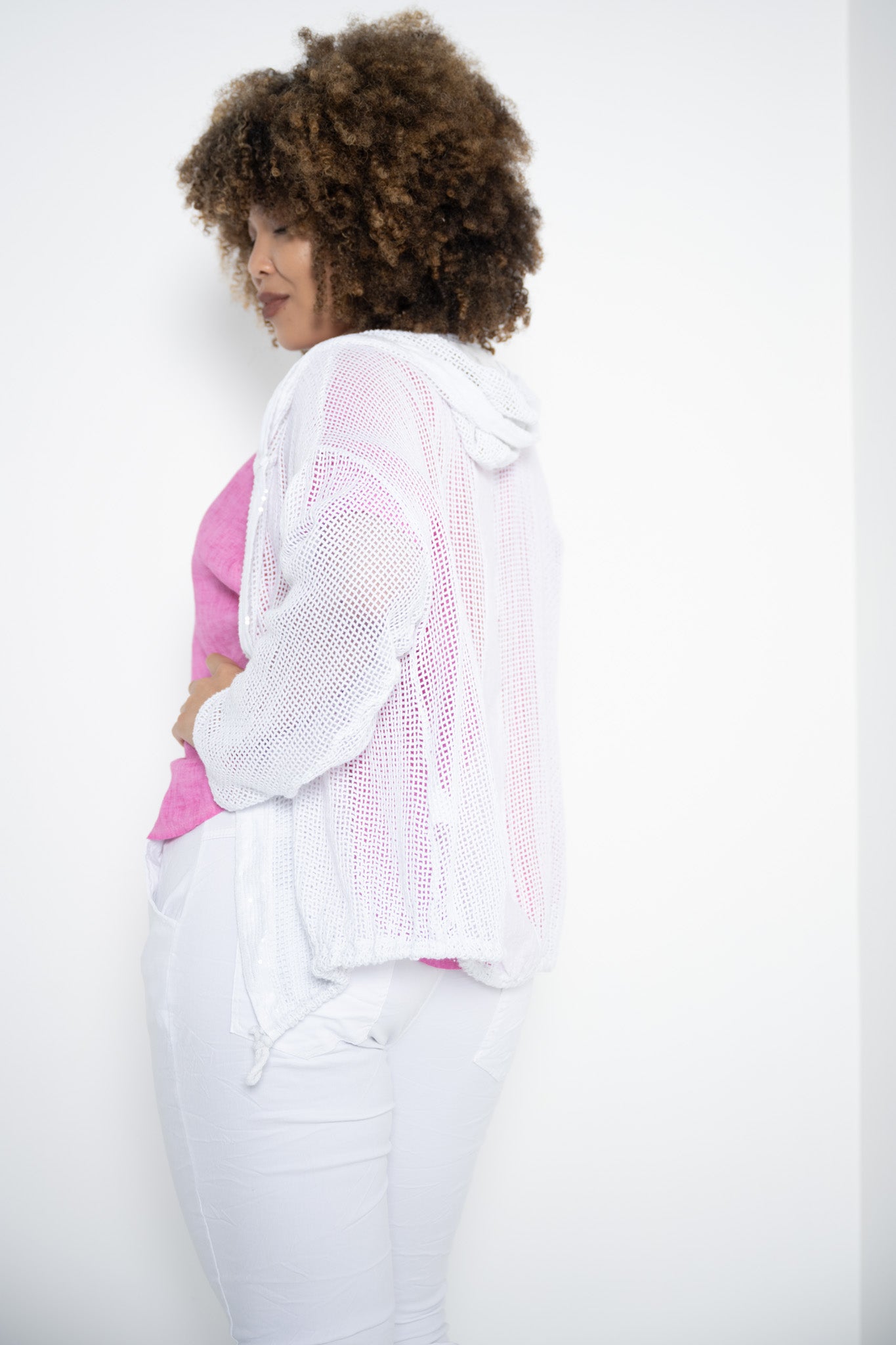 Made from high-quality cotton, its breathable weave offers a soft touch and a relaxed fit that only gets better with wear. A hint of shimmer comes through in the subtle sequin accents—tracing the open front and forming a bold, statement stripe along the back, catching the light just enough to turn heads without overdoing it. The open front, draped hood, and adjustable drawstring hem keep the silhouette laid-back yet refined.
