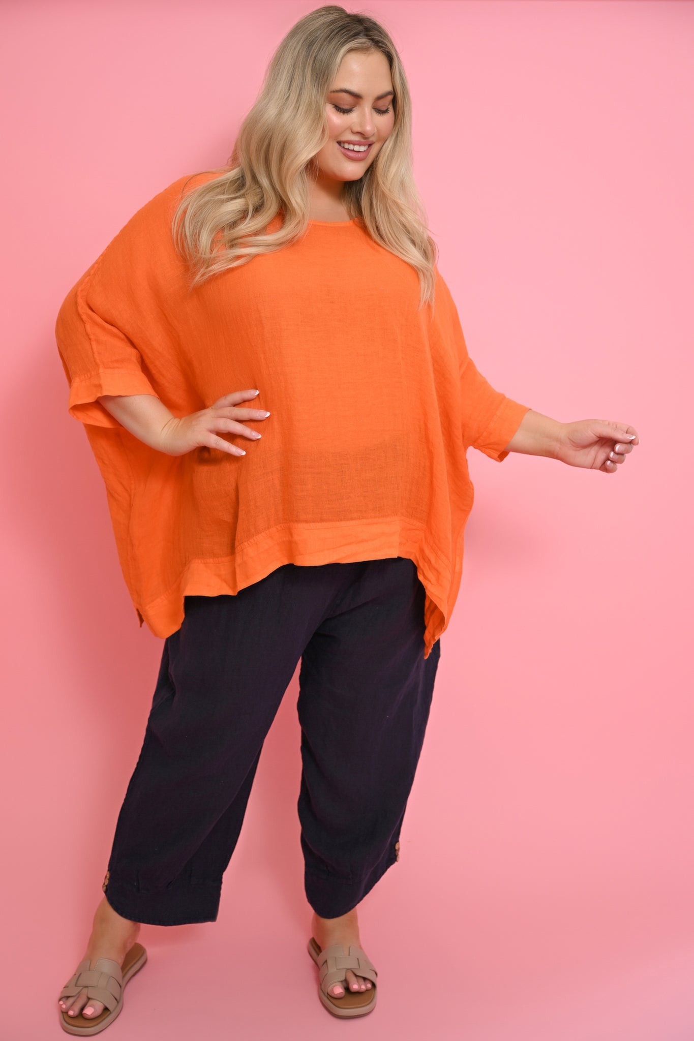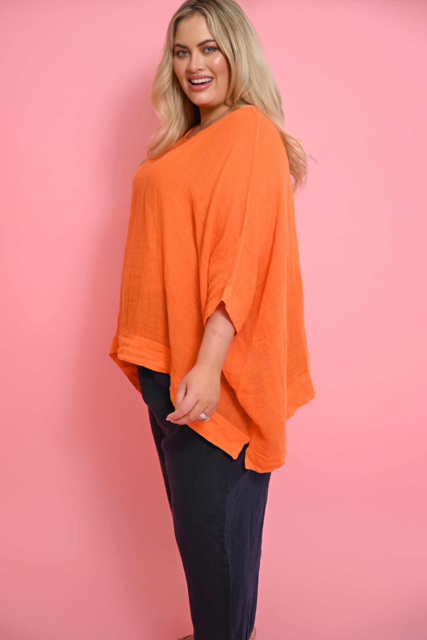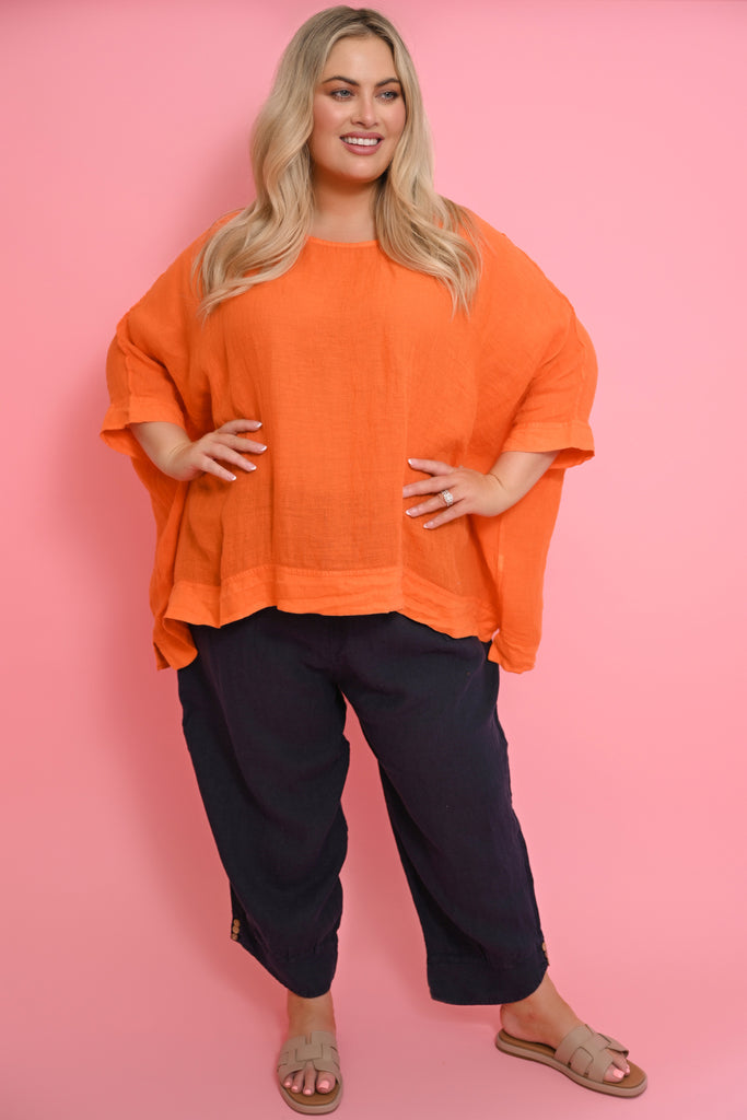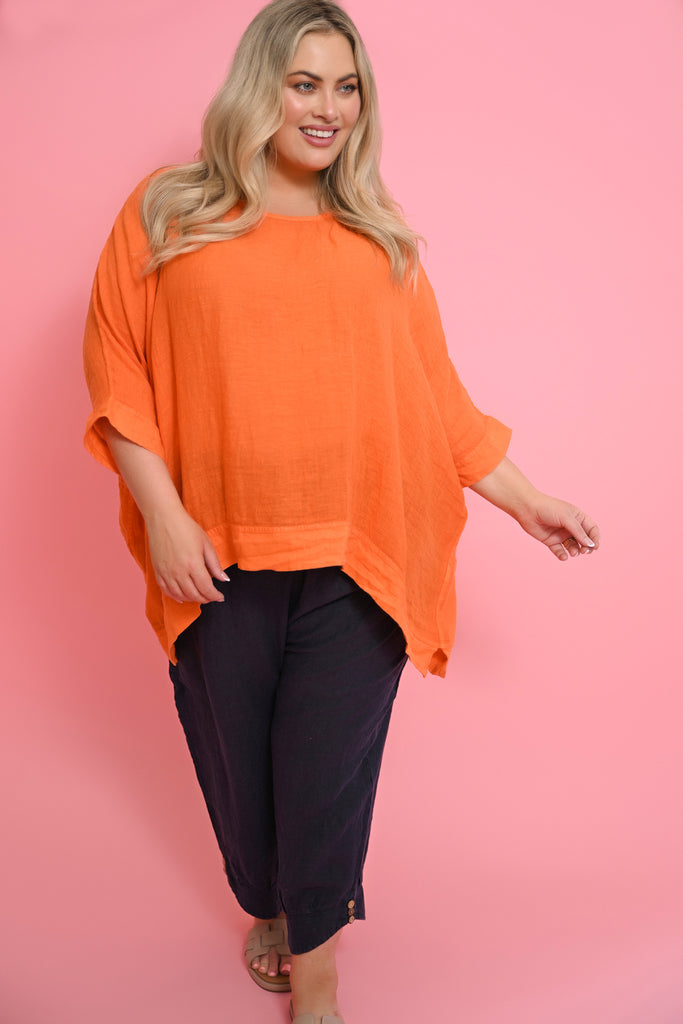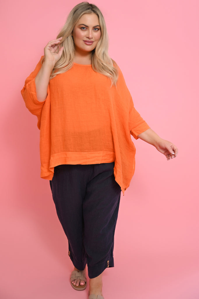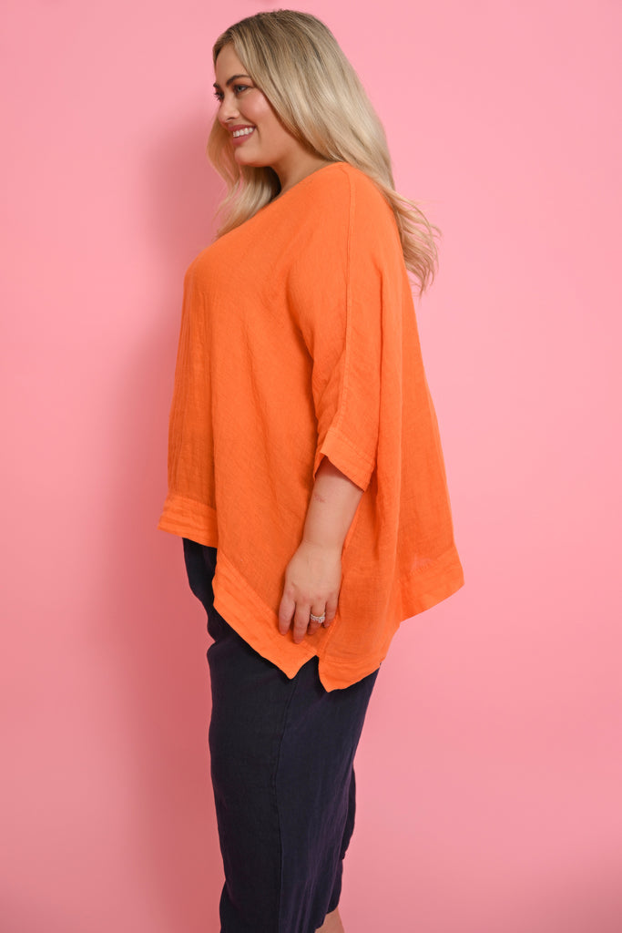 The Kaftan in Arancio radiates warmth and sunshine, bringing bold colour and effortless elegance to your summer wardrobe. Designed in a generous square cut, it drapes loosely over the body with fluid batwing sleeves that move with the breeze. The wide cuffs and hem give the piece definition and polish, striking the perfect balance between relaxed and refined.
