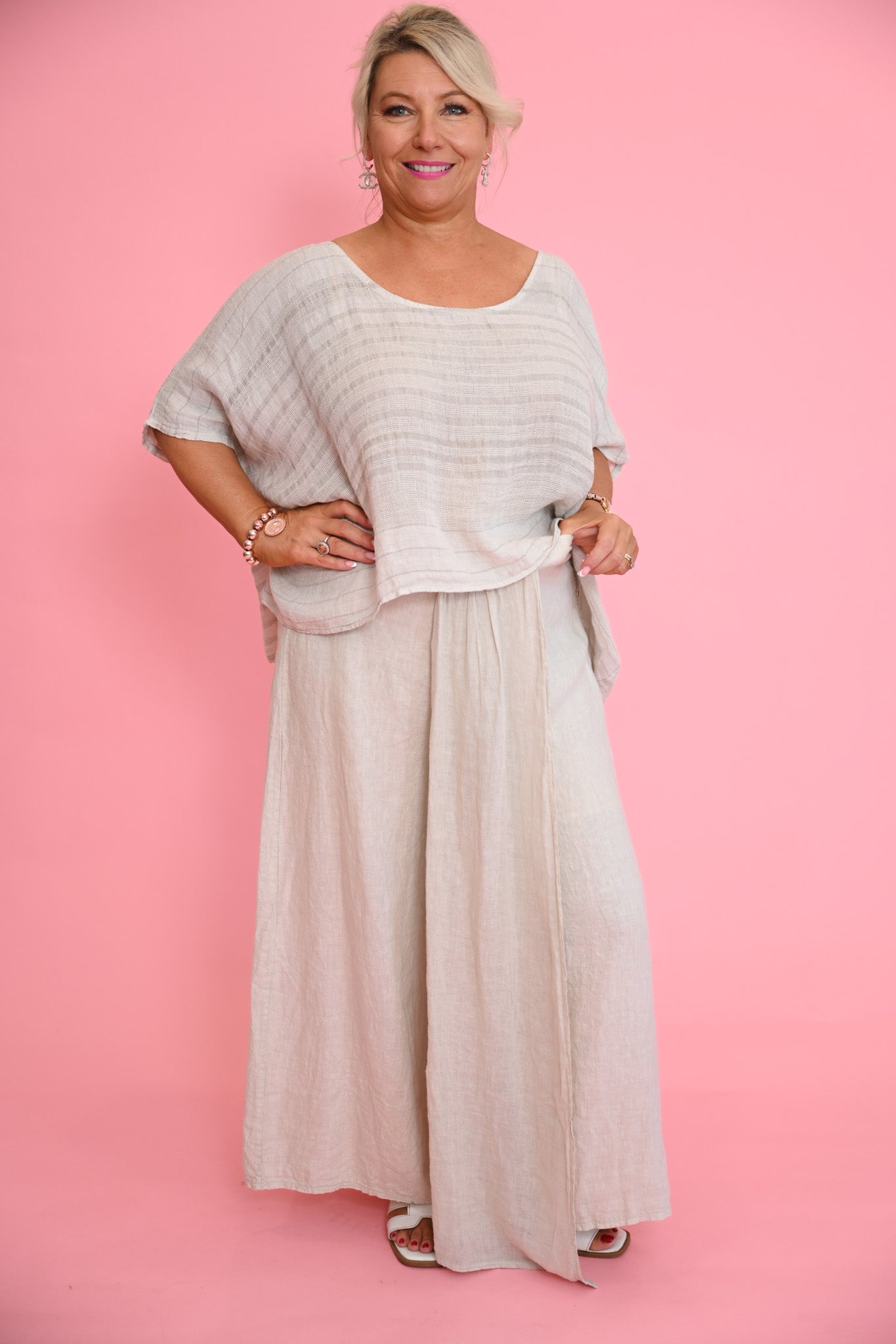 Effortlessly chic and beautifully made, the Kaftan Linen Top brings refined Italian craftsmanship to your everyday wardrobe. Made in Italy from 100% premium linen, this top offers a lightweight, breathable feel that’s perfect for warm weather and easy layering.