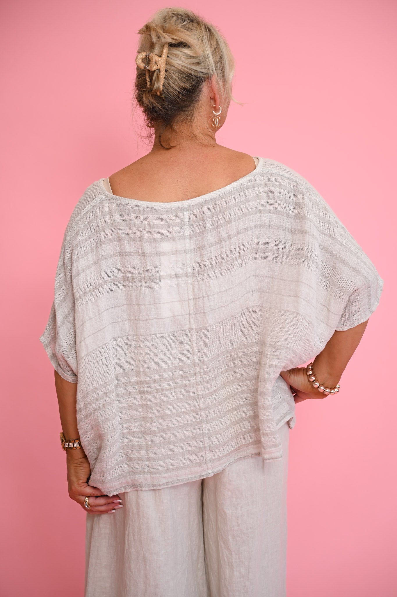 Designed with a cropped, boxy silhouette, it drapes gracefully over the shoulders to create a relaxed, elbow-length sleeve for an elegant yet laid-back look. The subtle vertical beige stripes elongate the figure, while the round neckline keeps the style timeless and versatile.
