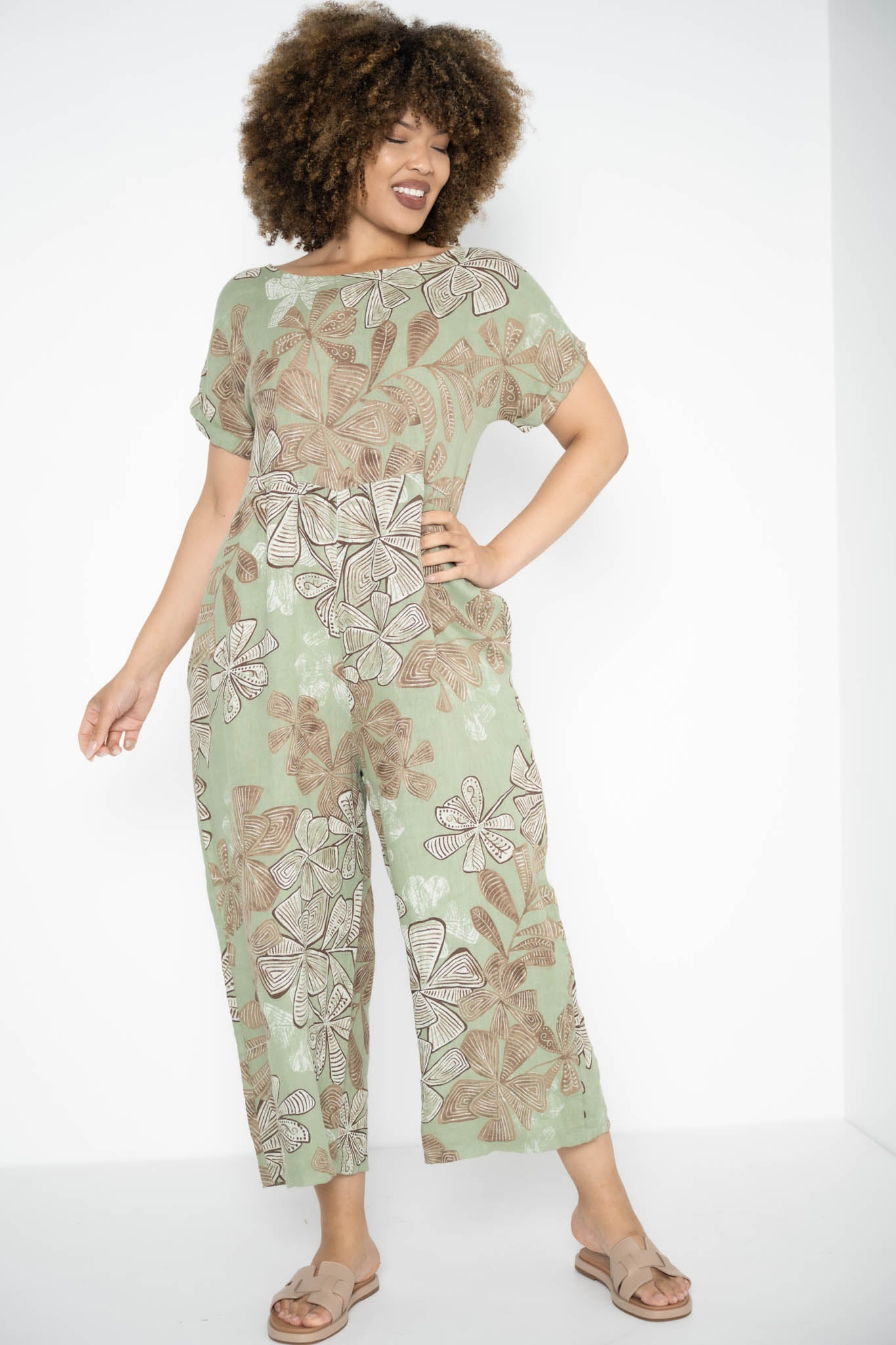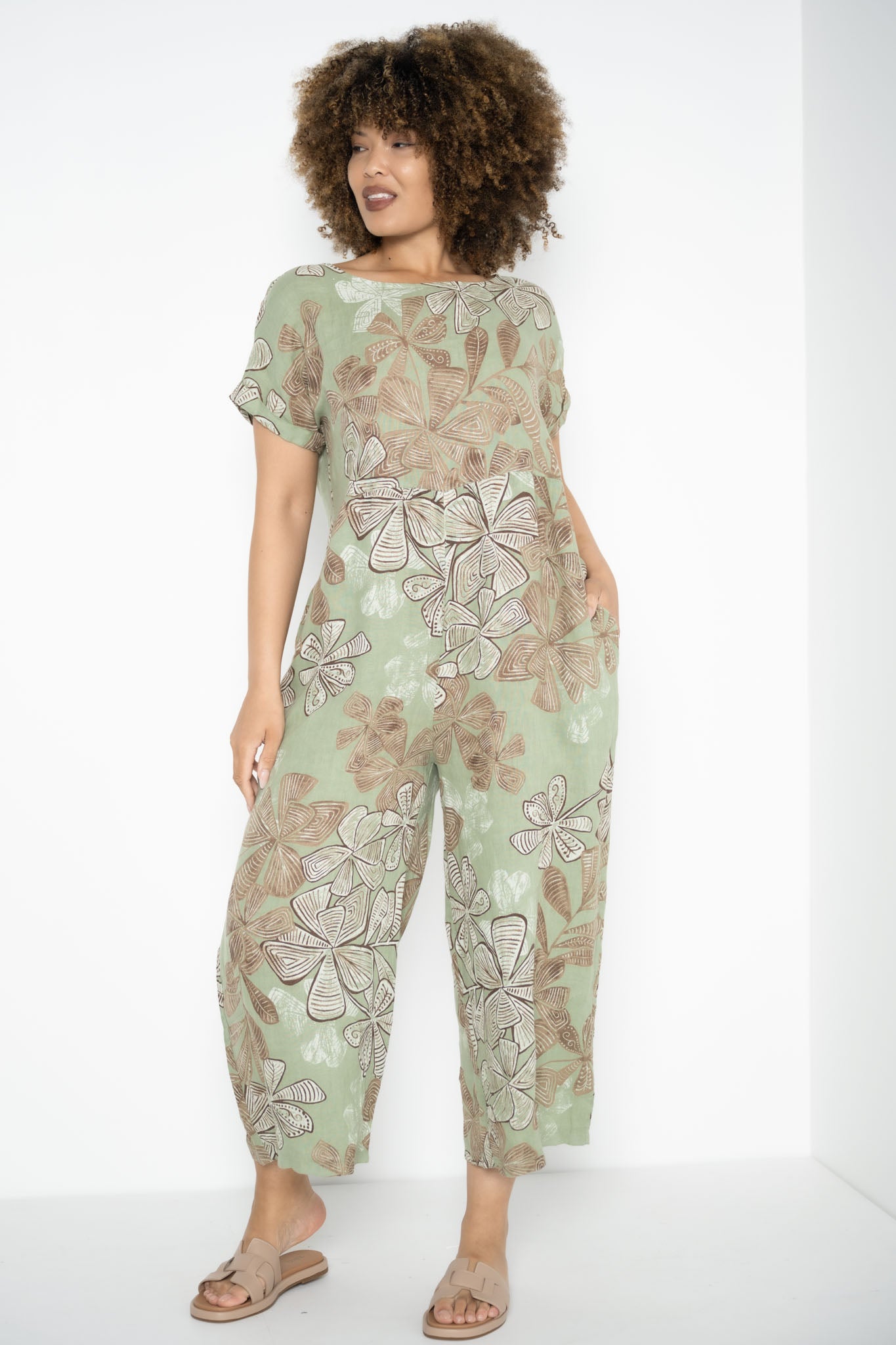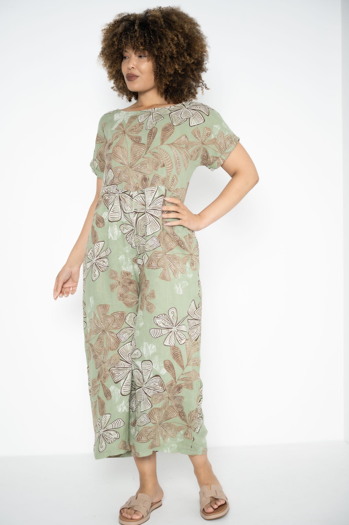 The Kiara Jumpsuit is a one-piece statement that flows with ease and intention. Designed in a rich Greenbay hue, it’s brought to life by abstract brown floral patterns that feel both earthy and expressive. The round neckline and soft, folded cap sleeves create a clean, balanced silhouette, while a subtle seam just below the bust adds gentle shape without constriction.