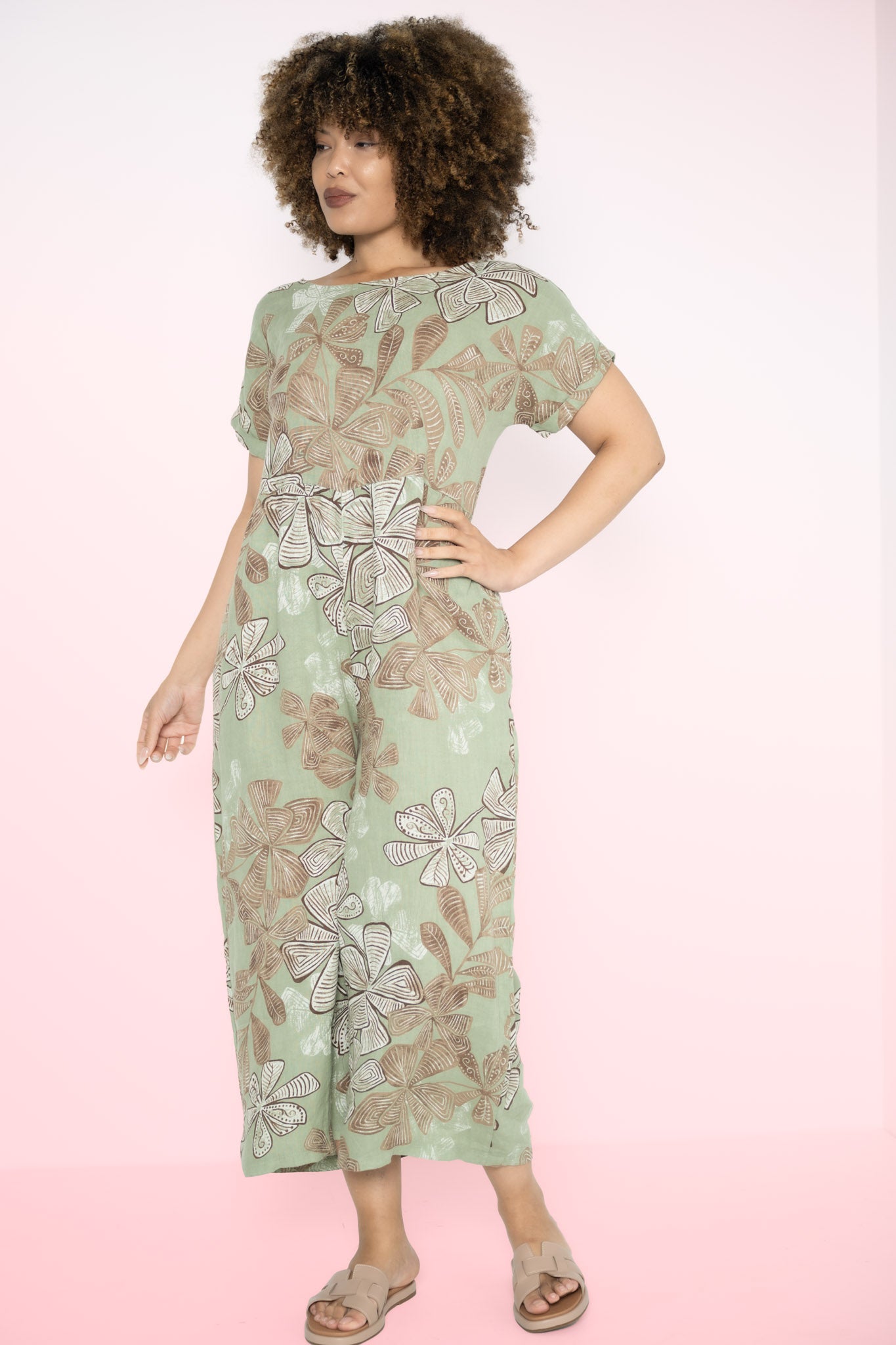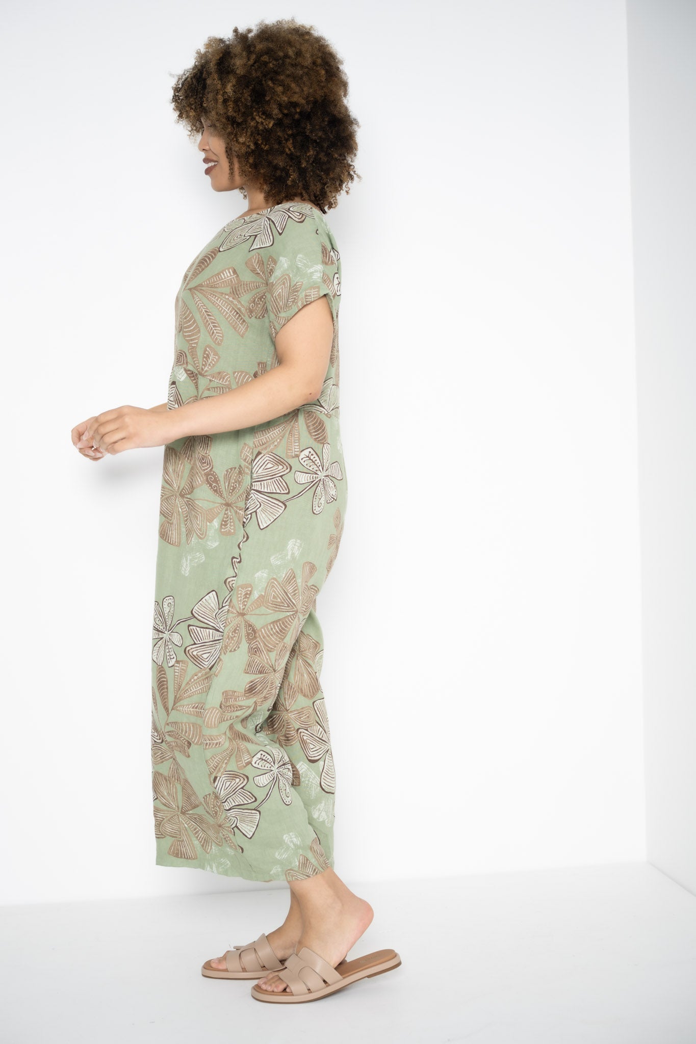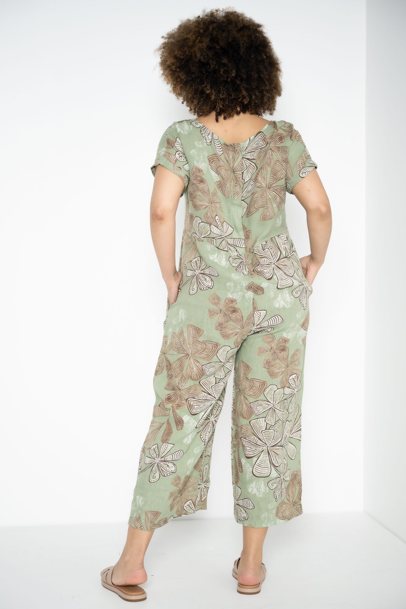 The Kiara Jumpsuit is a one-piece statement that flows with ease and intention. Designed in a rich Greenbay hue, it’s brought to life by abstract brown floral patterns that feel both earthy and expressive. The round neckline and soft, folded cap sleeves create a clean, balanced silhouette, while a subtle seam just below the bust adds gentle shape without constriction.