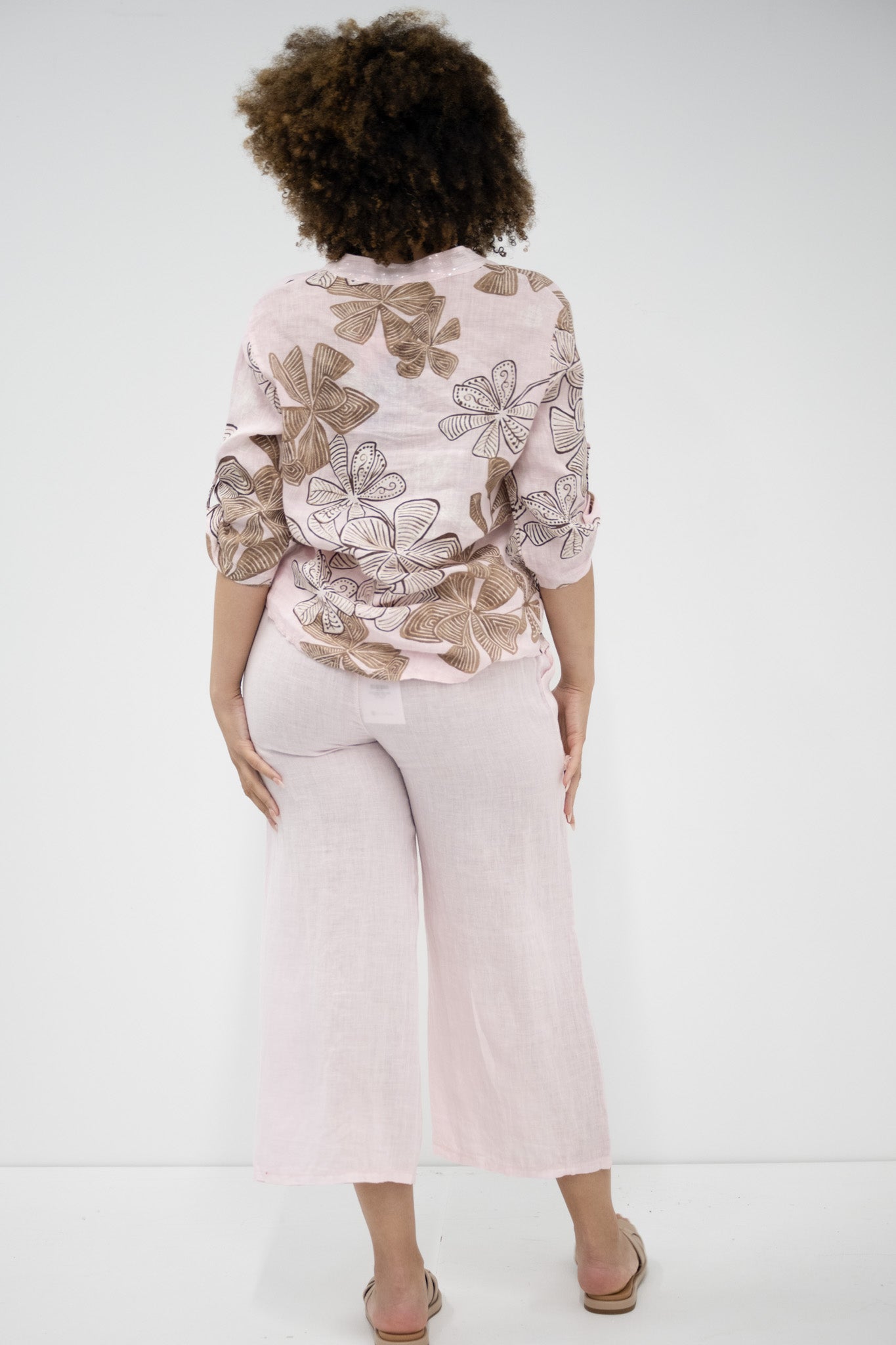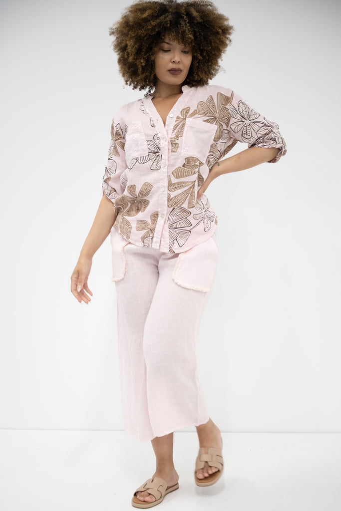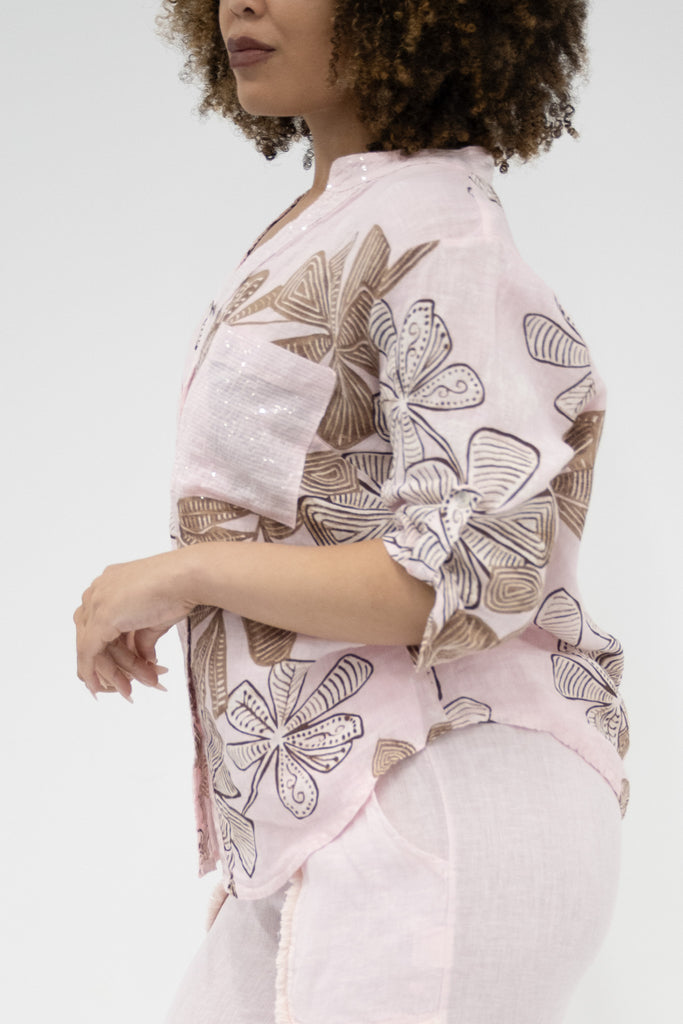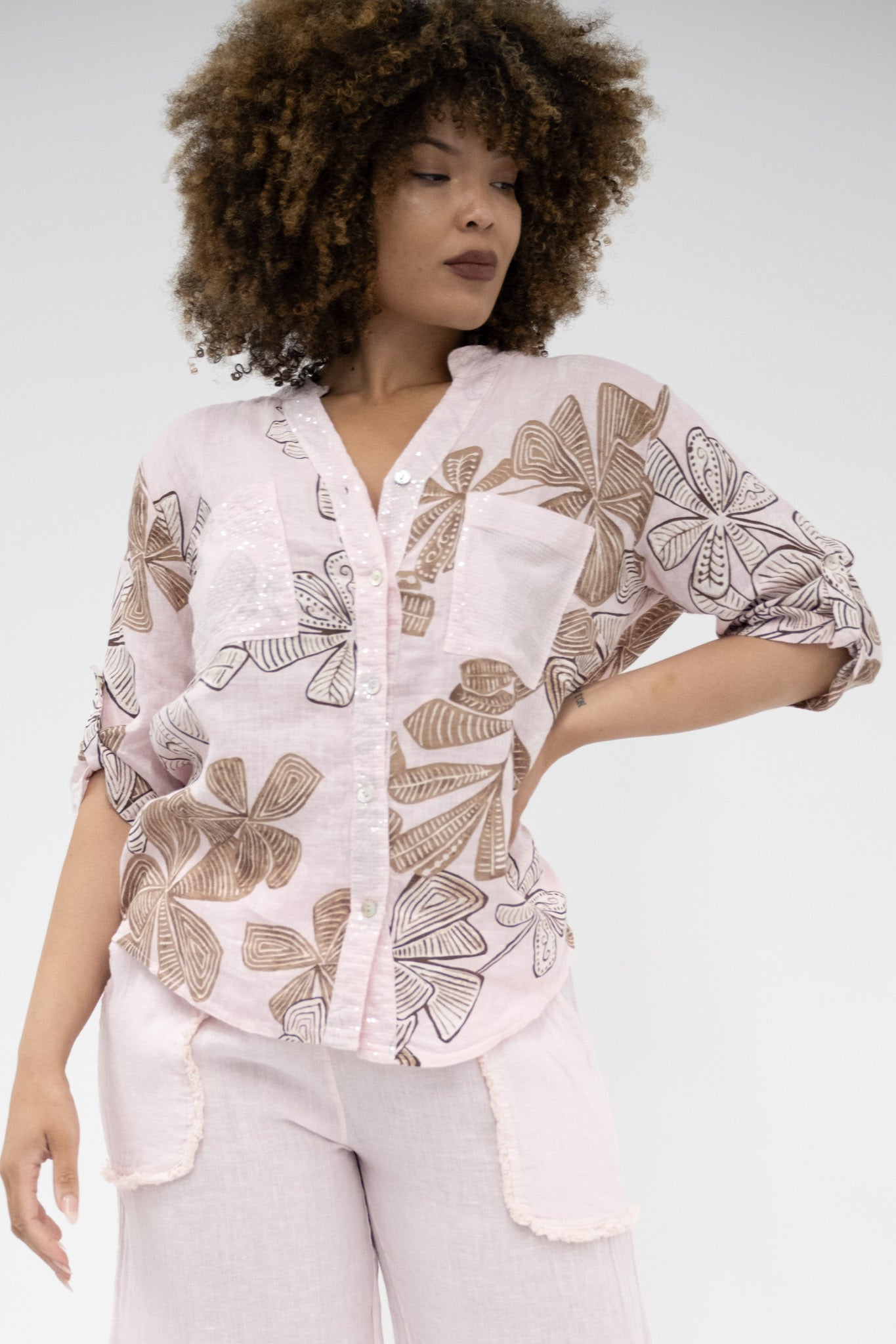 A soft take on a classic shape, the Kiara shirt features a warm pink base brought to life with abstract brown floral patterns. The folded sleeves are secured with button tabs, offering a casual, rolled-up feel that’s easy to wear and effortlessly styled.