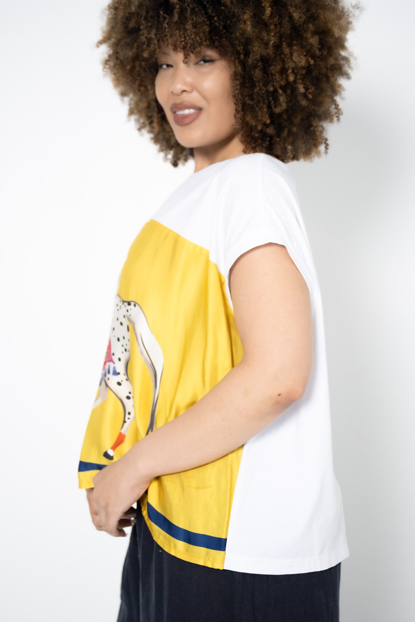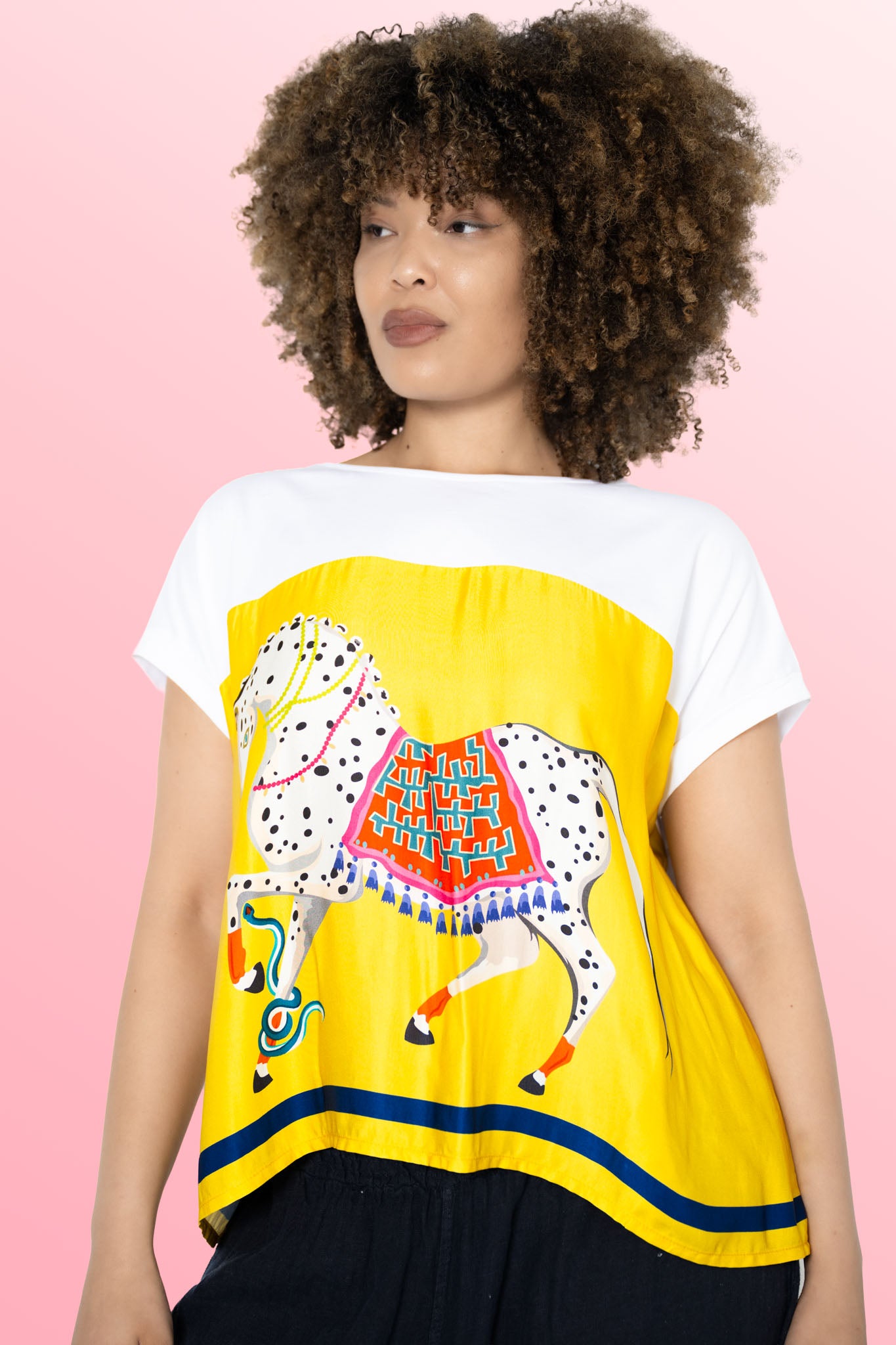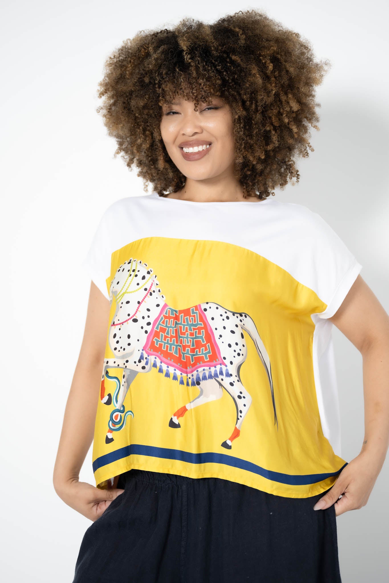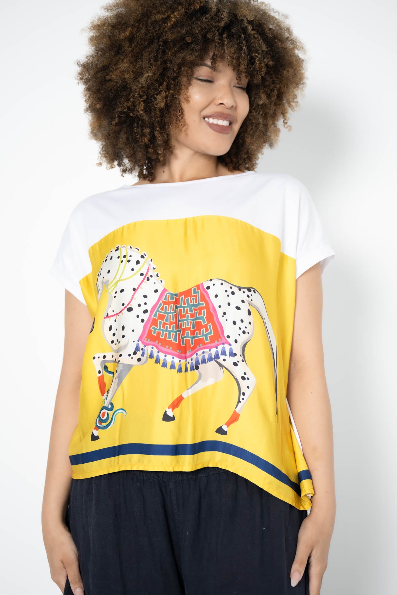The Animal Tee with Horse is a bold fusion of comfort and artistic expression. Made from a thick cotton blend, this relaxed tee features a striking silk front panel in warm yellow, showcasing a large, hand-drawn style illustration of a carnival horse.