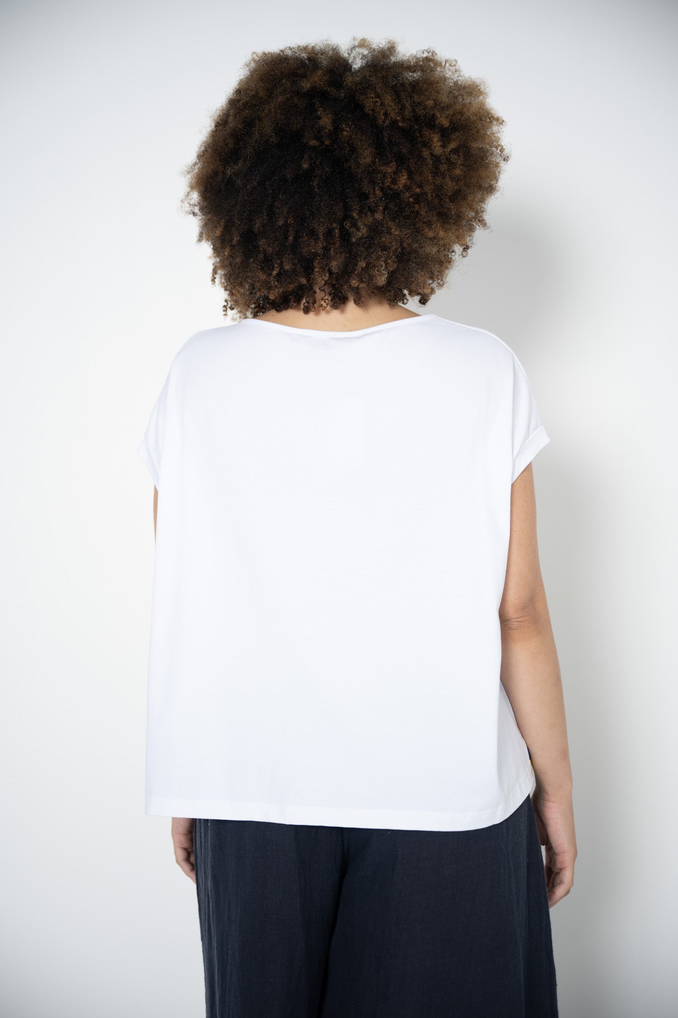 The silhouette is boxy and modern, with dropped shoulders that create a soft cap sleeve effect, offering a relaxed yet sculptural shape. The mix of textures and the vivid, whimsical print give this tee the feel of a statement piece while staying effortlessly wearable.