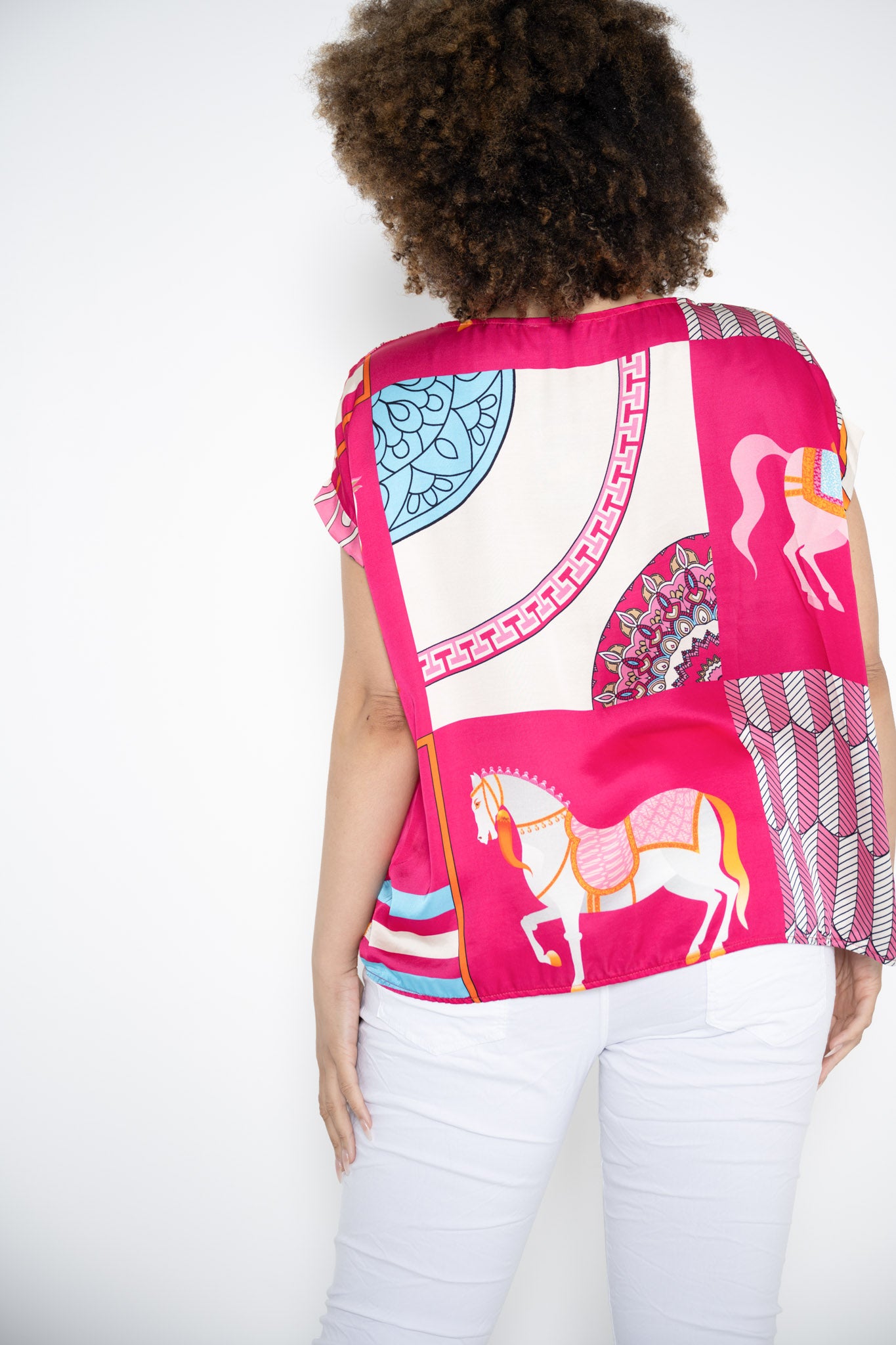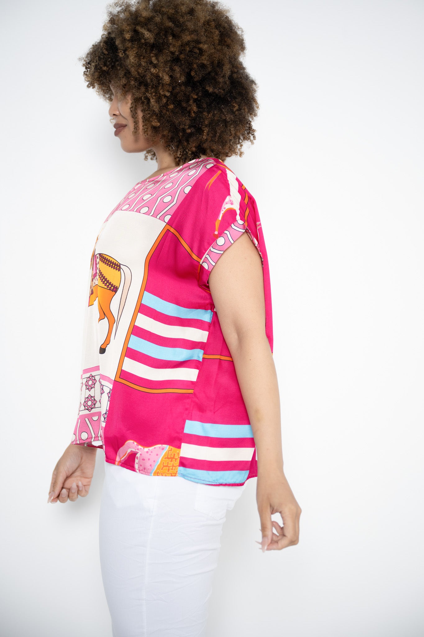 The Horse Top is a joyful expression of colour, movement, and bold imagination. Crafted entirely from a soft, fluid silk blend, it features a relaxed, boxy silhouette with dropped shoulders that form a subtle cap sleeve—easy to wear, yet full of impact.