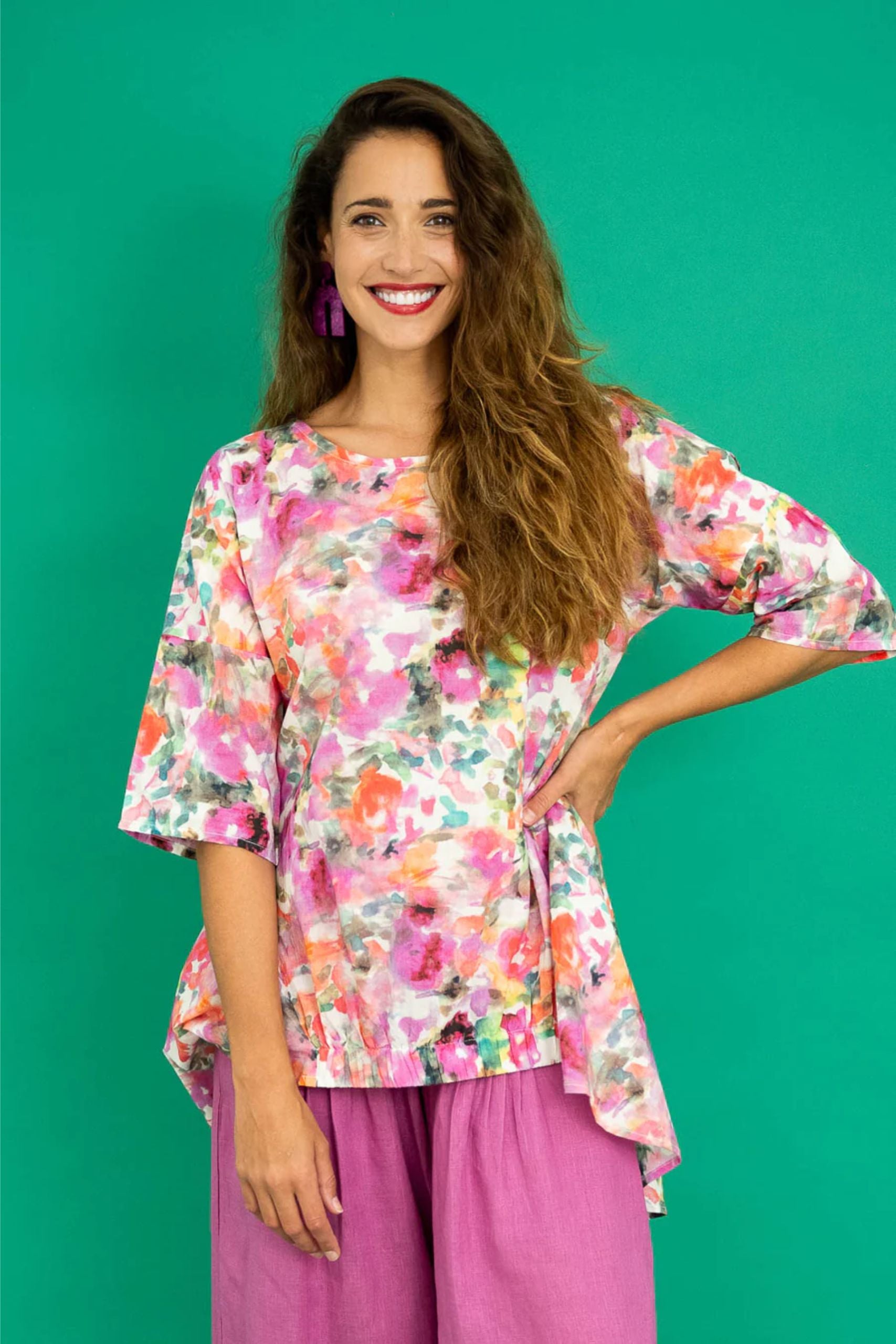 Step into a garden of style with the Purple Florence Top, a floral masterpiece that transforms the classic peplum silhouette into a canvas of watercolour dreams.