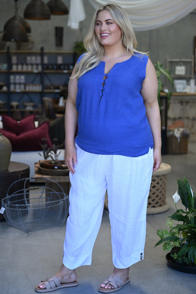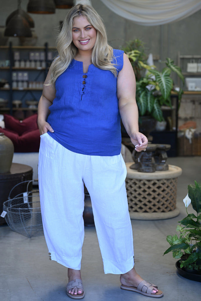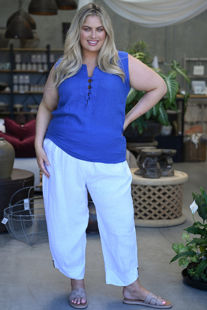 Introduce effortless refinement into your wardrobe with the Libby Top, crafted in Italy from 100% premium linen. In a rich Royal Blue, this piece brings a sense of depth and quiet luxury to warm-weather dressing, making it an instant standout in any collection.