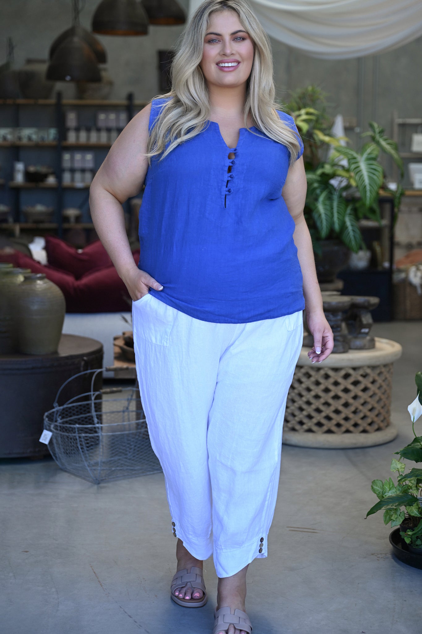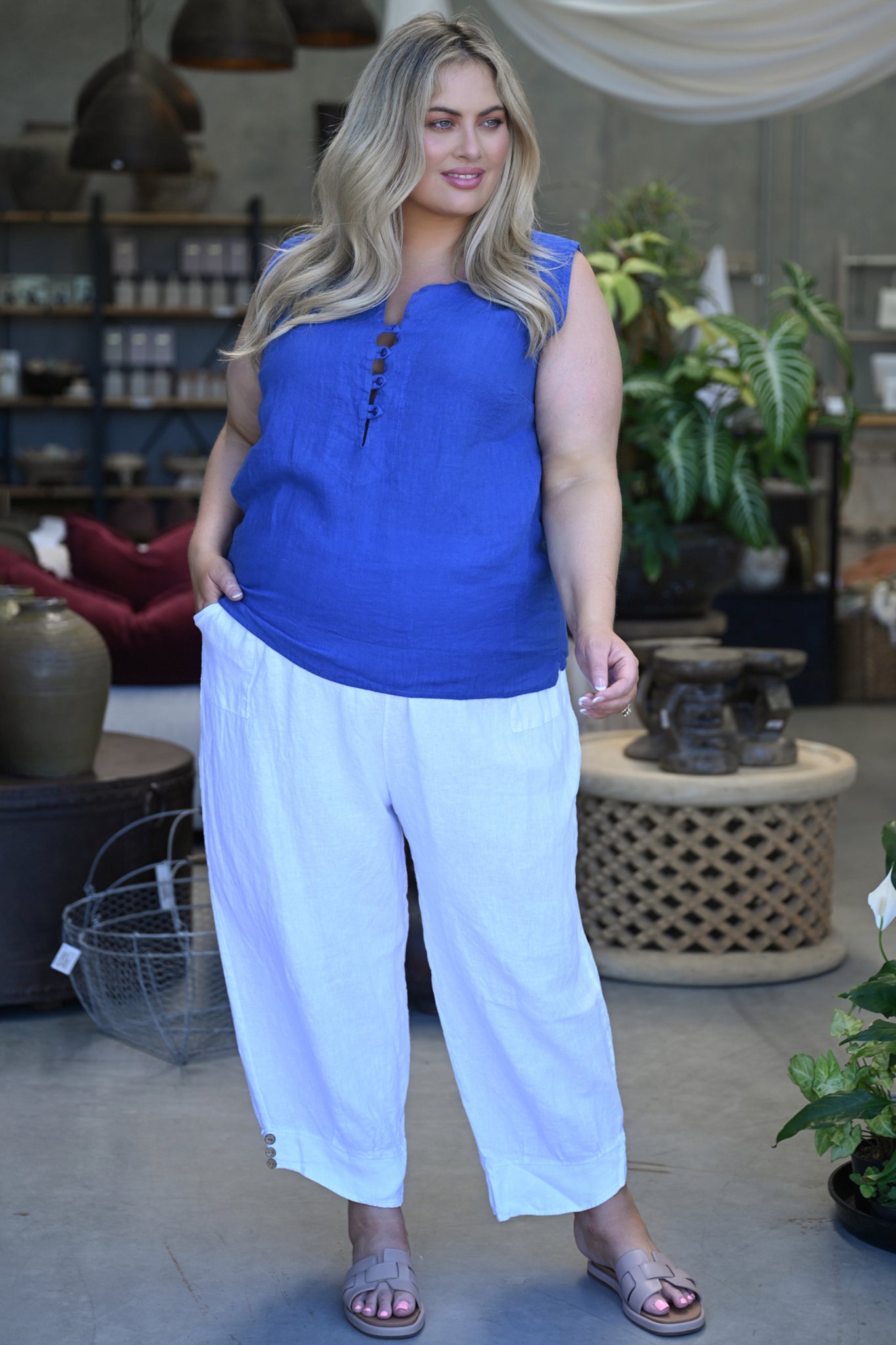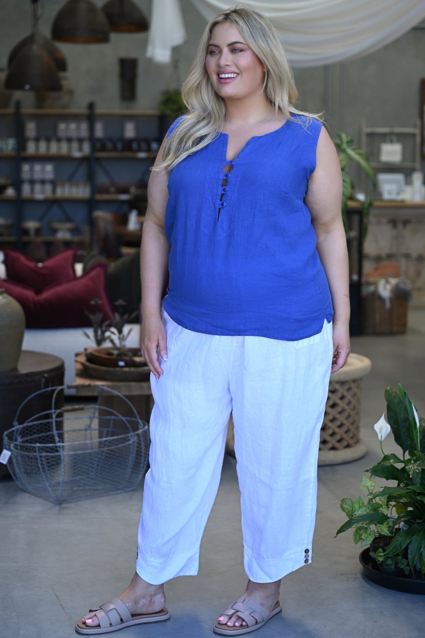 A wide hem anchors the top with clean structure, lending a modern finish that drapes beautifully over the body. Breathable, versatile, and undeniably elegant, the Libby Top pairs seamlessly with tailored trousers, linen skirts, or relaxed denim—perfect for days when you want to look polished with minimal effort.