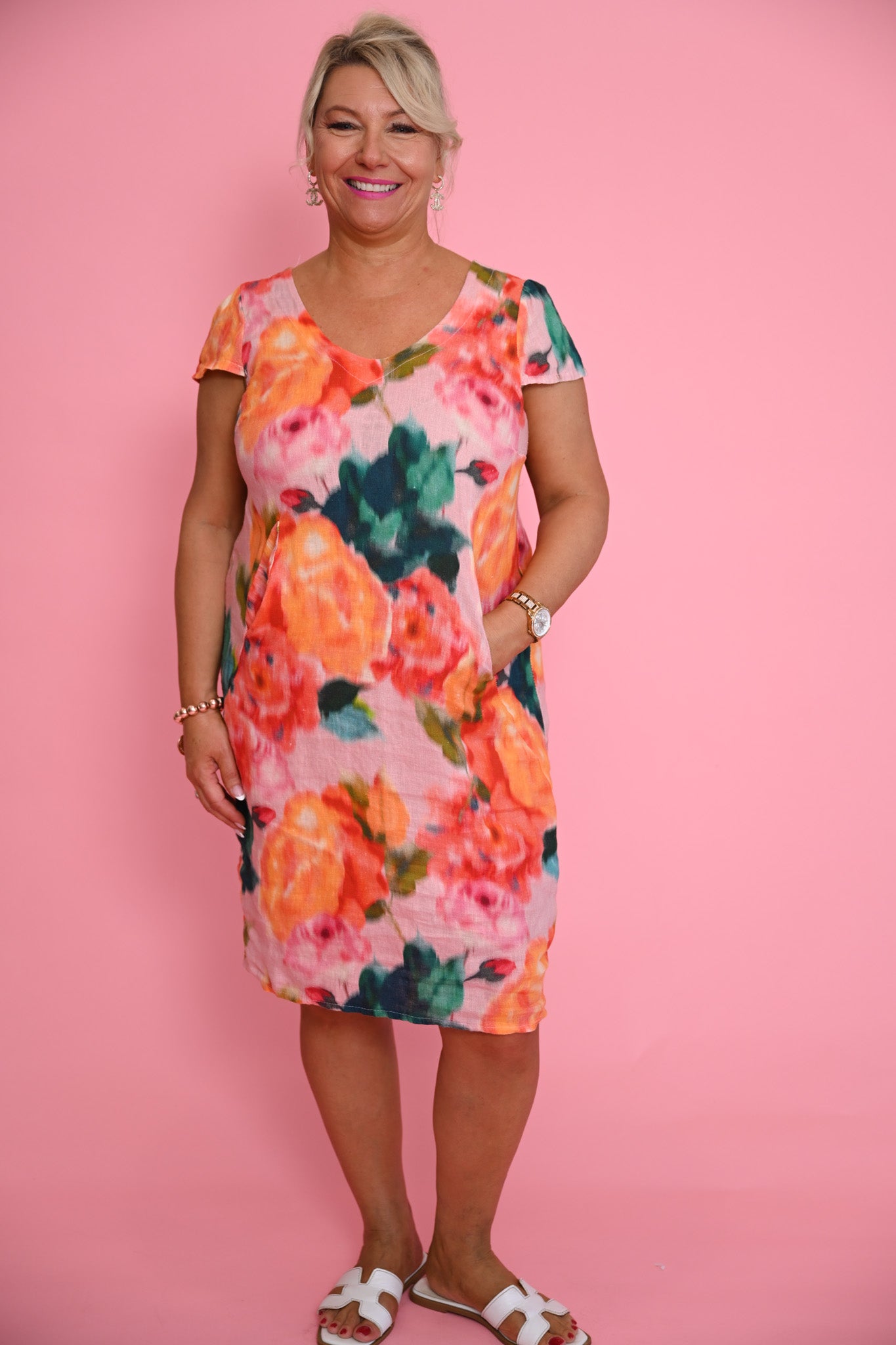 Adorned with a delicate floral print in muted tones on a soft backdrop, the Ella brings subtle charm to everyday dressing. Discreet hip pockets add function without disturbing the clean lines, while the lightweight fabric moves beautifully with the body.