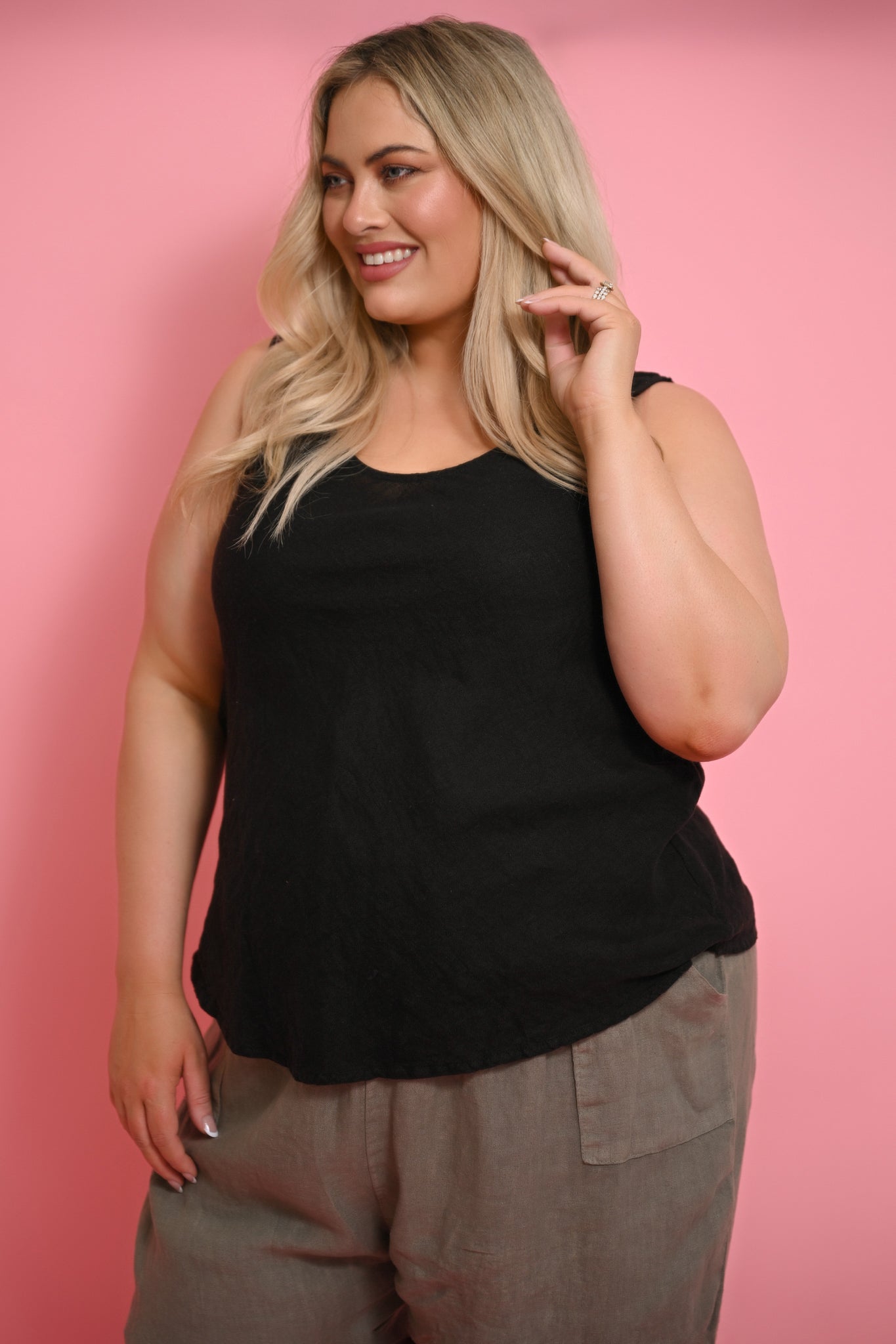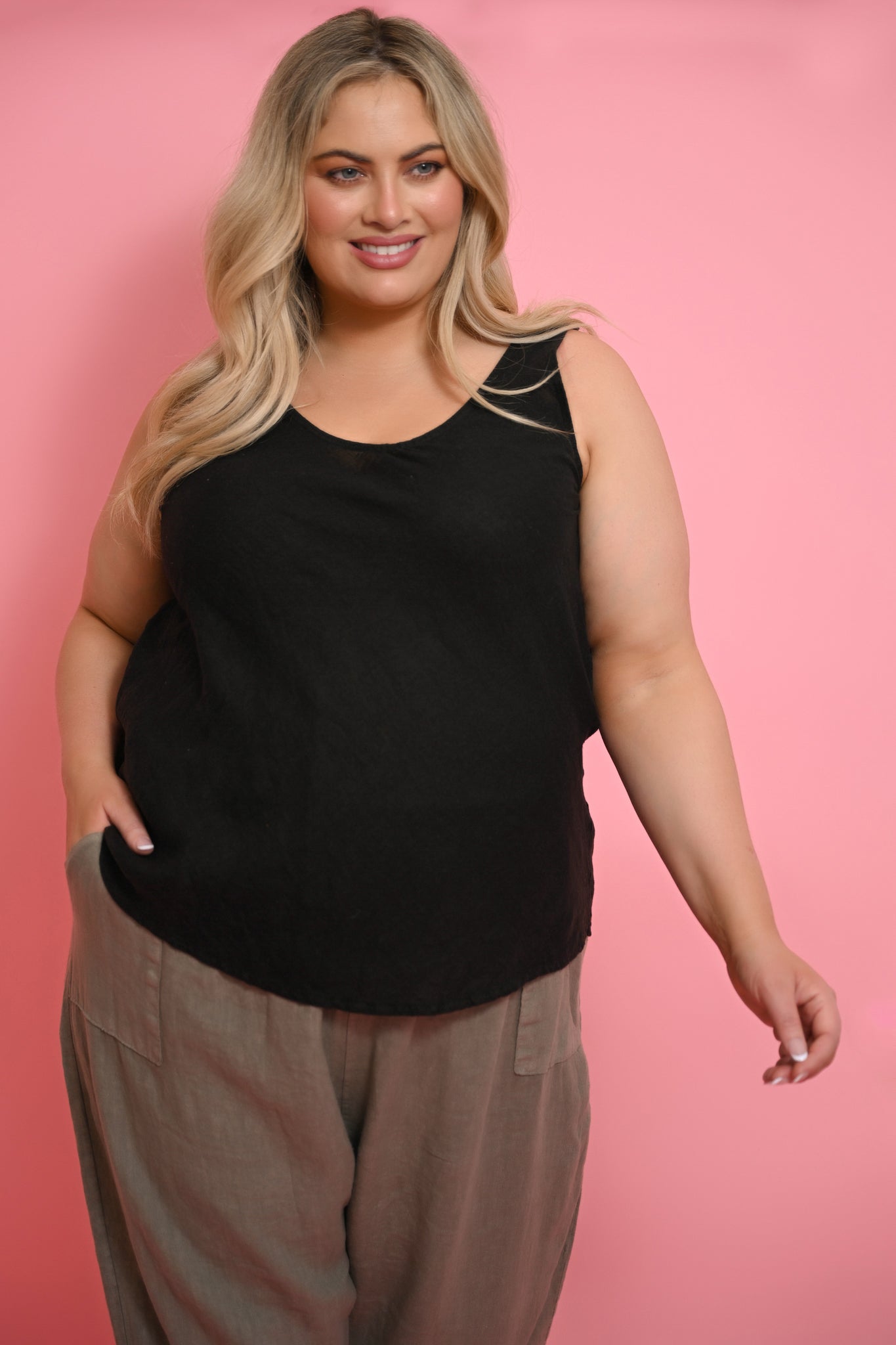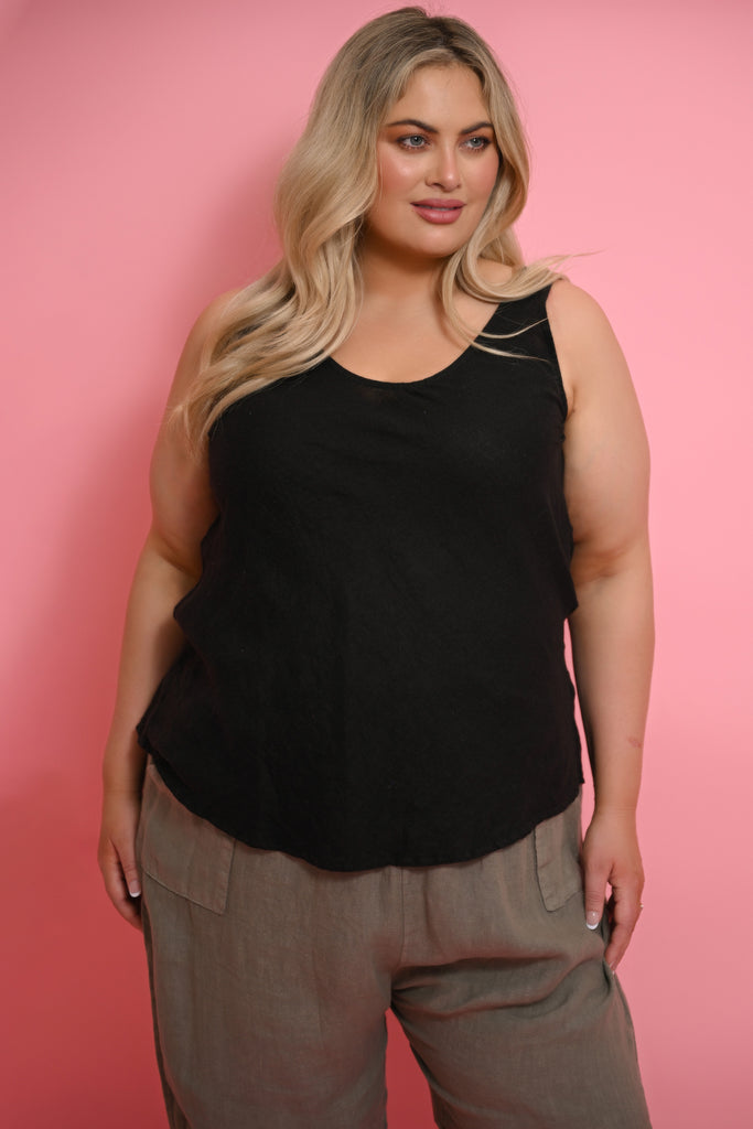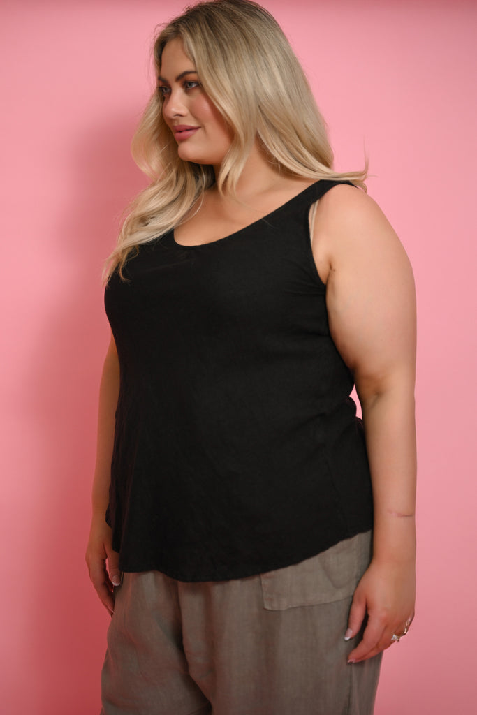 The generous cut features a feminine v-neck and sleek, sleeveless design, while the extended length ensures perfect coverage under shorter pieces like our Tuscan and Tia tops. Whether worn alone for classic simplicity or layered for sophisticated styling, this plus-size friendly singlet proves that foundation pieces can be both eternal and remarkably refined.