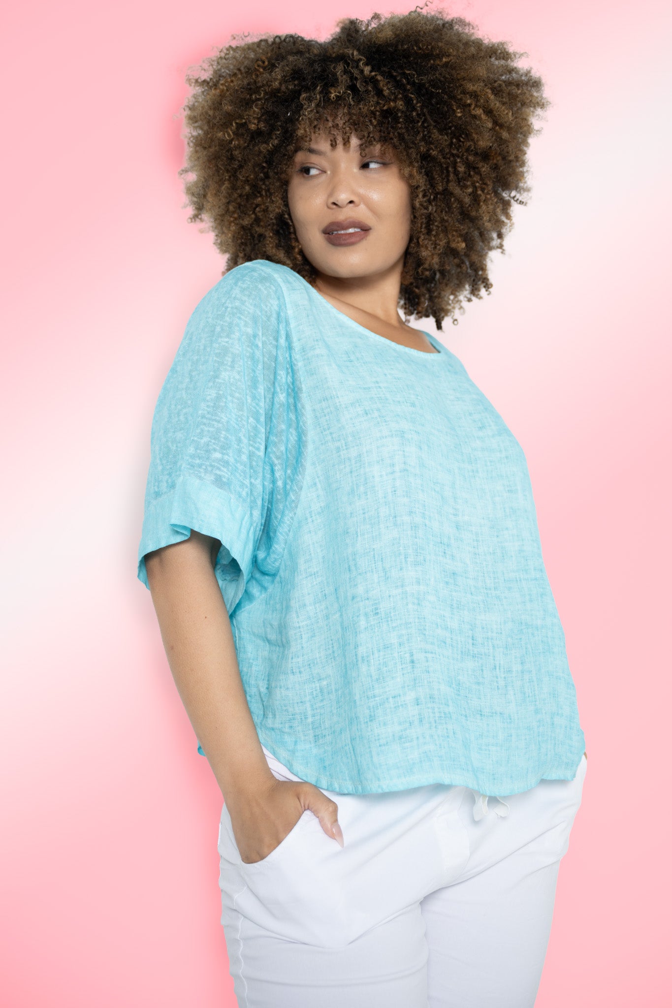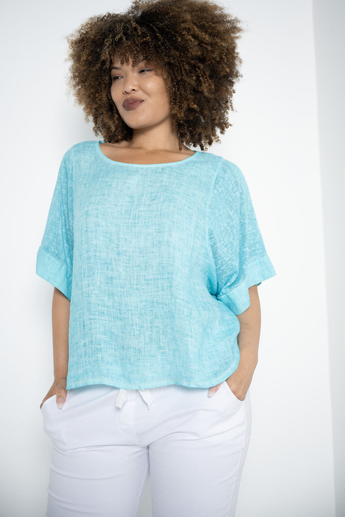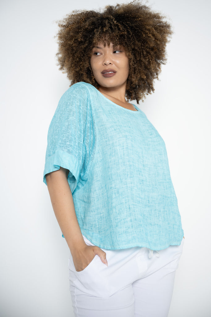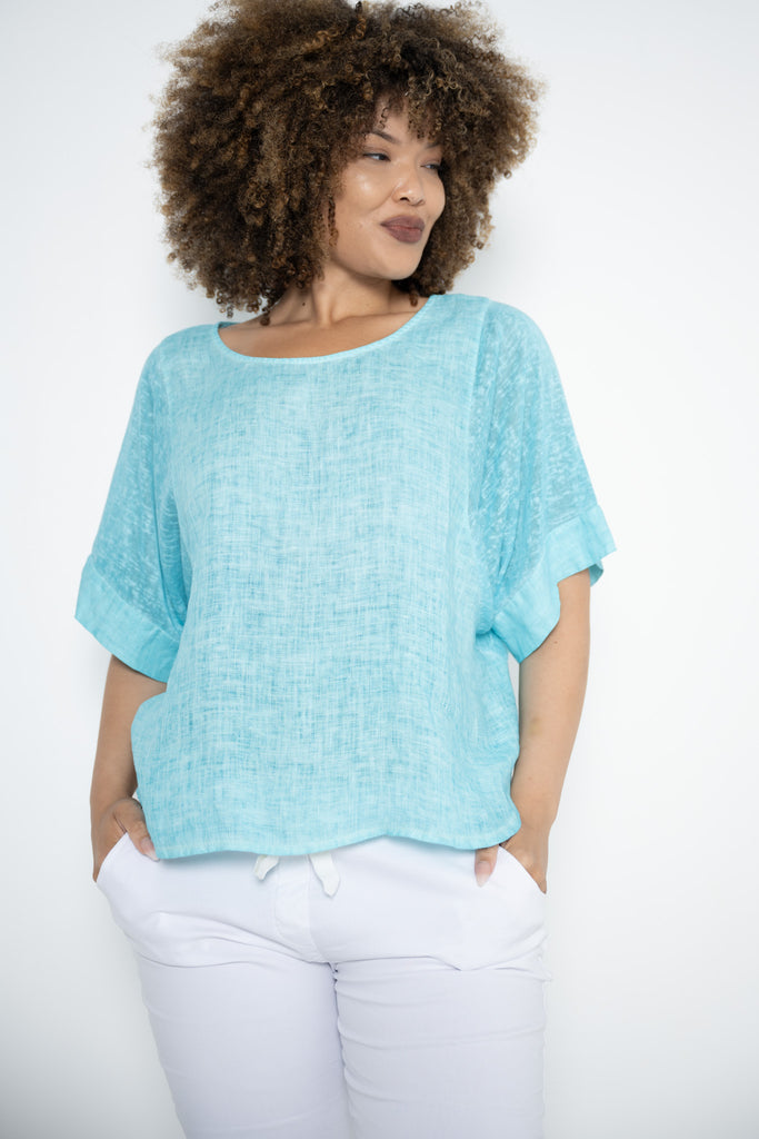The Lucia Top in fresh aqua brings a soothing splash of color to a beautifully balanced silhouette. Crafted from breathable 100% linen, the body feels light and natural against the skin, while the softly rounded neckline and gently curved cropped hem create a flattering, modern shape that pairs effortlessly with a variety of looks.