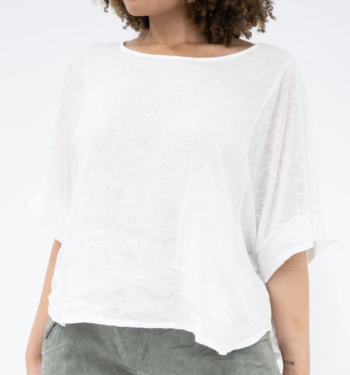 Its standout feature—the batwing sleeves crafted from a sheer polyester fabric—adds an airy lightness that contrasts beautifully with the linen. The wide linen cuffs bring structure and balance, lending the top a refined yet relaxed feel.