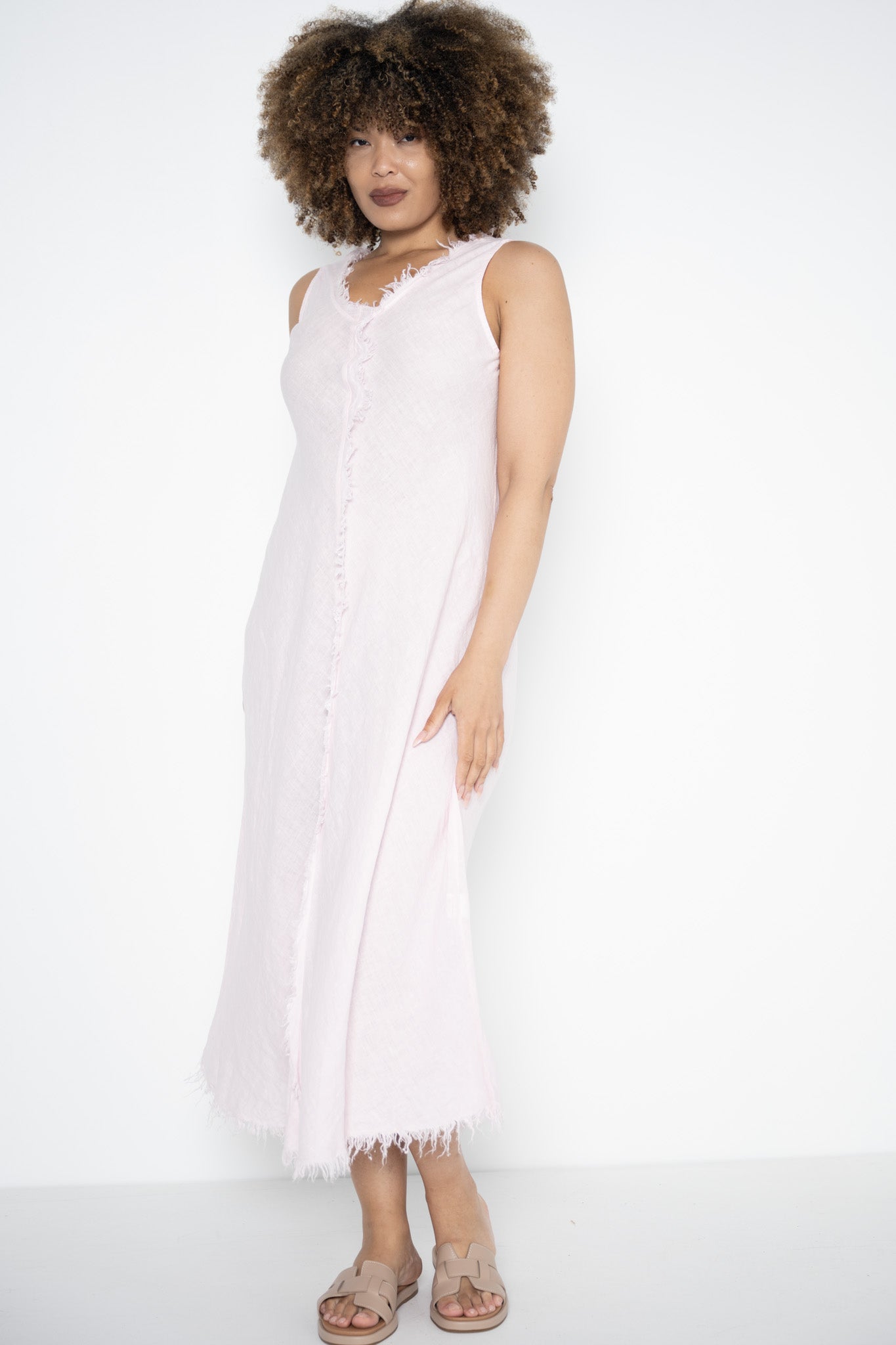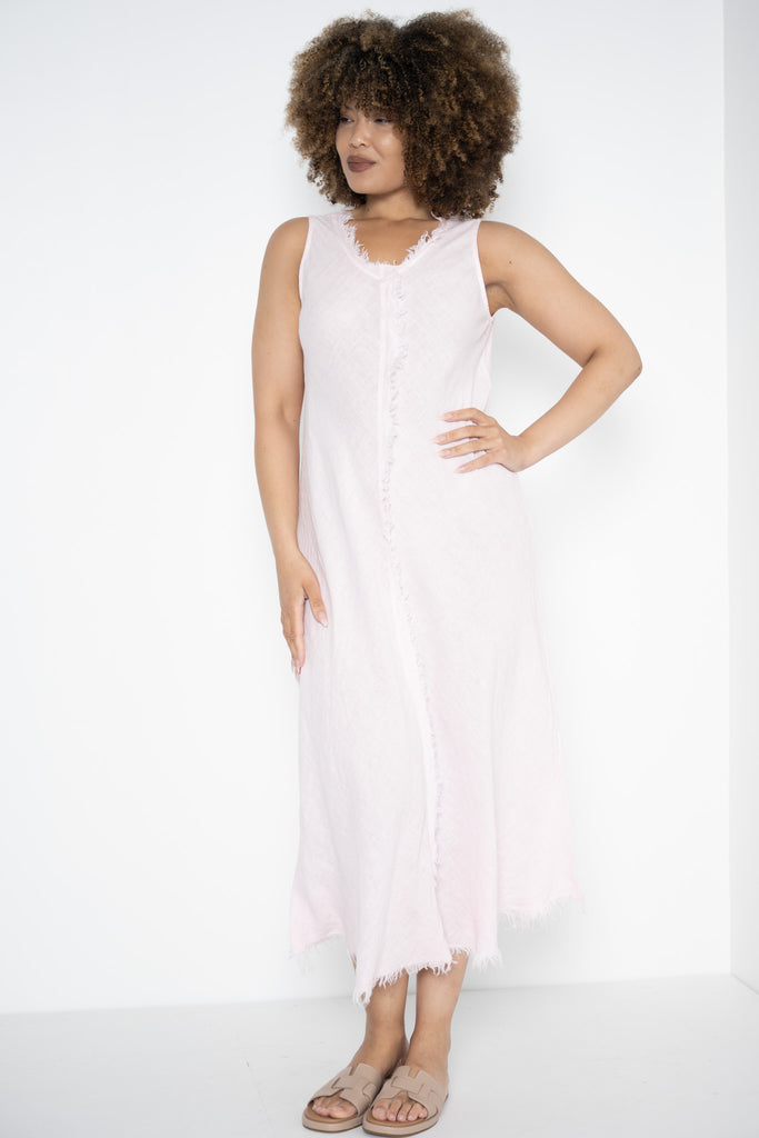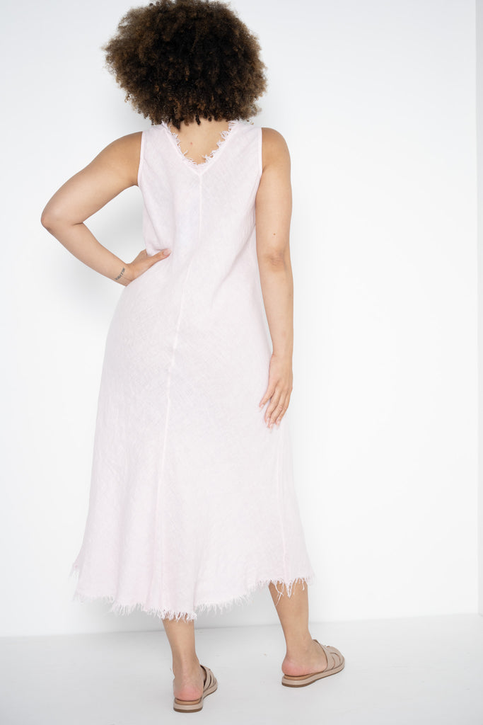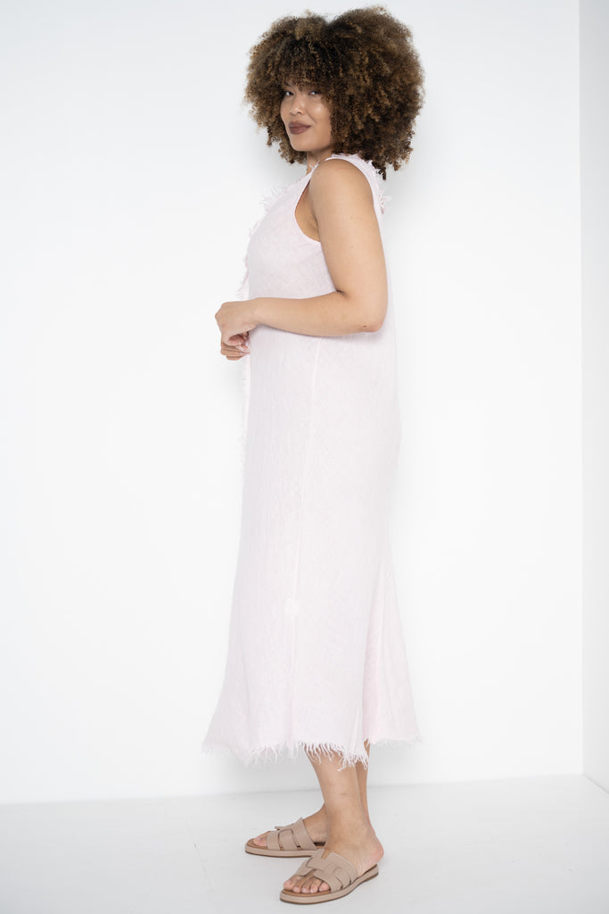 A raw frayed edge traces the V-neckline and hem, bringing a relaxed, artisanal feel, while a bold frayed detail runs down the front from neckline to hem—adding subtle structure and visual depth. The minimalist design lets the fabric and finishes speak for themselves, creating a look that’s both unfussy and quietly striking.