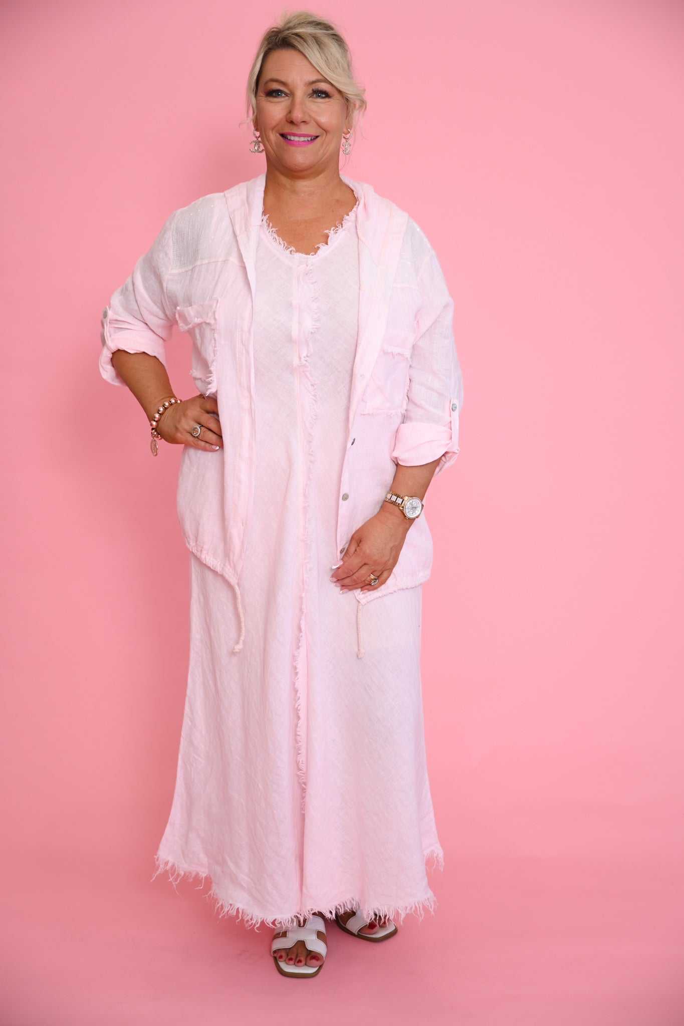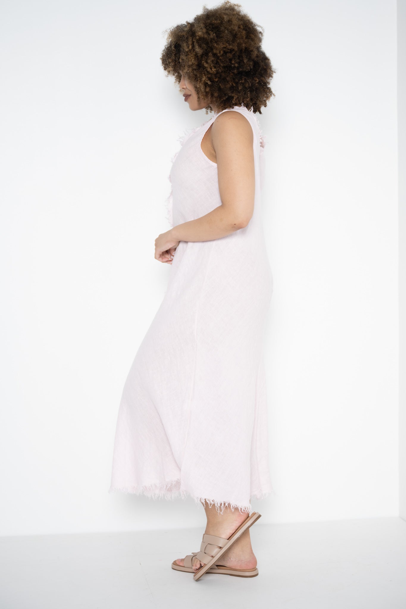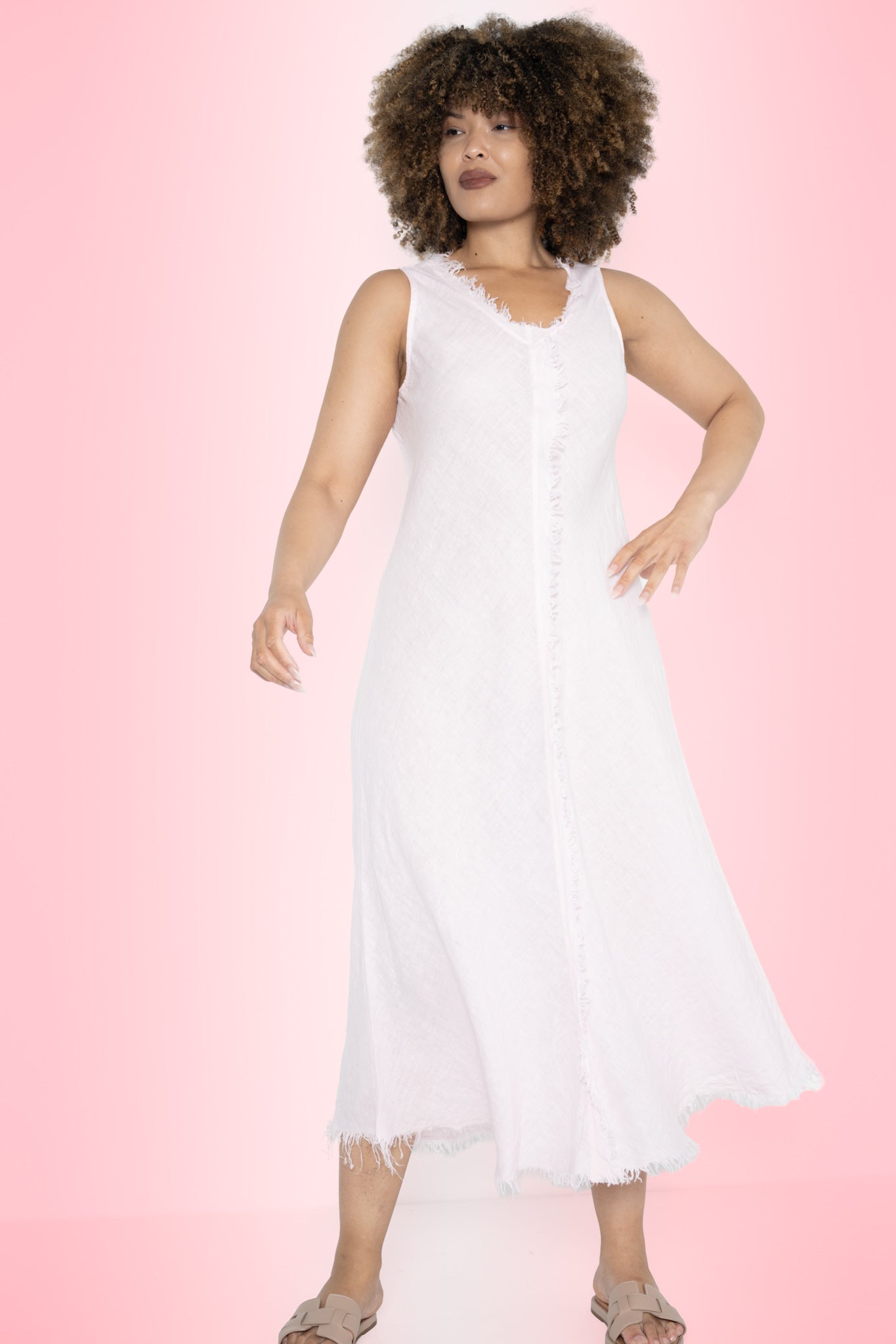 A raw frayed edge traces the V-neckline and hem, bringing a relaxed, artisanal feel, while a bold frayed detail runs down the front from neckline to hem—adding subtle structure and visual depth. The minimalist design lets the fabric and finishes speak for themselves, creating a look that’s both unfussy and quietly striking.