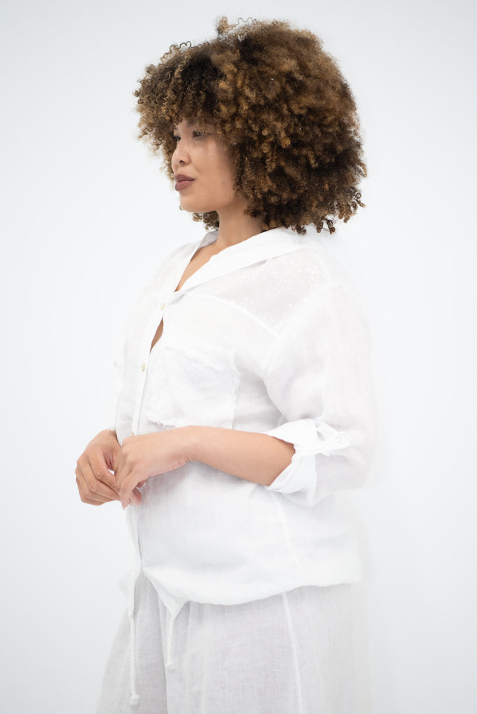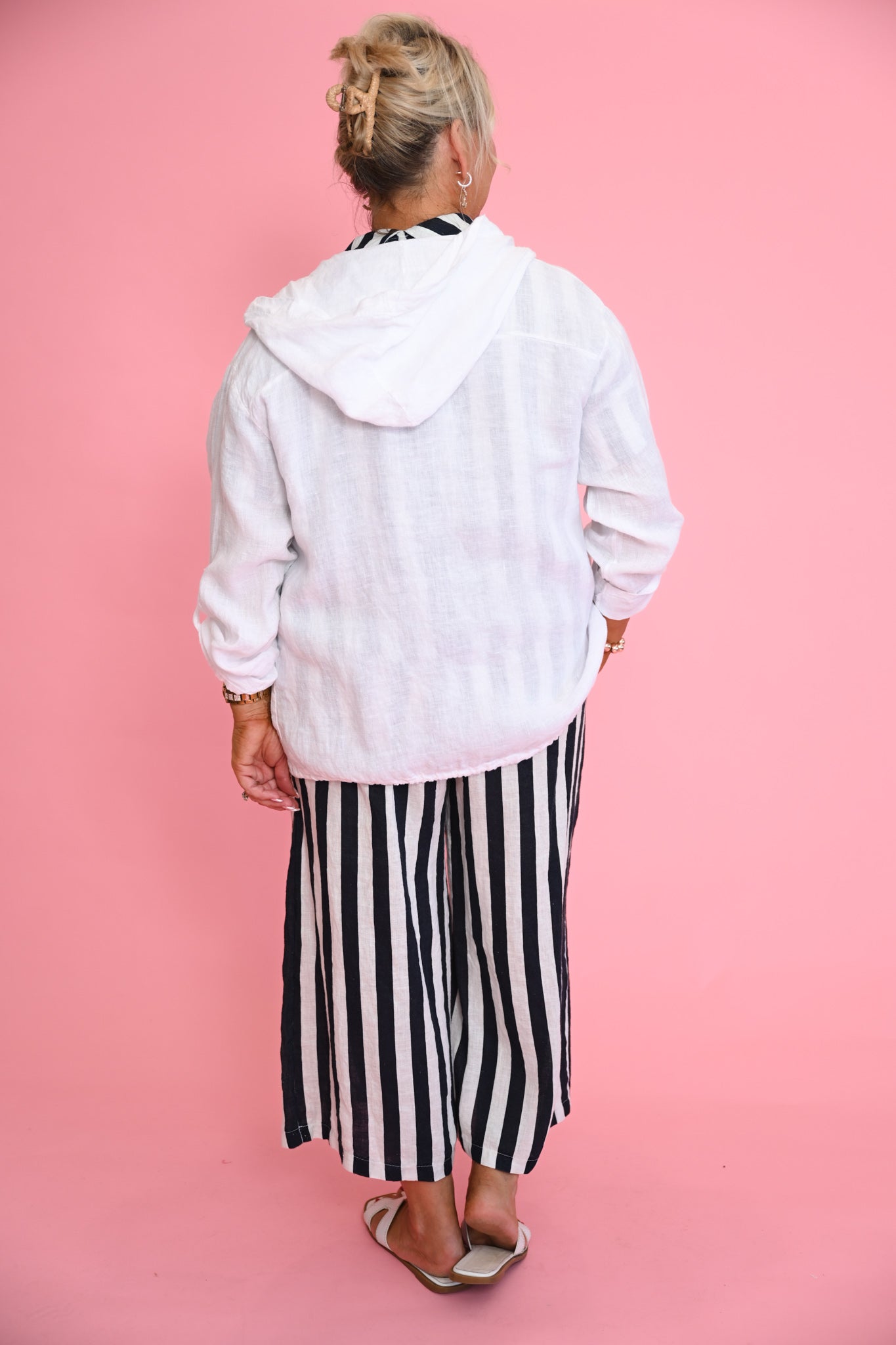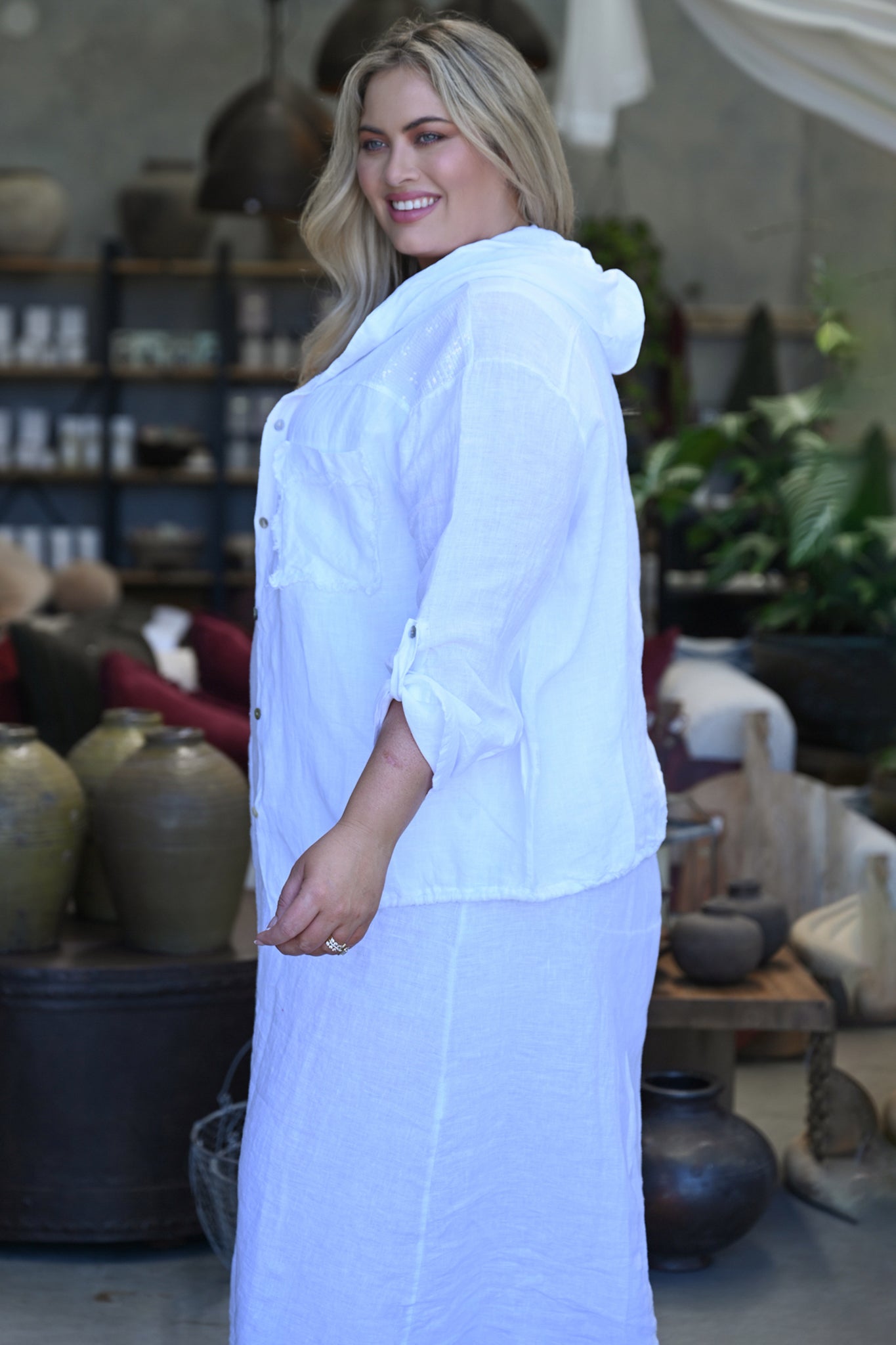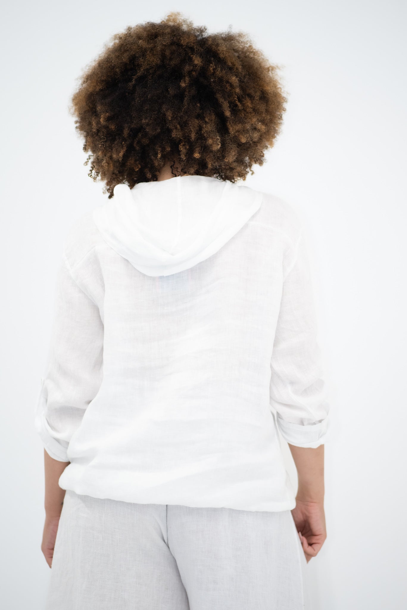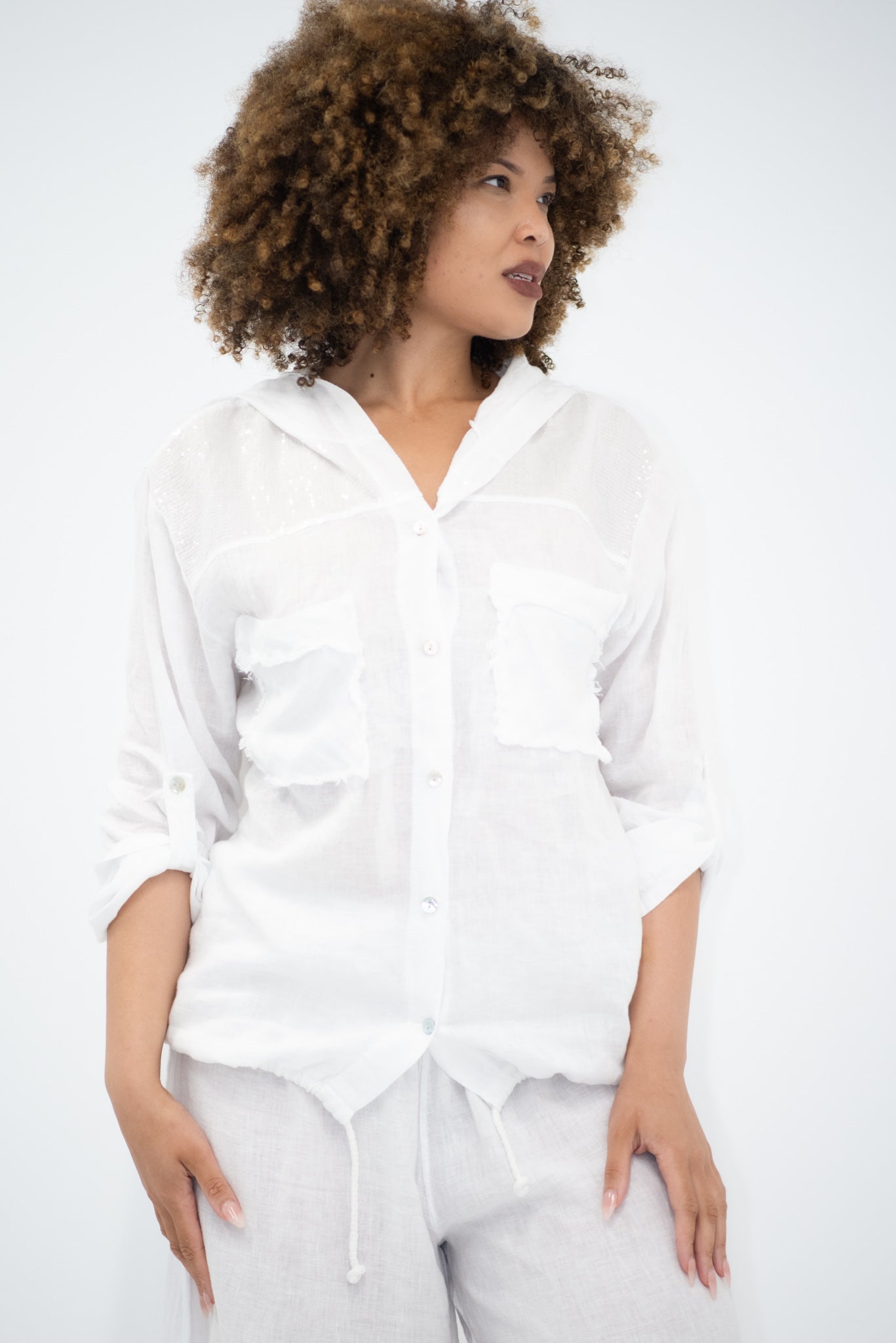 The Machina Jacket in crisp white linen offers a fresh, breezy layer with a hint of understated sparkle. Crafted from lightweight fabric, it features a hood for casual coverage and breast pockets finished with subtle frayed edges for a relaxed touch.