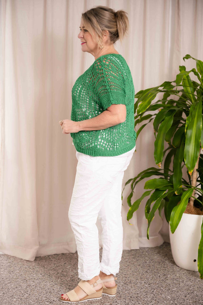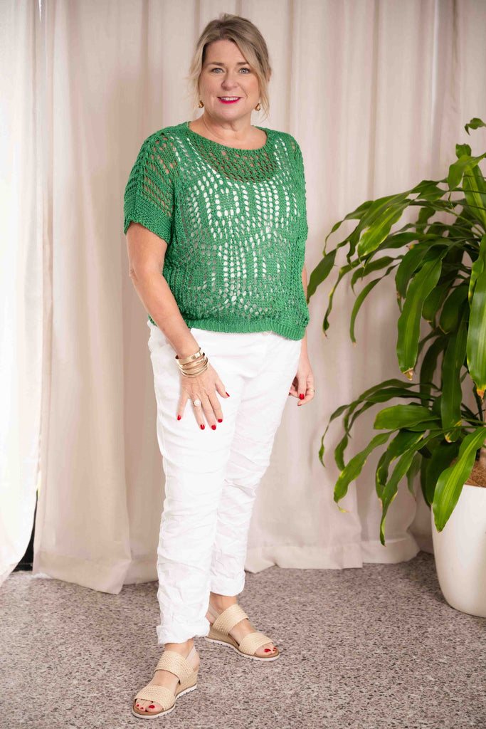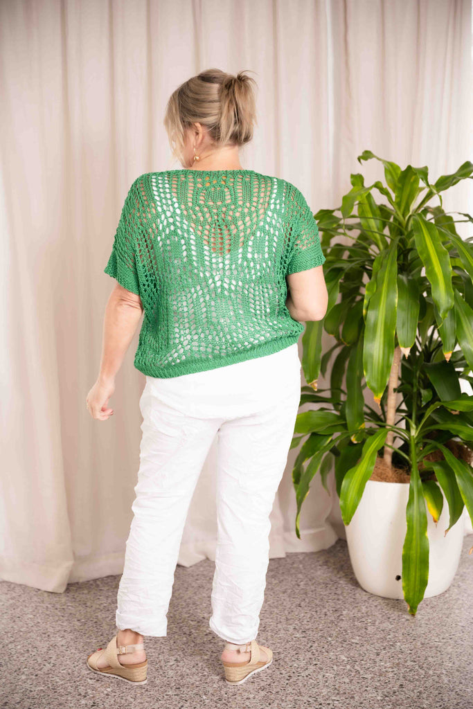 In a bold, vibrant green, the Mia Knit is made to stand out – whether you're heading out for brunch or layering up for a breezy summer night. Pair it with high-waisted jeans or a flowy skirt for that easy, thrown-together look.