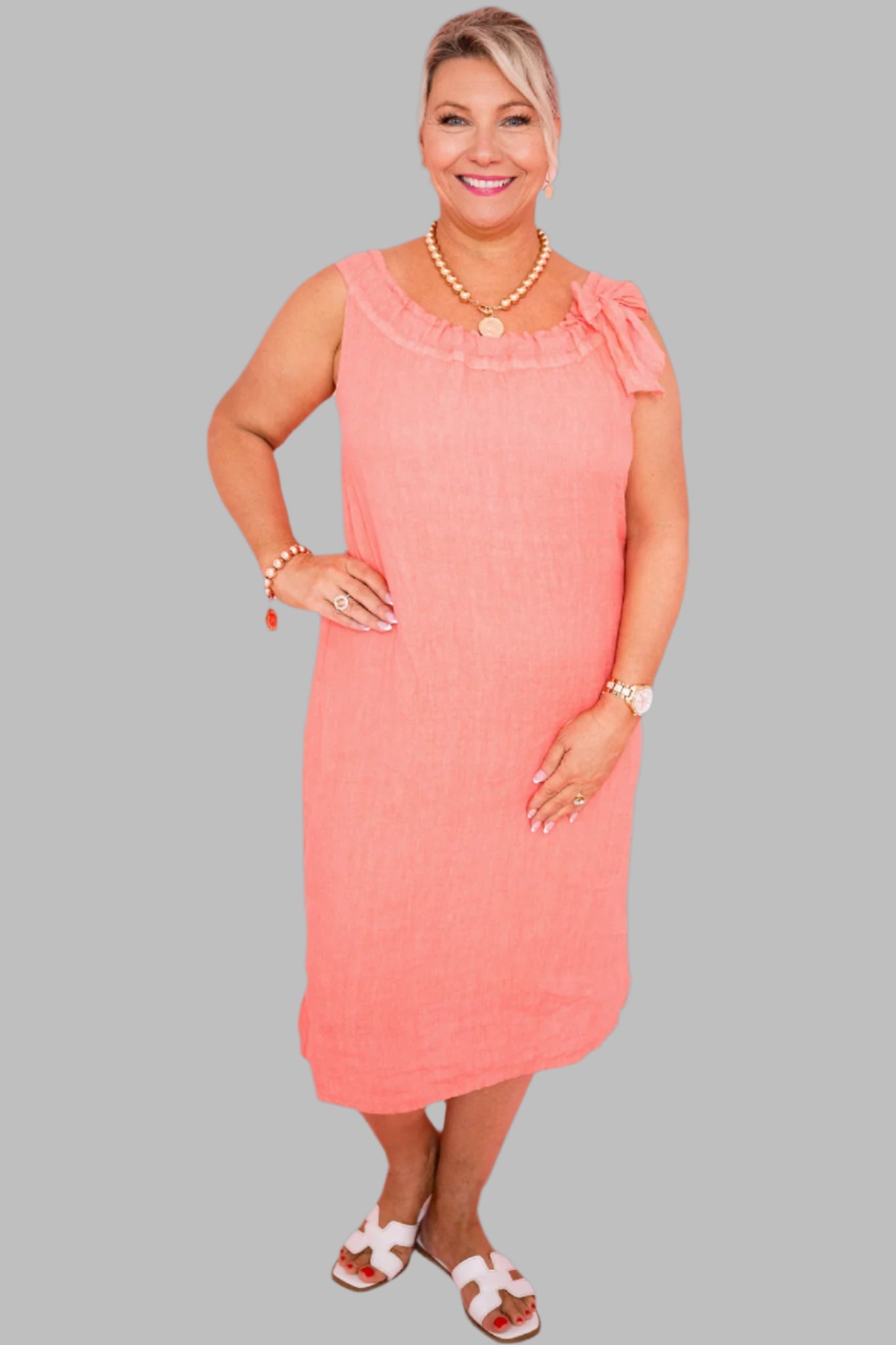 The Miranda Linen Dress is a timeless piece that blends elegance with relaxed sophistication. Crafted from fully lined, breathable linen, this sleeveless dress features generous arm opening, a boat neckline with a drawstring that ties into a bow, adding a delicate touch of femininity.