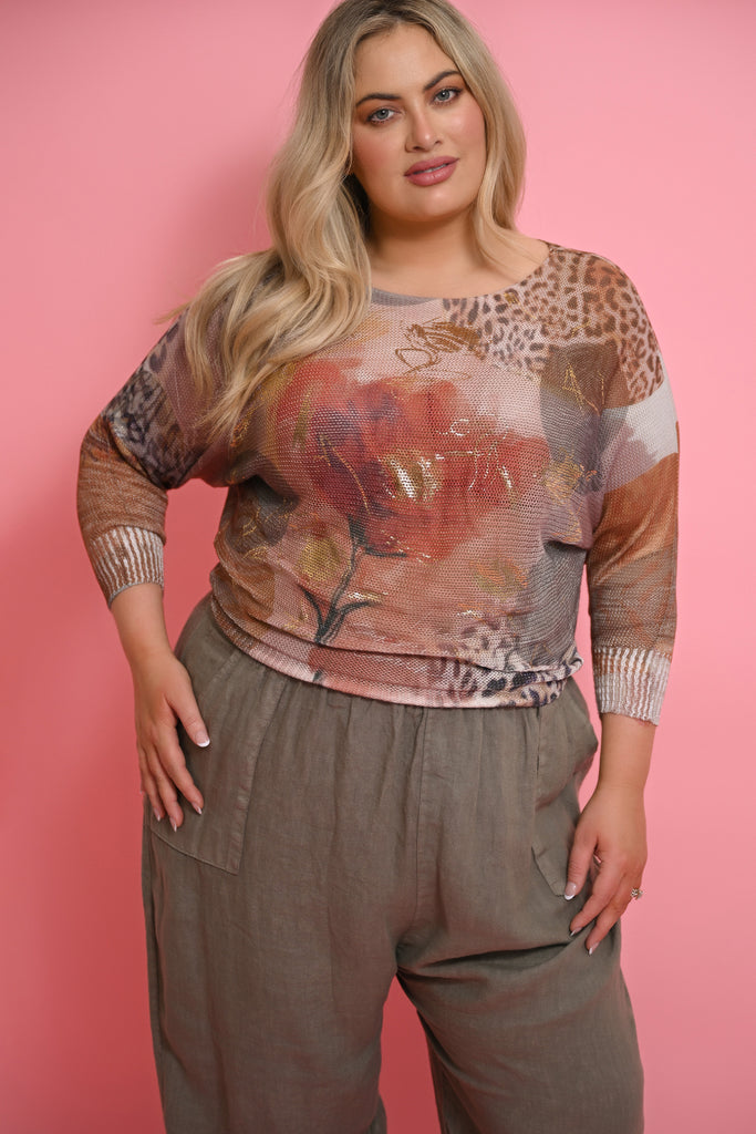 The standout feature? A striking fusion of abstract florals and animal print, accented with delicate gold foil for a hint of shimmer. Whether layered over a classic Linen Camio for a polished look or paired with your favourite Frankies for relaxed chic, this versatile knit is made for easy, everyday glamour. Finish the look with our Linen Culottes for a tres chic ensemble.
