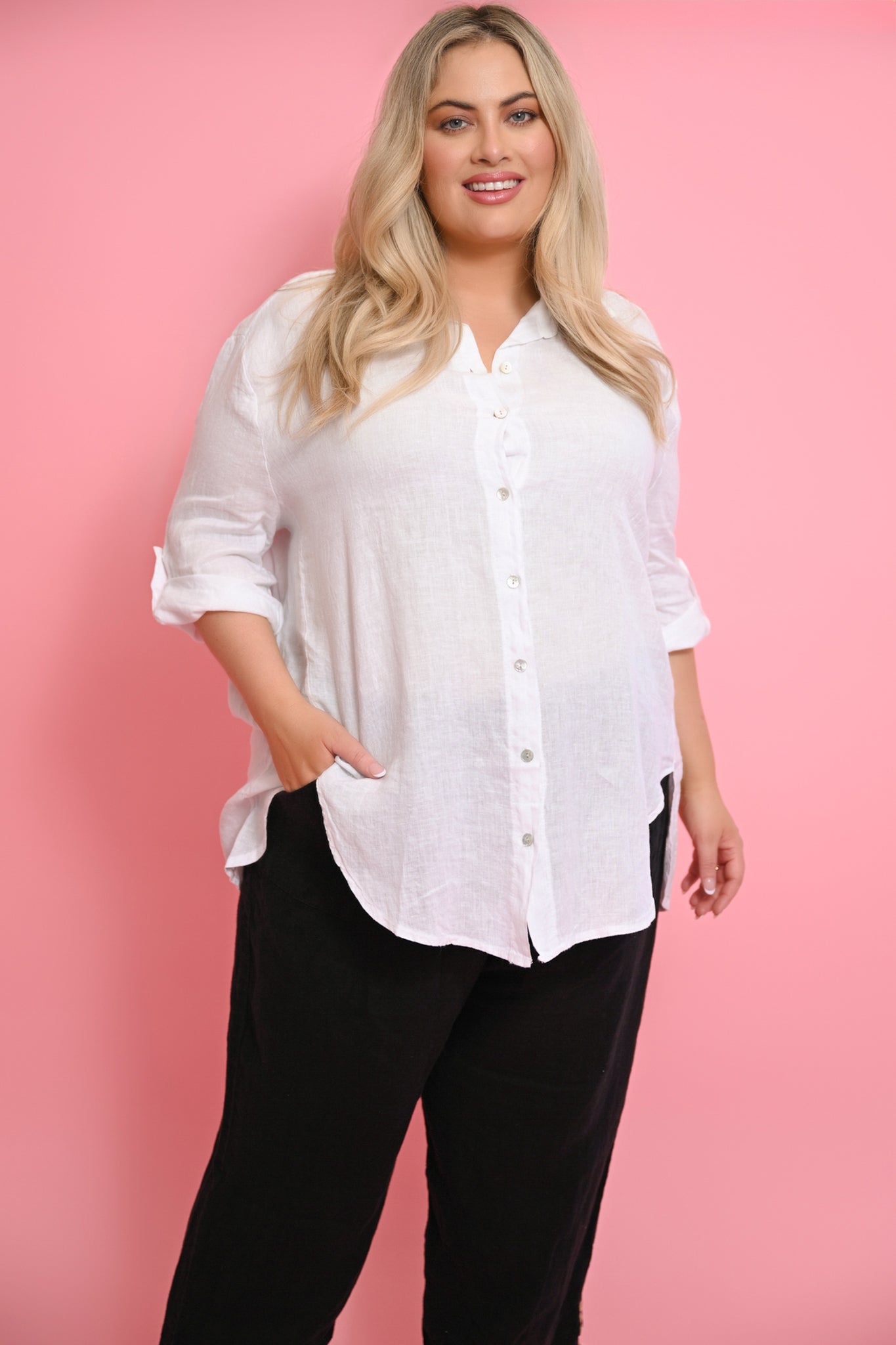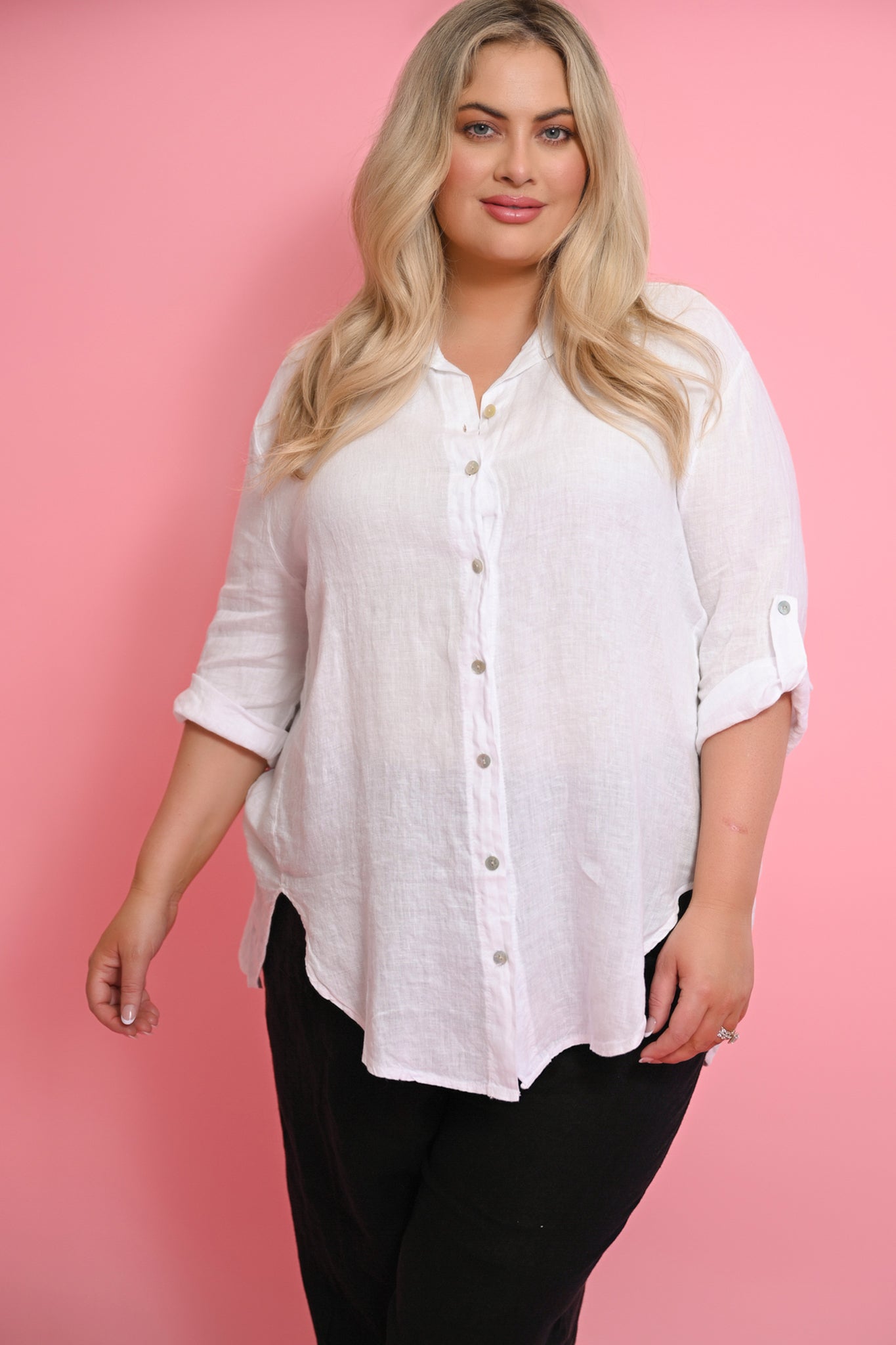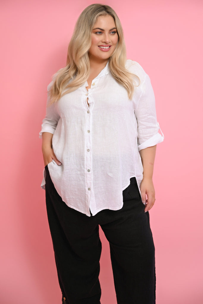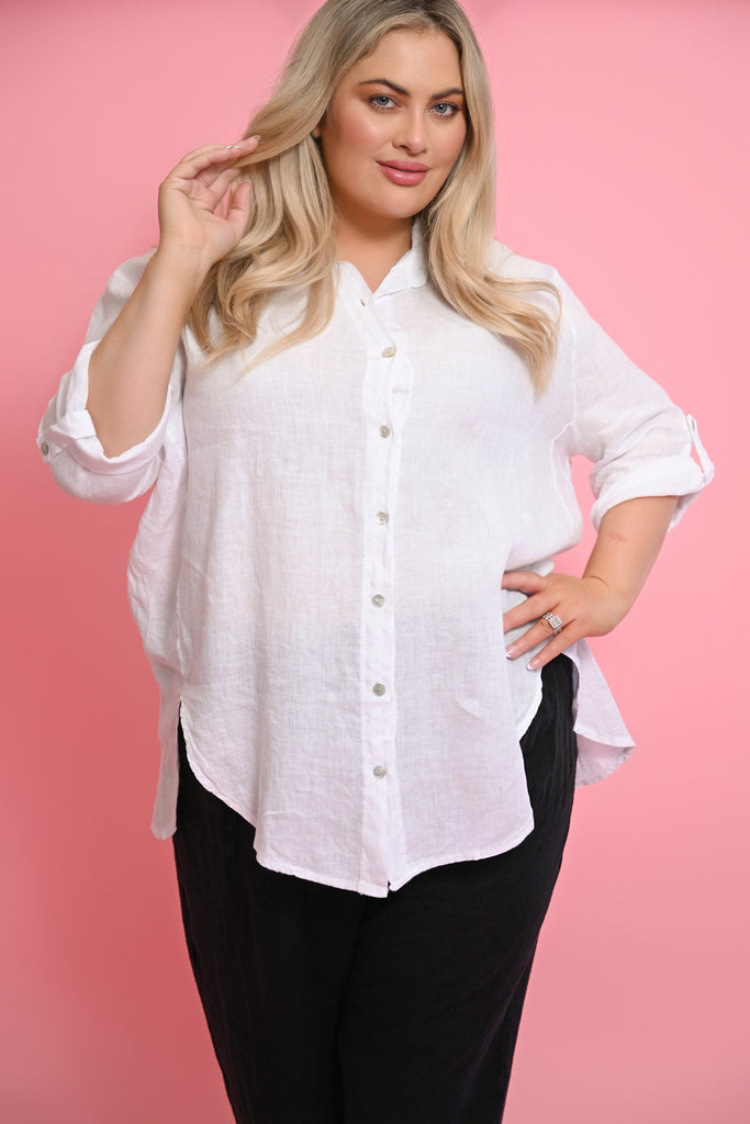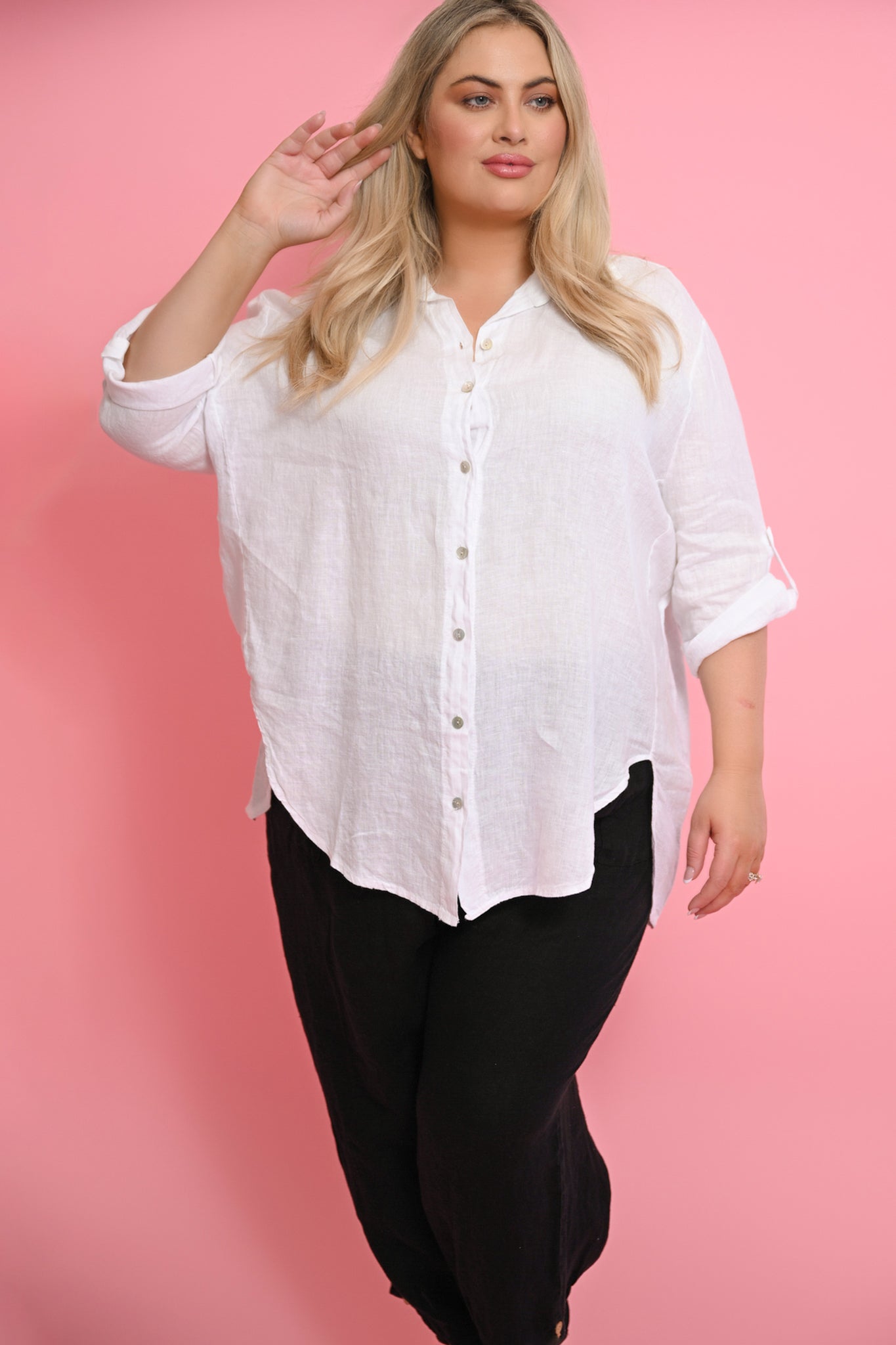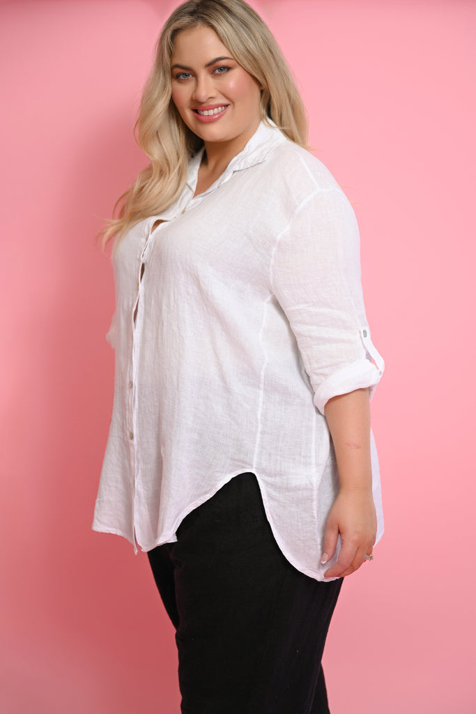 Finished with a crisp collar, ¾ sleeves that can be secured with a buttoned tab, and a full button-down front, it’s endlessly versatile—equally suited to layering, lounging, or stepping out. In fresh white linen, the Naomi Shirt feels cool, pure, and quietly elevated—an essential piece made for everyday ease and timeless appeal.