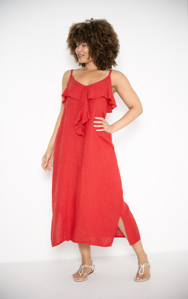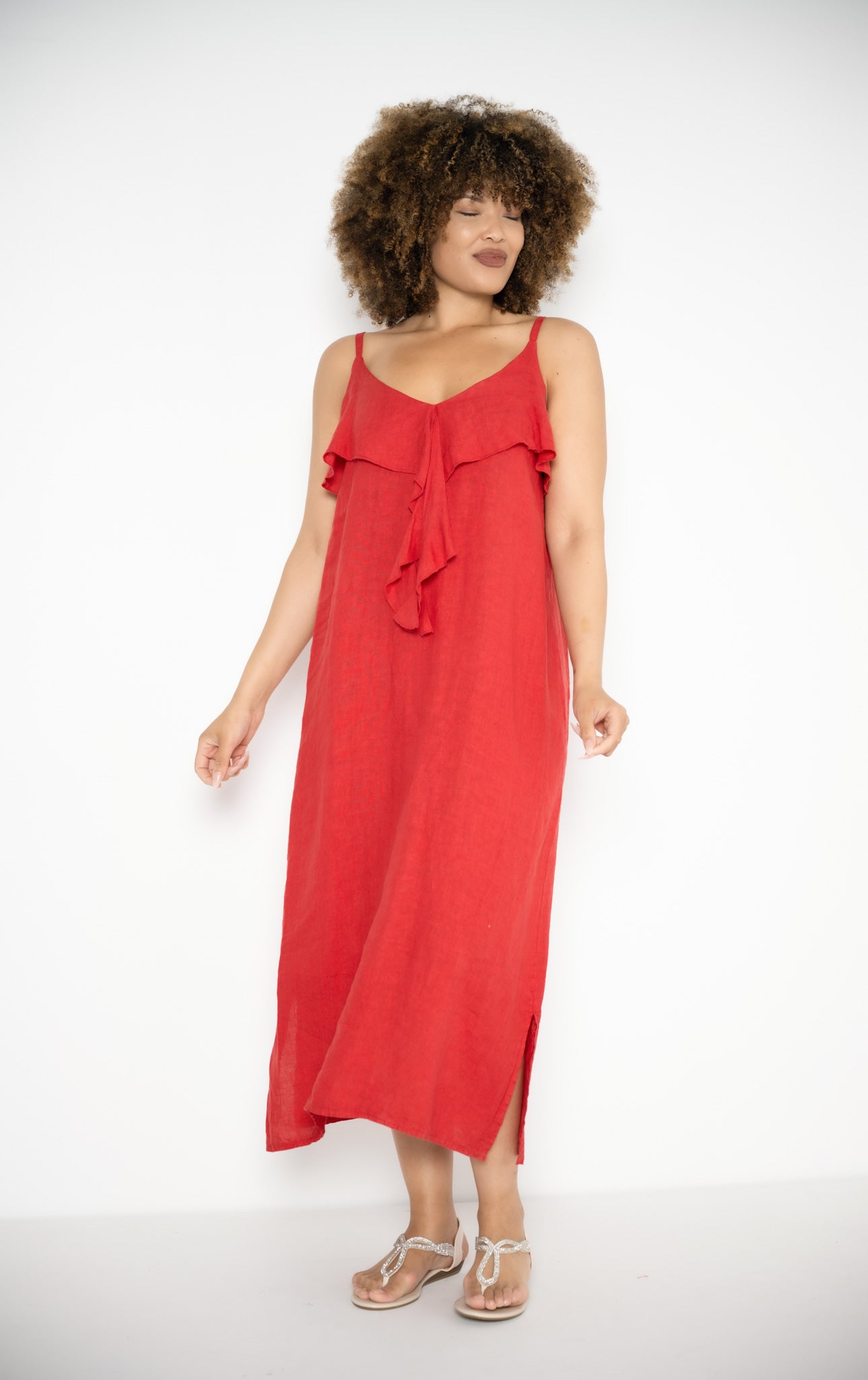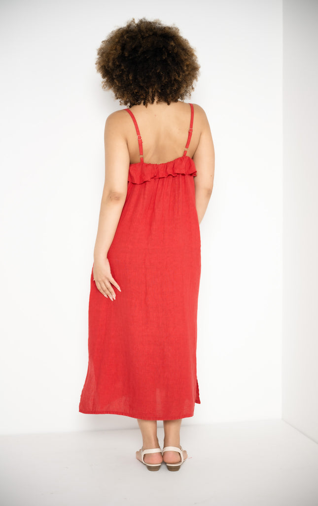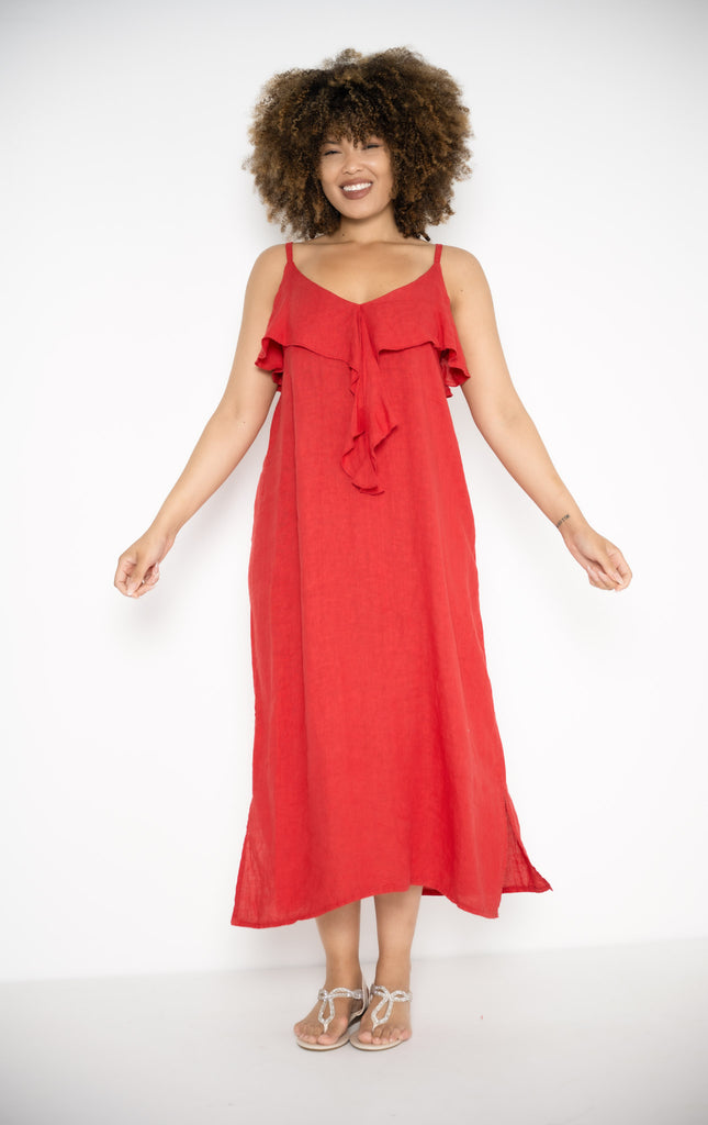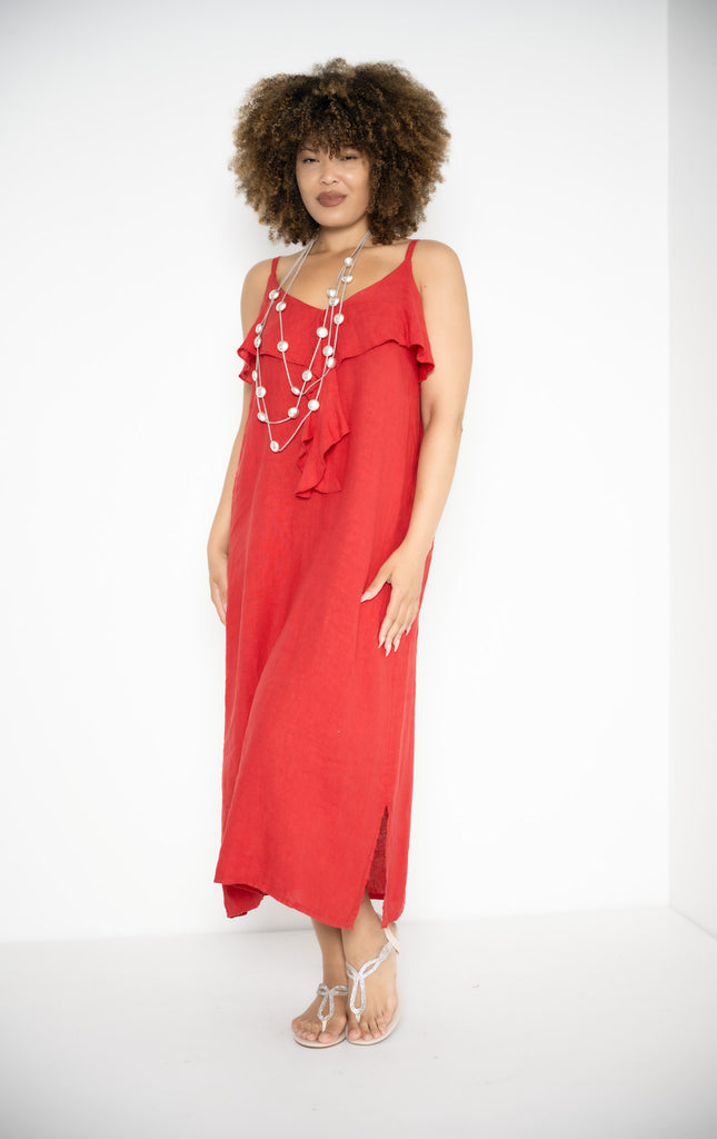 The Natale Dress in vibrant red is a stunning Italian-made piece designed to bring festive elegance to your wardrobe. Featuring adjustable shoestring straps and a flattering V-neckline, it offers a personalized fit with a touch of feminine charm.