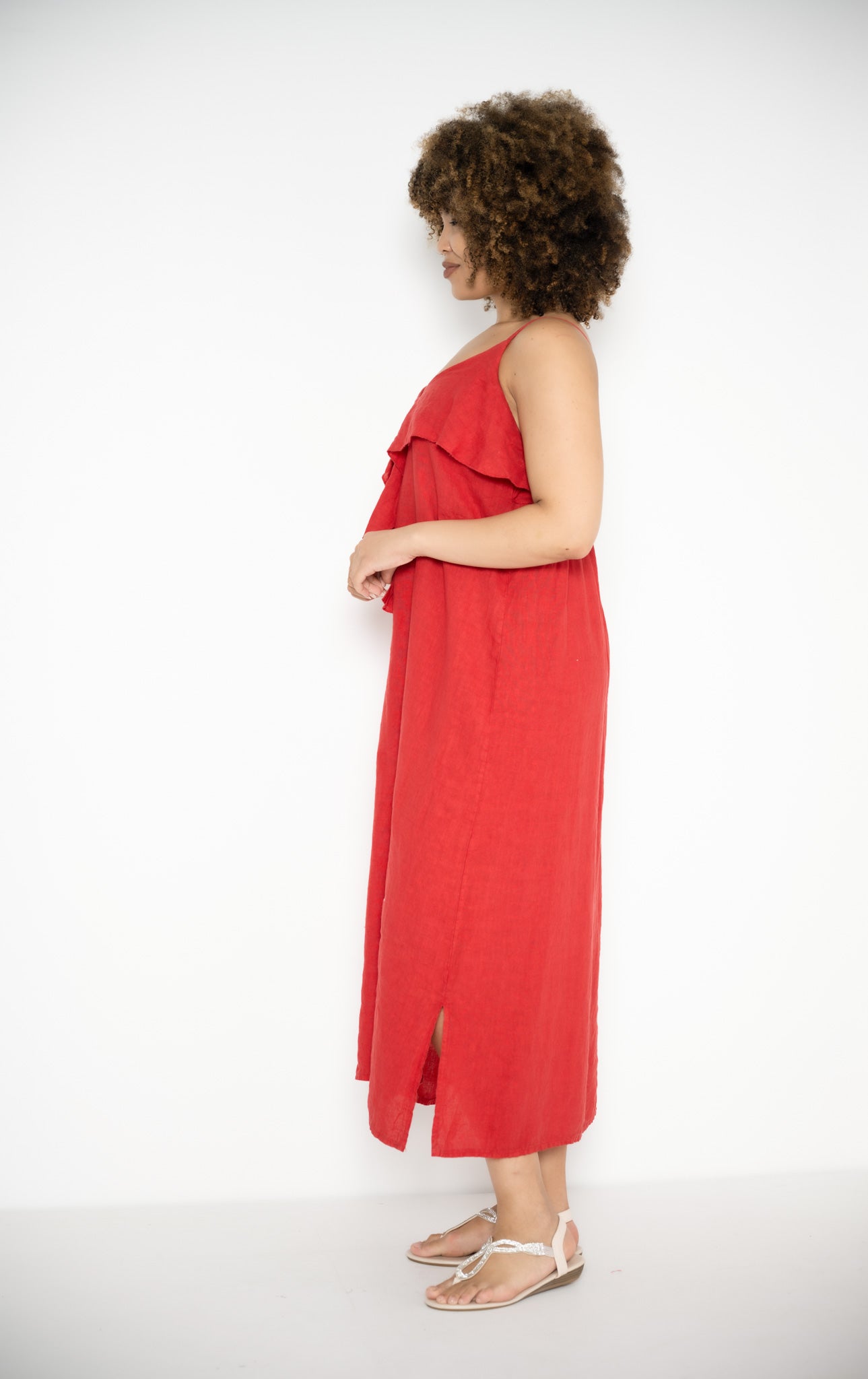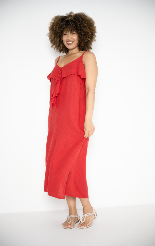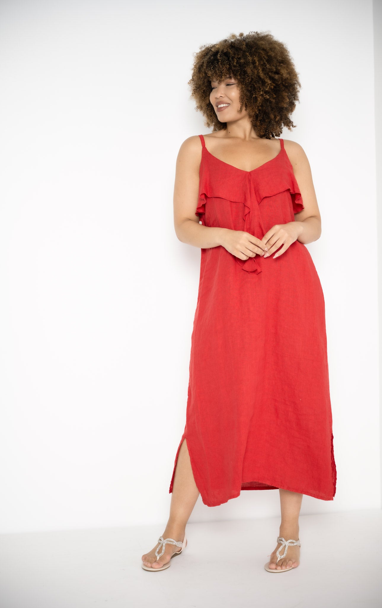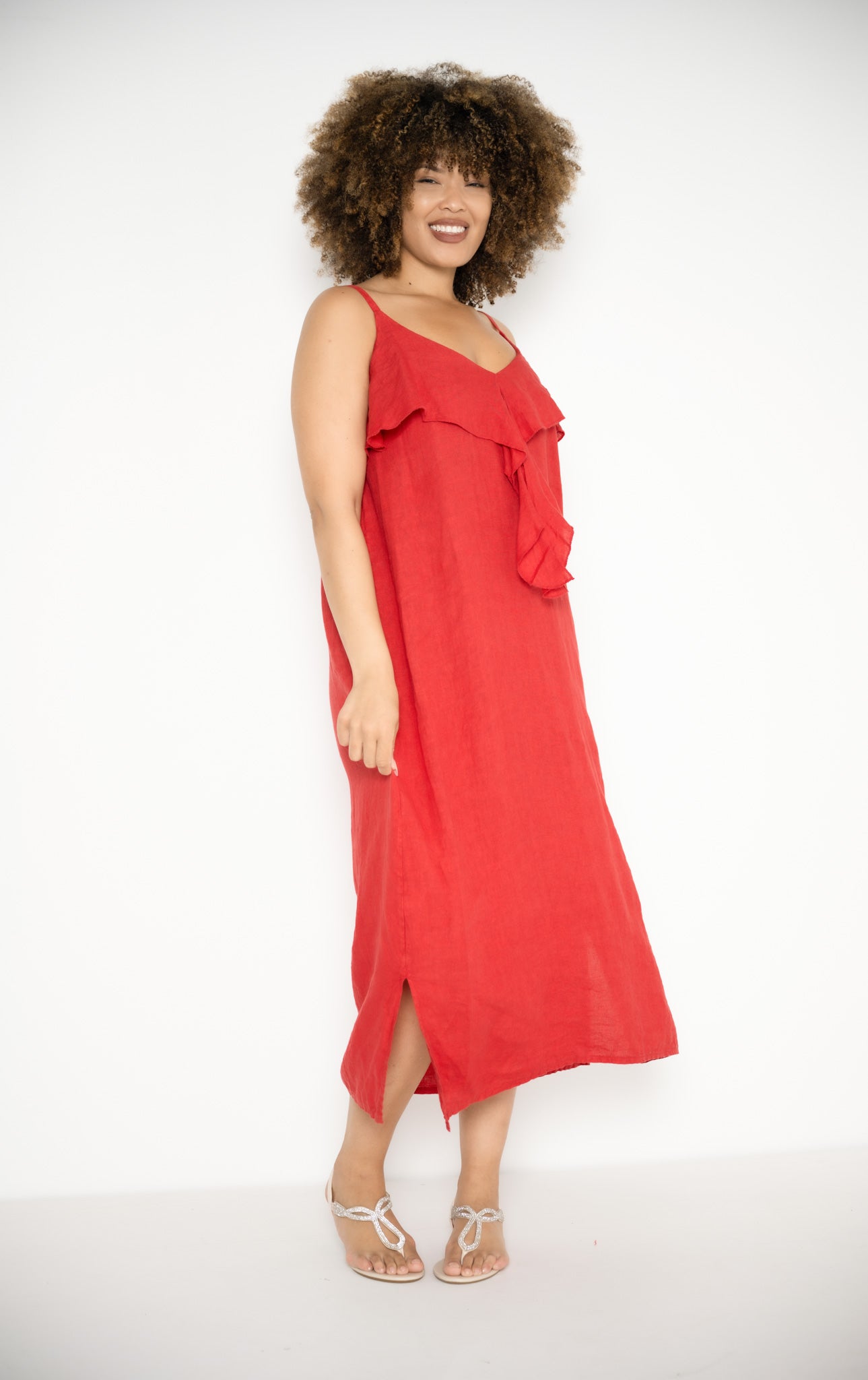 The Natale Dress in vibrant red is a stunning Italian-made piece designed to bring festive elegance to your wardrobe. Featuring adjustable shoestring straps and a flattering V-neckline, it offers a personalized fit with a touch of feminine charm.
