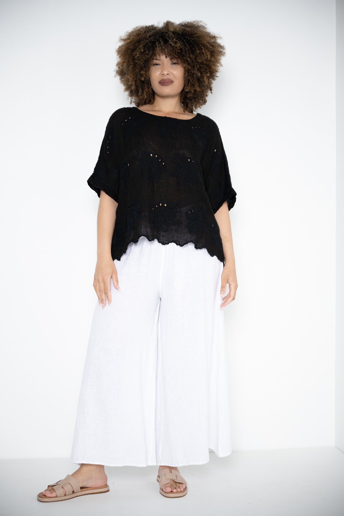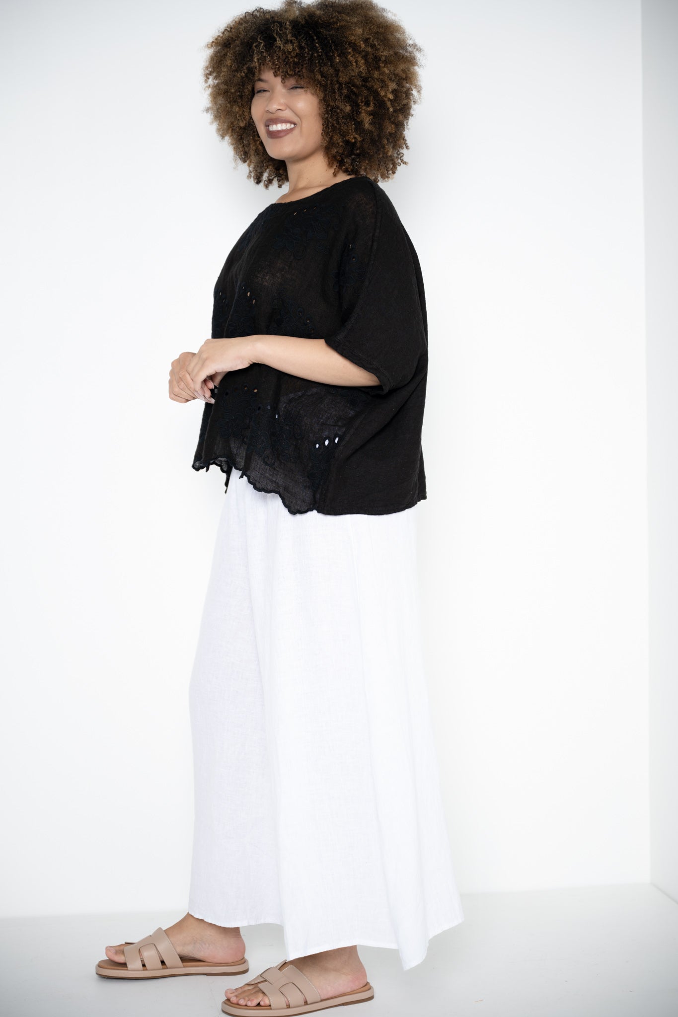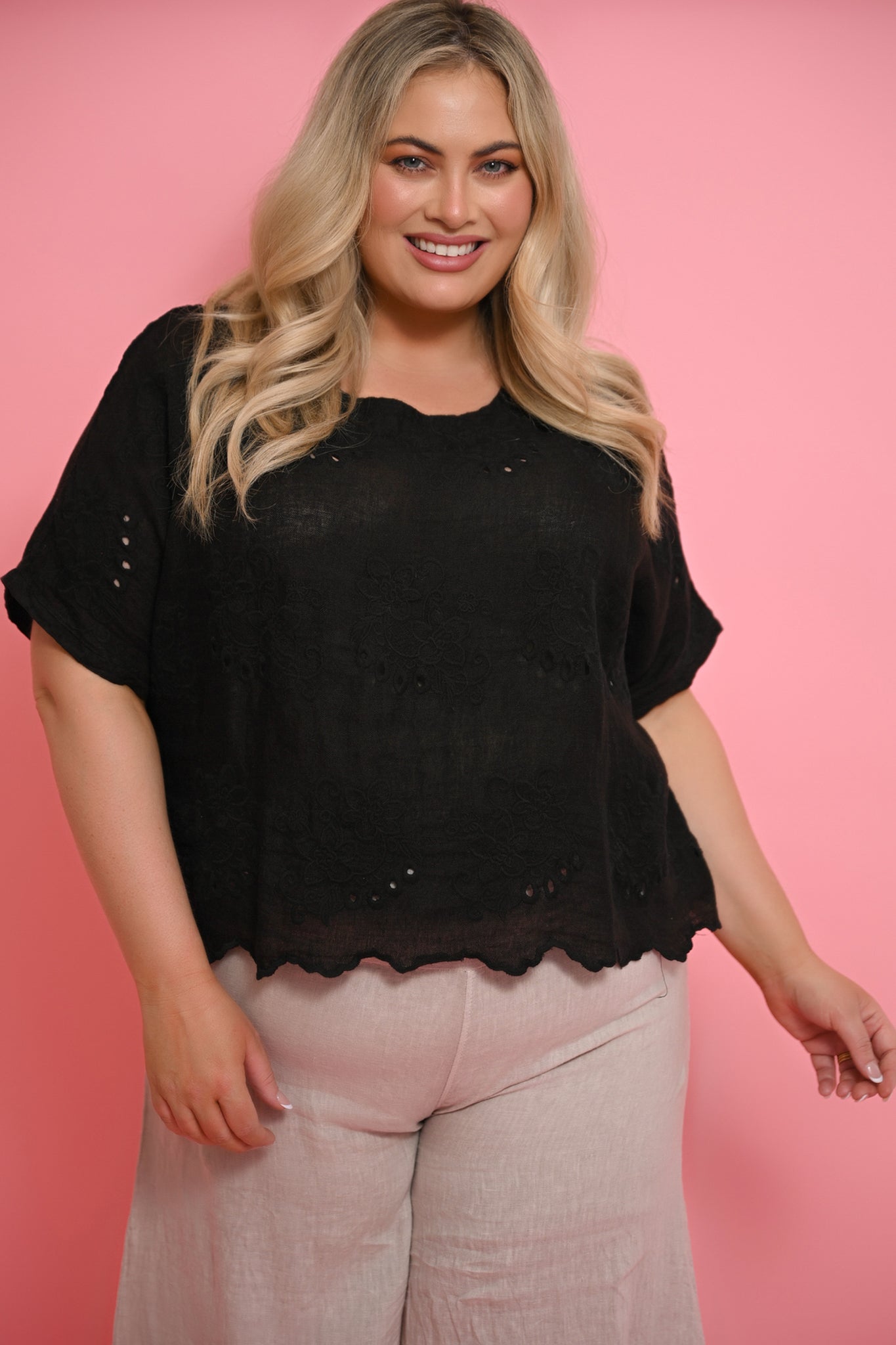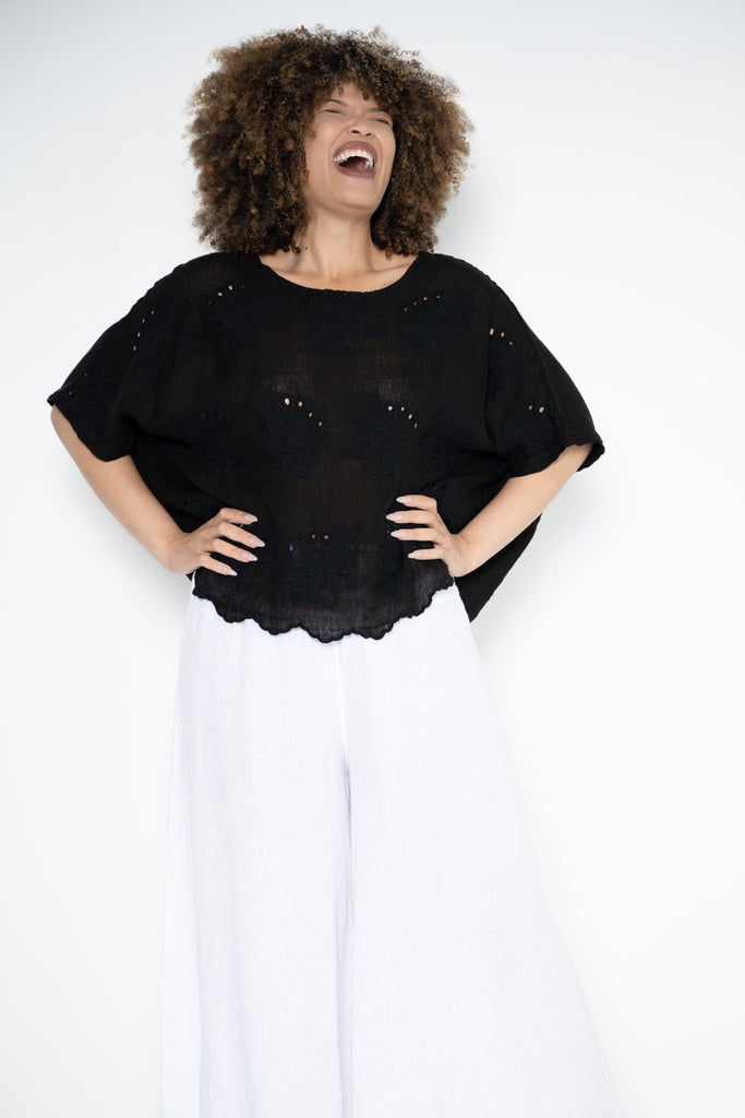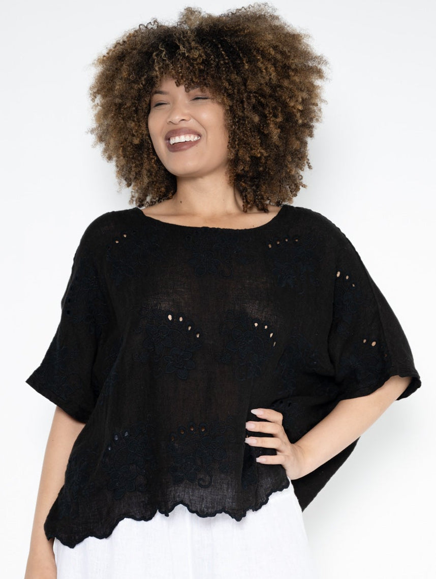The Negroni Top in black is a refined blend of texture and tone, offering a quietly striking presence. The front is crafted from open-weave linen, embroidered all over with a tonal floral design that reveals its detail subtly in the light. A scalloped, stitched hem adds a soft, crafted finish to the front, while the plain linen back brings structure and simplicity.