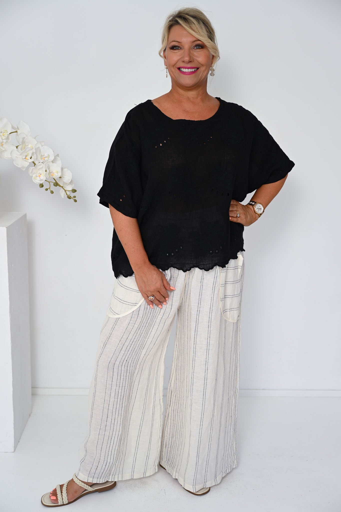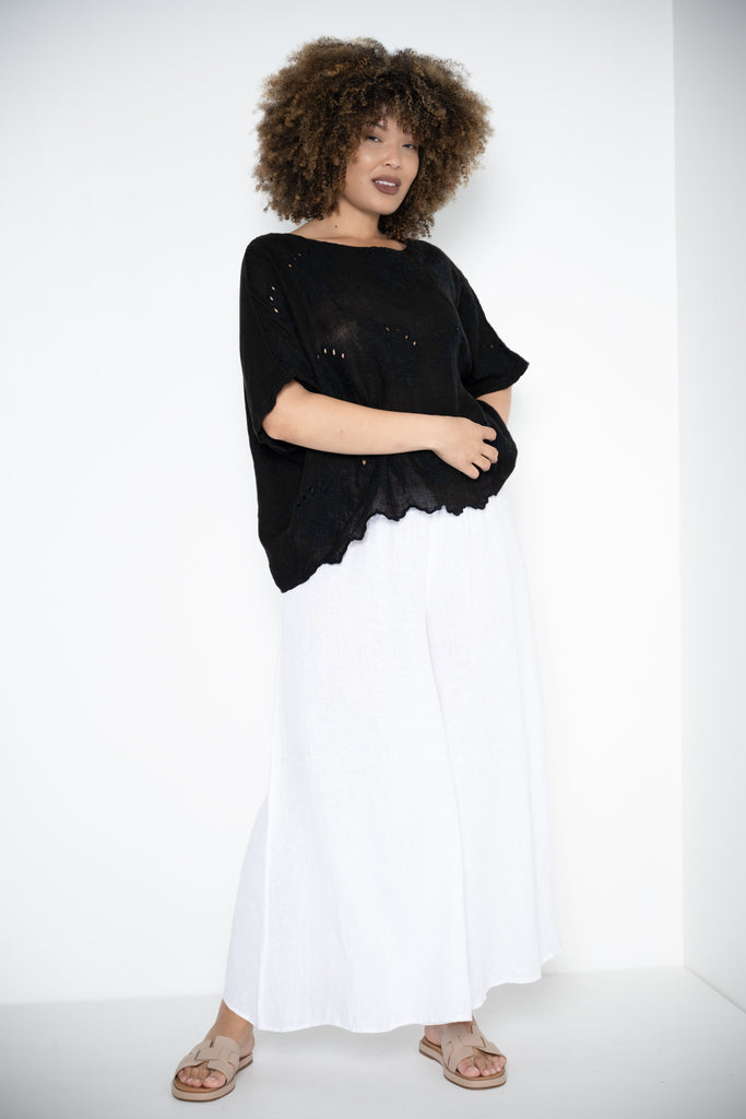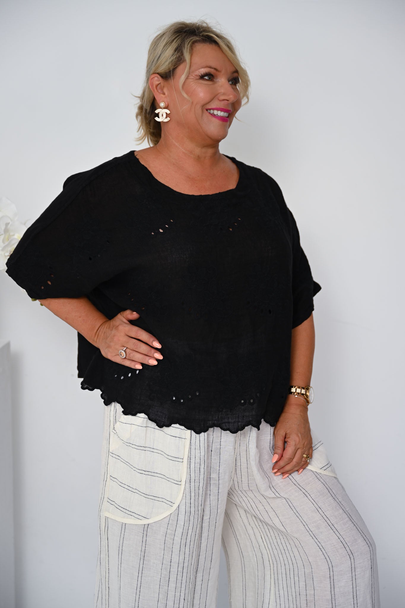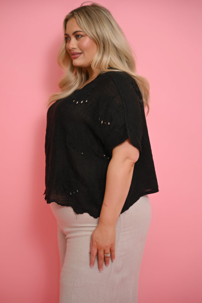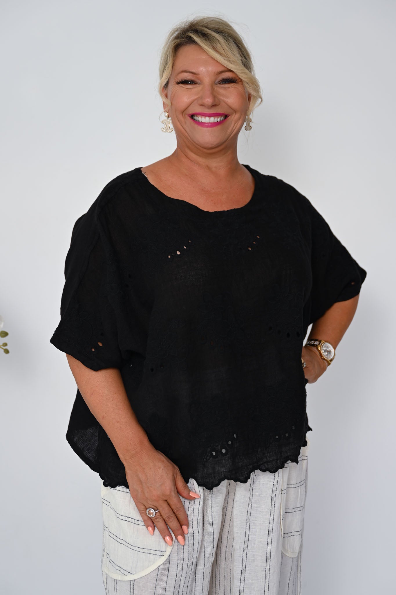 The Negroni Top in black is a refined blend of texture and tone, offering a quietly striking presence. The front is crafted from open-weave linen, embroidered all over with a tonal floral design that reveals its detail subtly in the light. A scalloped, stitched hem adds a soft, crafted finish to the front, while the plain linen back brings structure and simplicity.