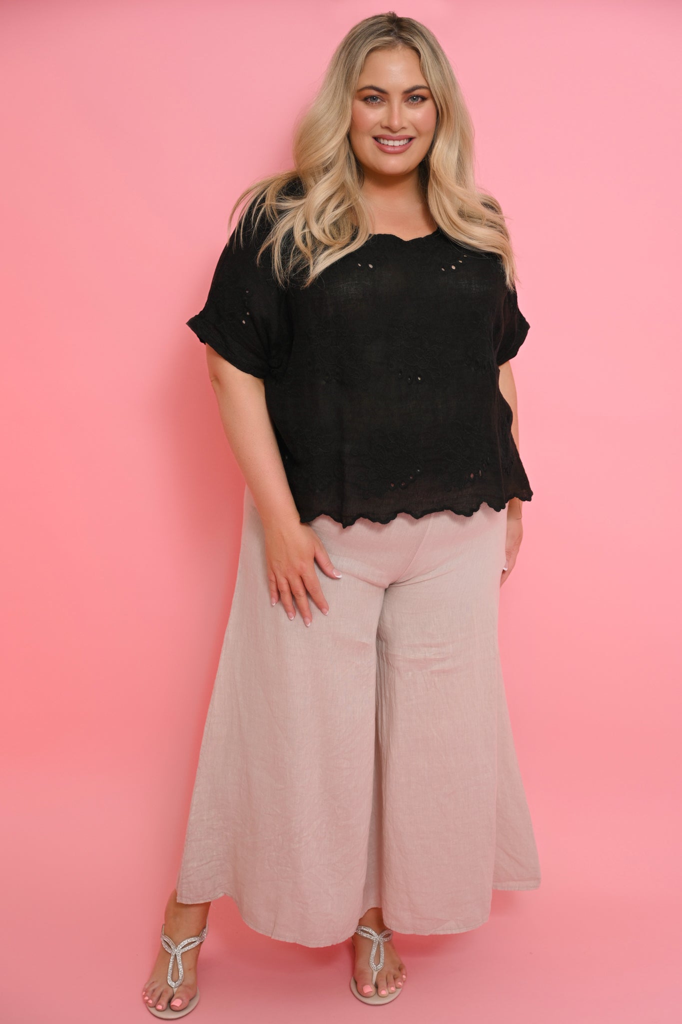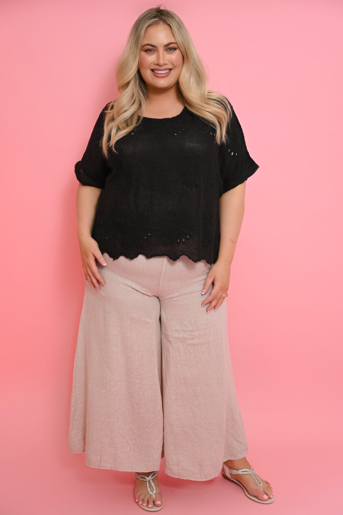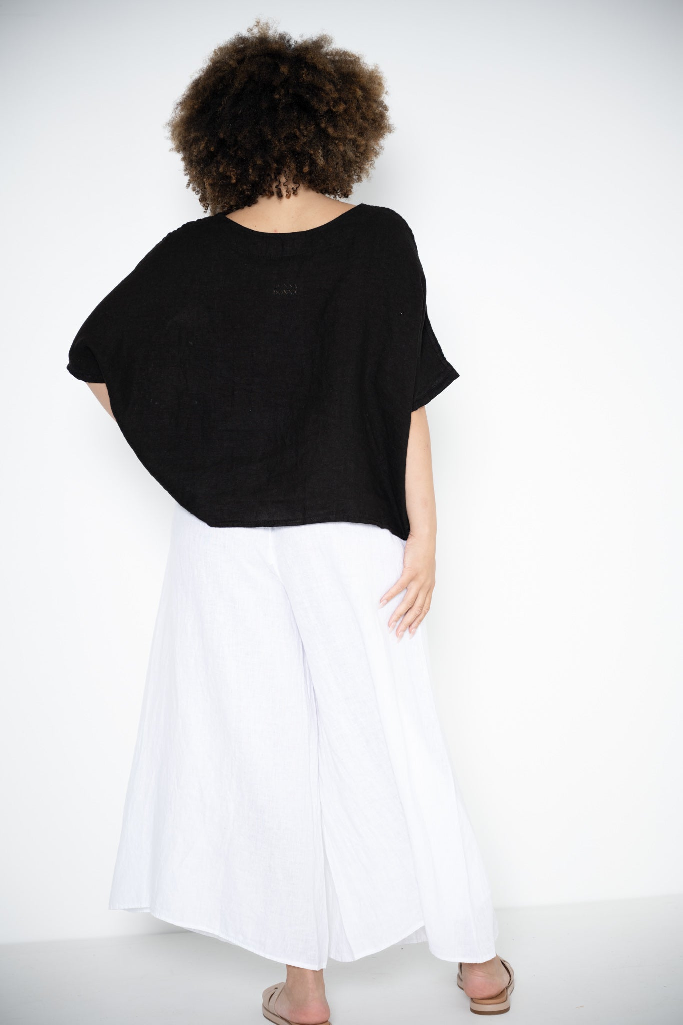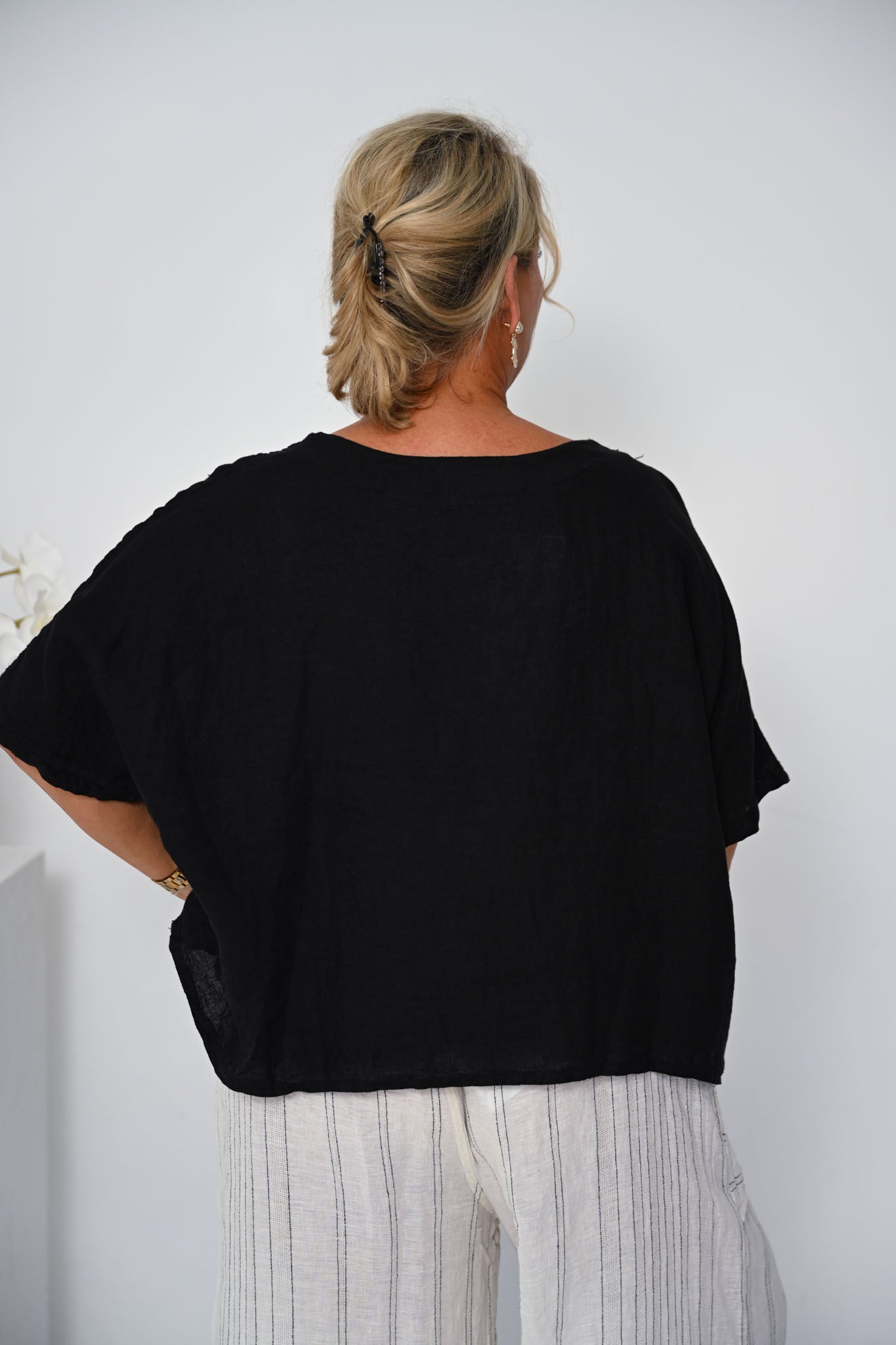 The Negroni Top in black is a refined blend of texture and tone, offering a quietly striking presence. The front is crafted from open-weave linen, embroidered all over with a tonal floral design that reveals its detail subtly in the light. A scalloped, stitched hem adds a soft, crafted finish to the front, while the plain linen back brings structure and simplicity.
