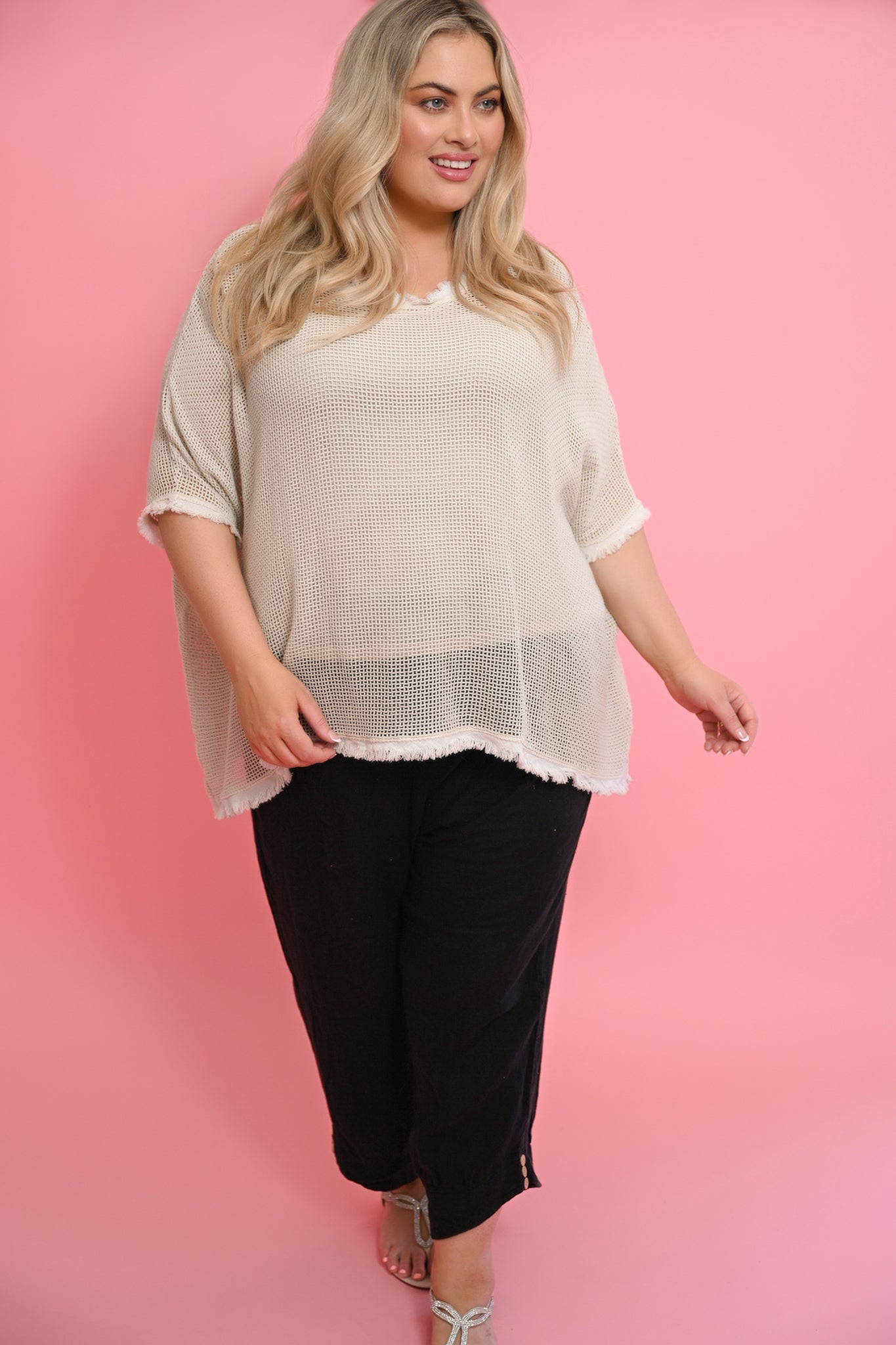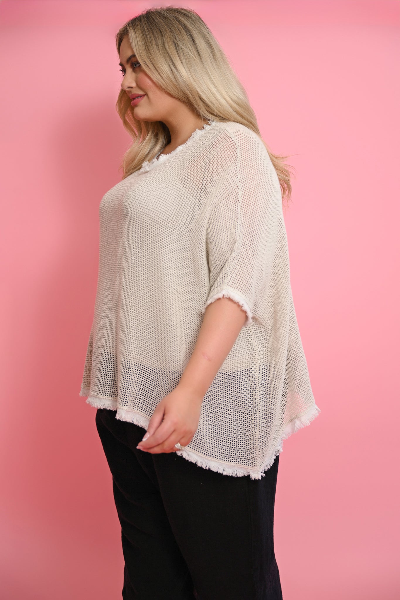 With wide batwing sleeves and a clean round neckline, it’s both airy and grounded—perfect for layering. A separate beige under-singlet sits beneath, offering comfort and coverage while letting the sheer texture take centre stage.
