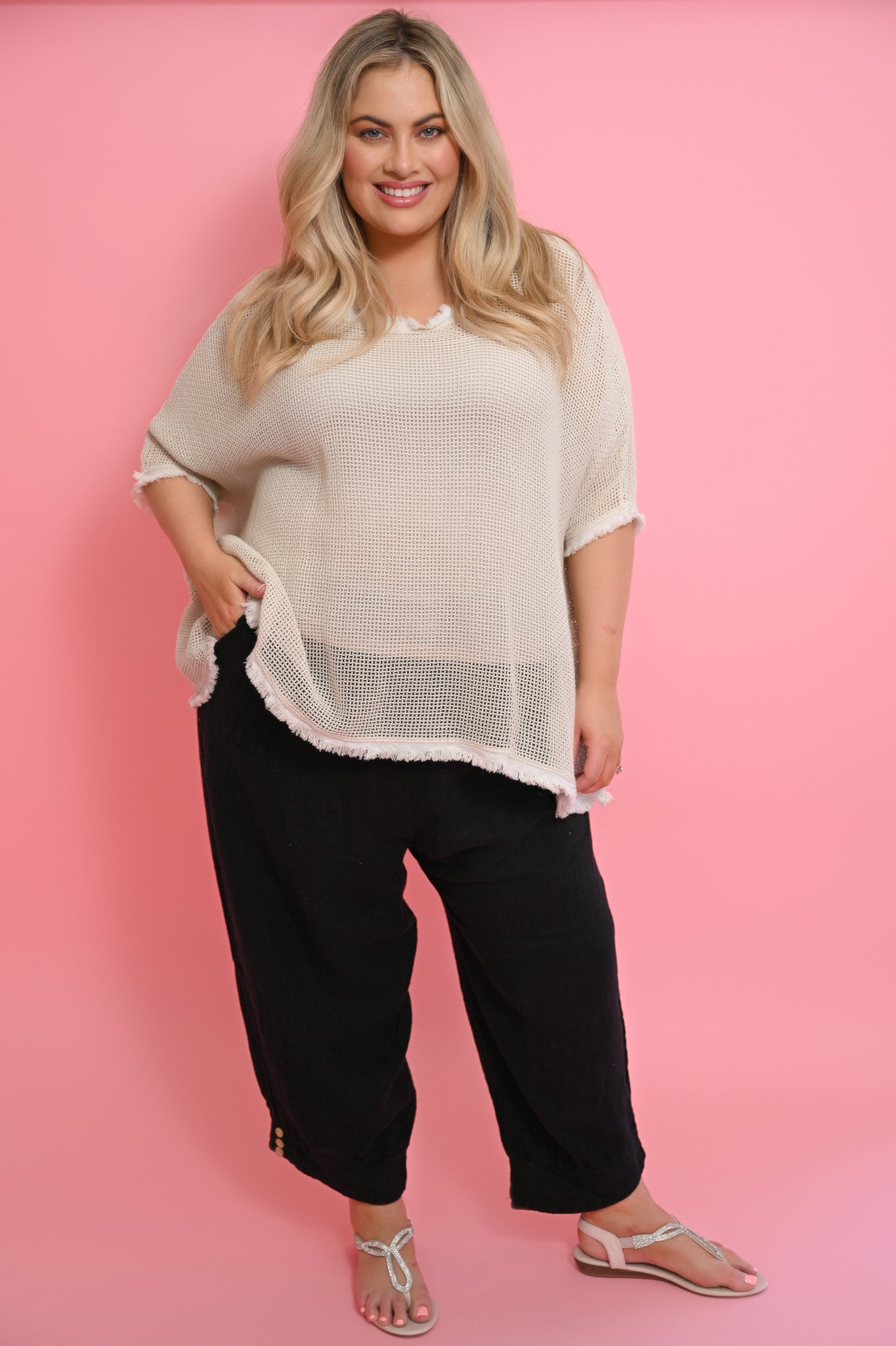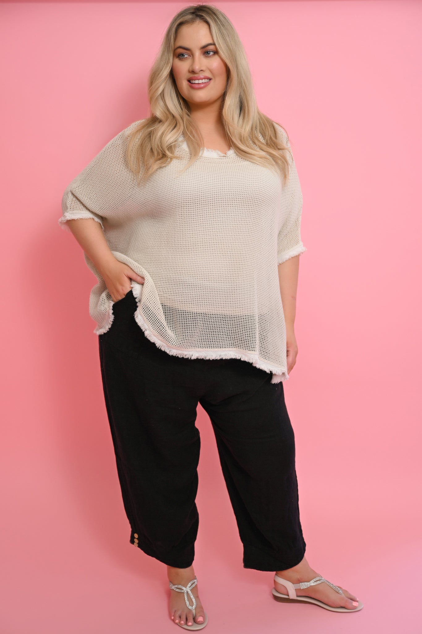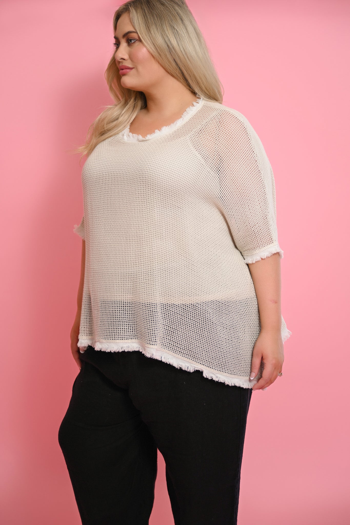 The Netta Set in beige is an effortlessly cool blend of texture and tone, bringing softness and structure together in one striking design. The outer layer, made from an open netted weave, features an oversized square cut that falls loosely over the body, creating a relaxed yet sculptural silhouette. Frayed edges at the neckline, cuffs, and hem add a touch of raw detail, giving the piece a natural, lived-in feel.