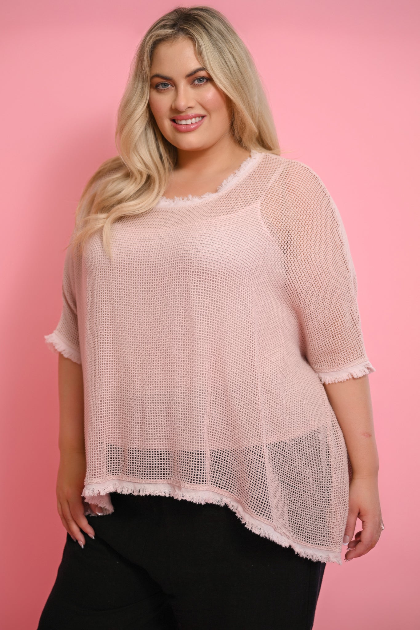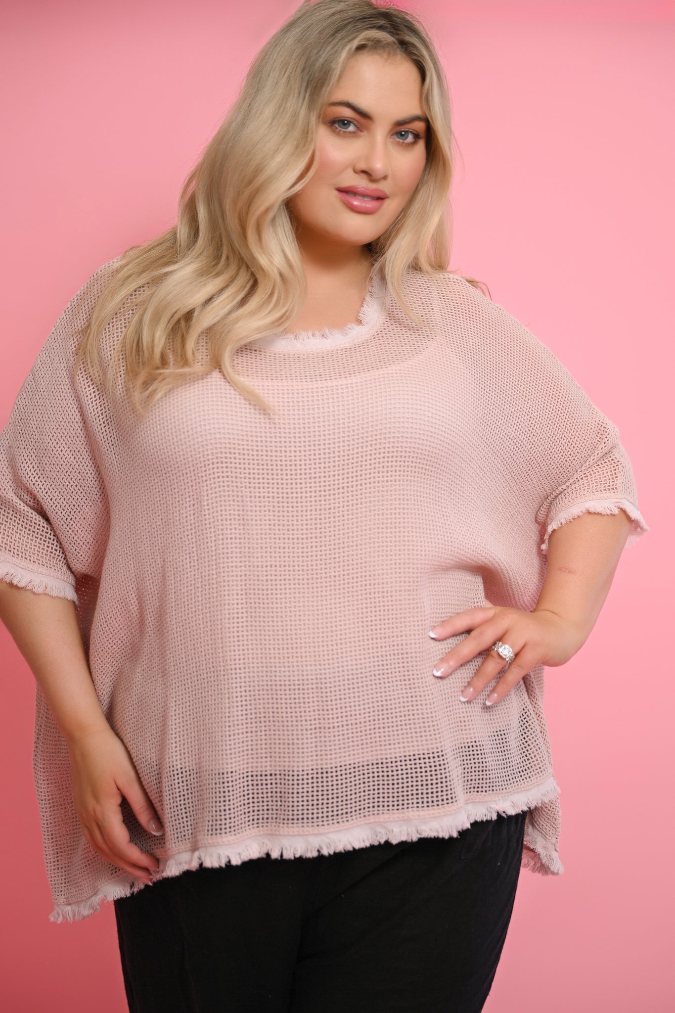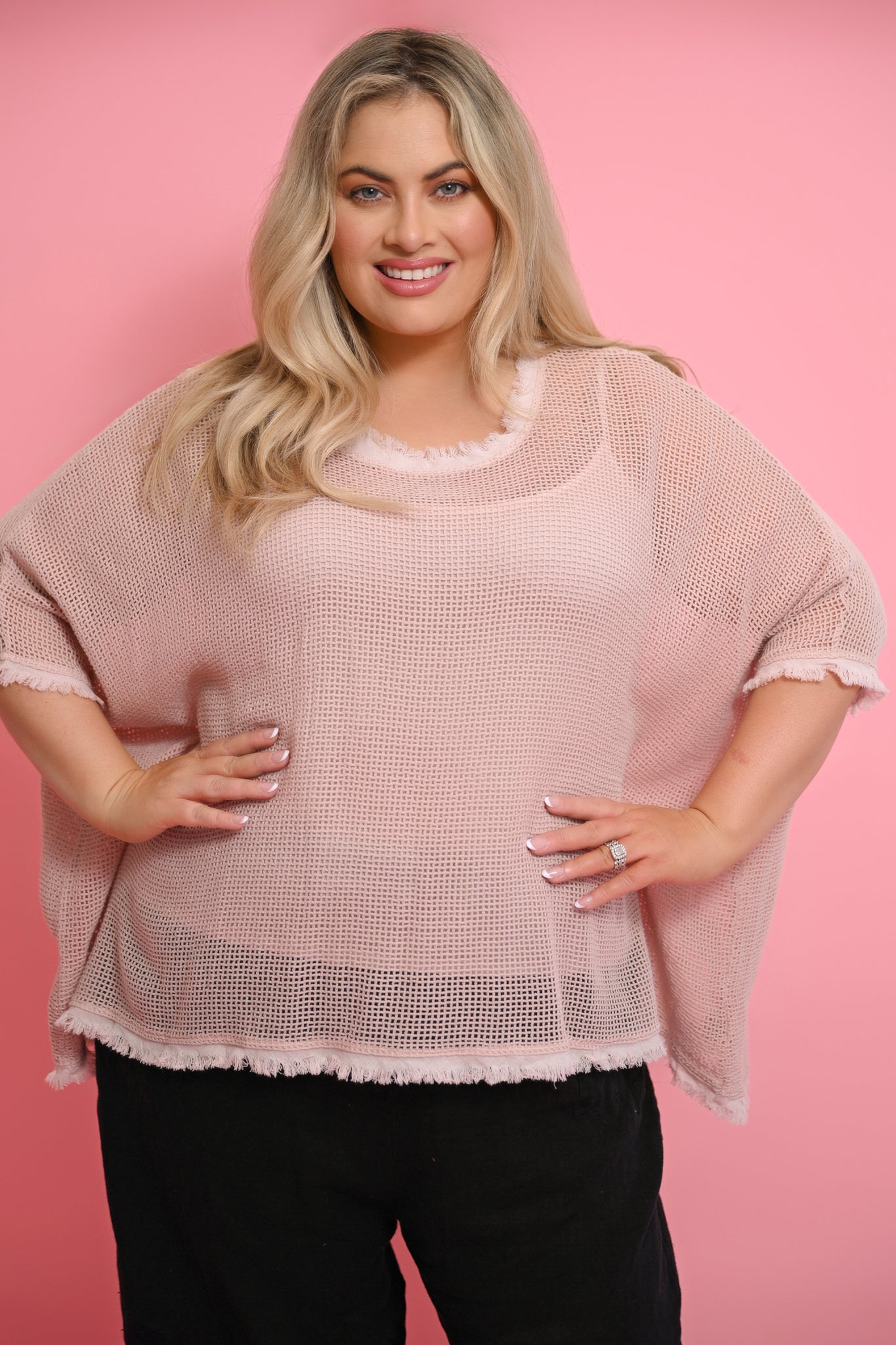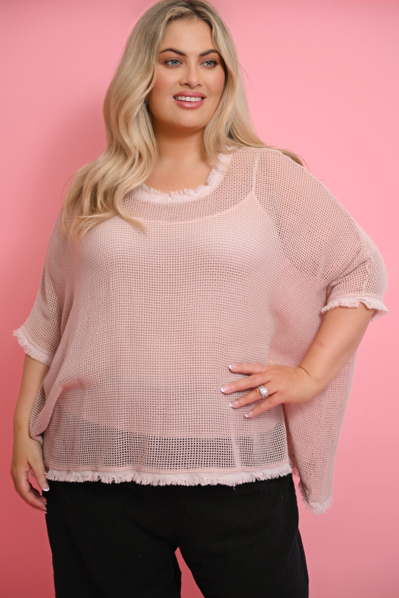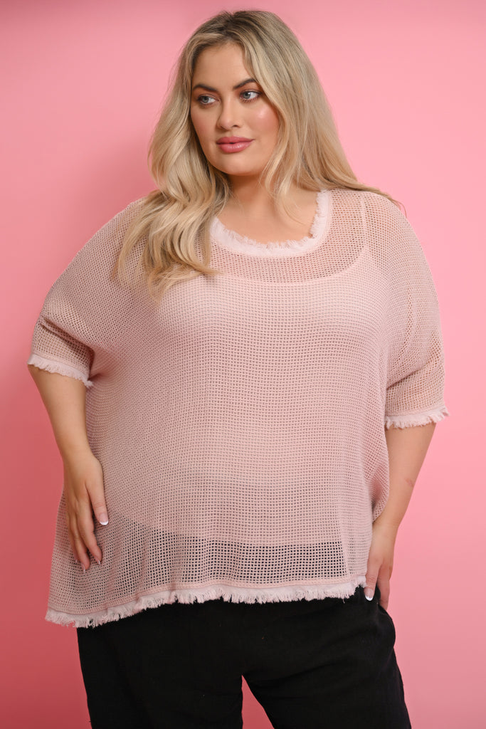 The Netta Set in pink brings a fresh burst of energy to a striking, layered silhouette. Designed with a wide, boxy cut, the netted outer layer drapes effortlessly with a sculptural feel, while the soft batwing sleeves and frayed edges at the hem, neckline, and cuffs add a touch of playful rawness.