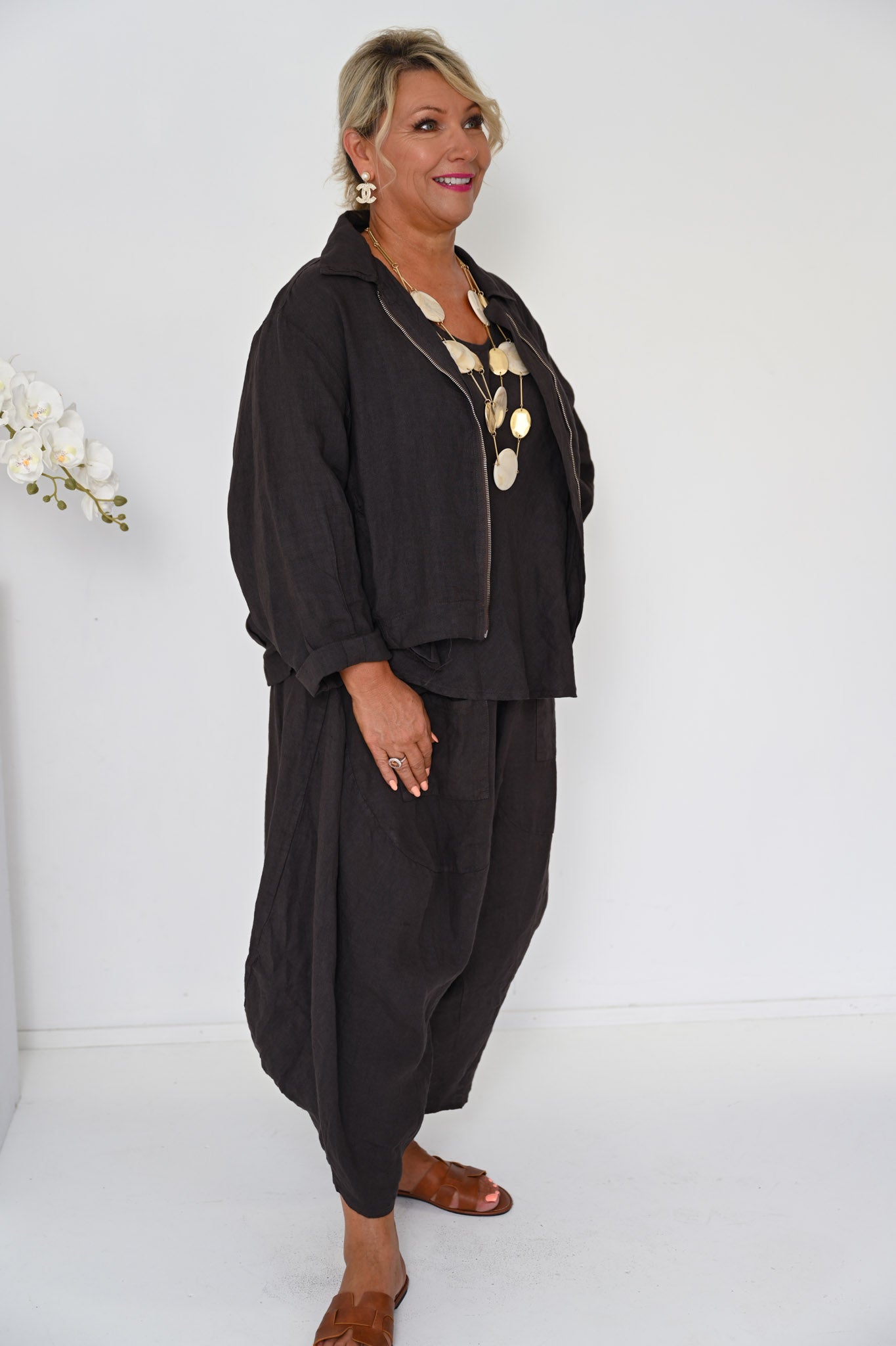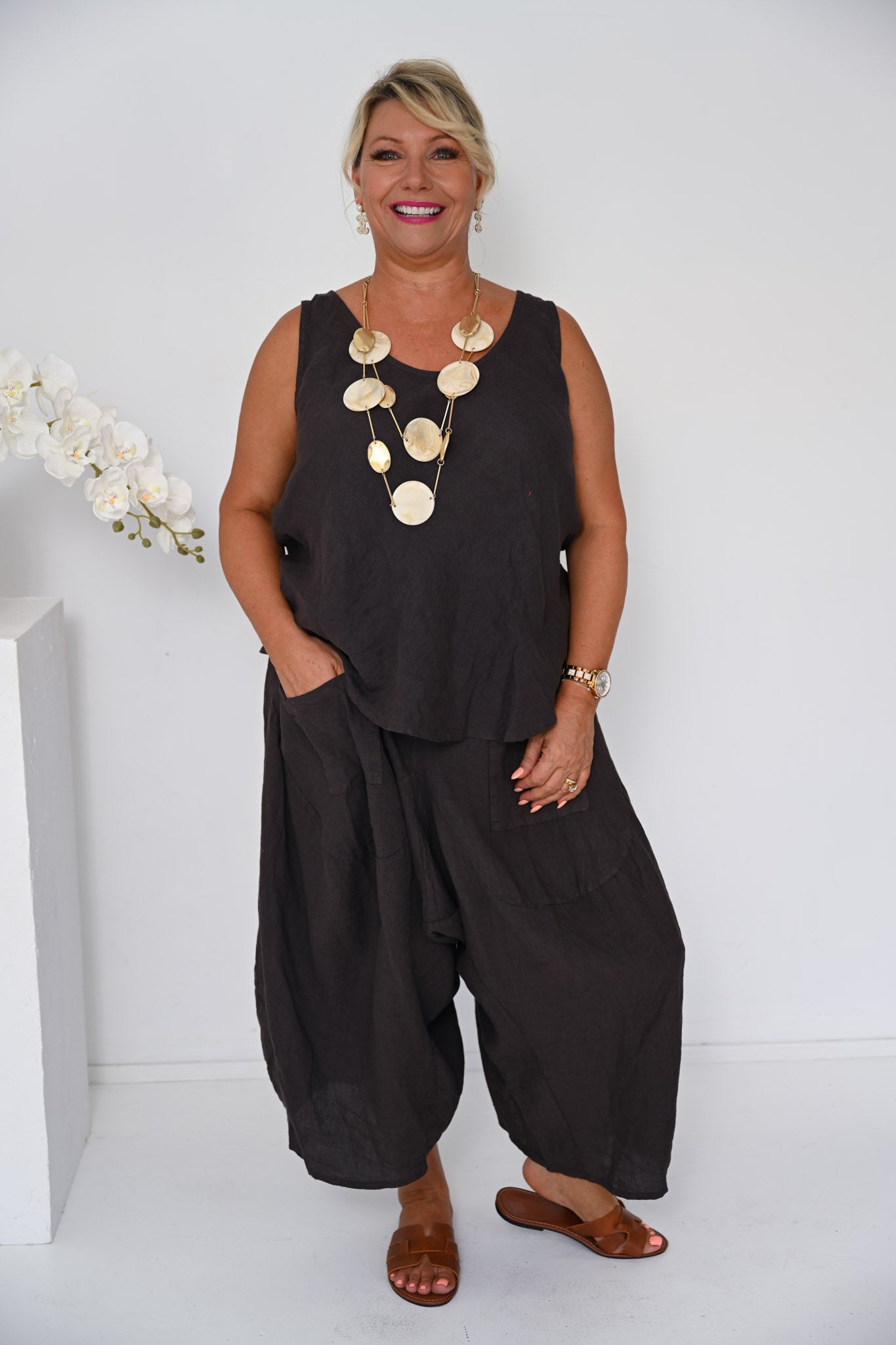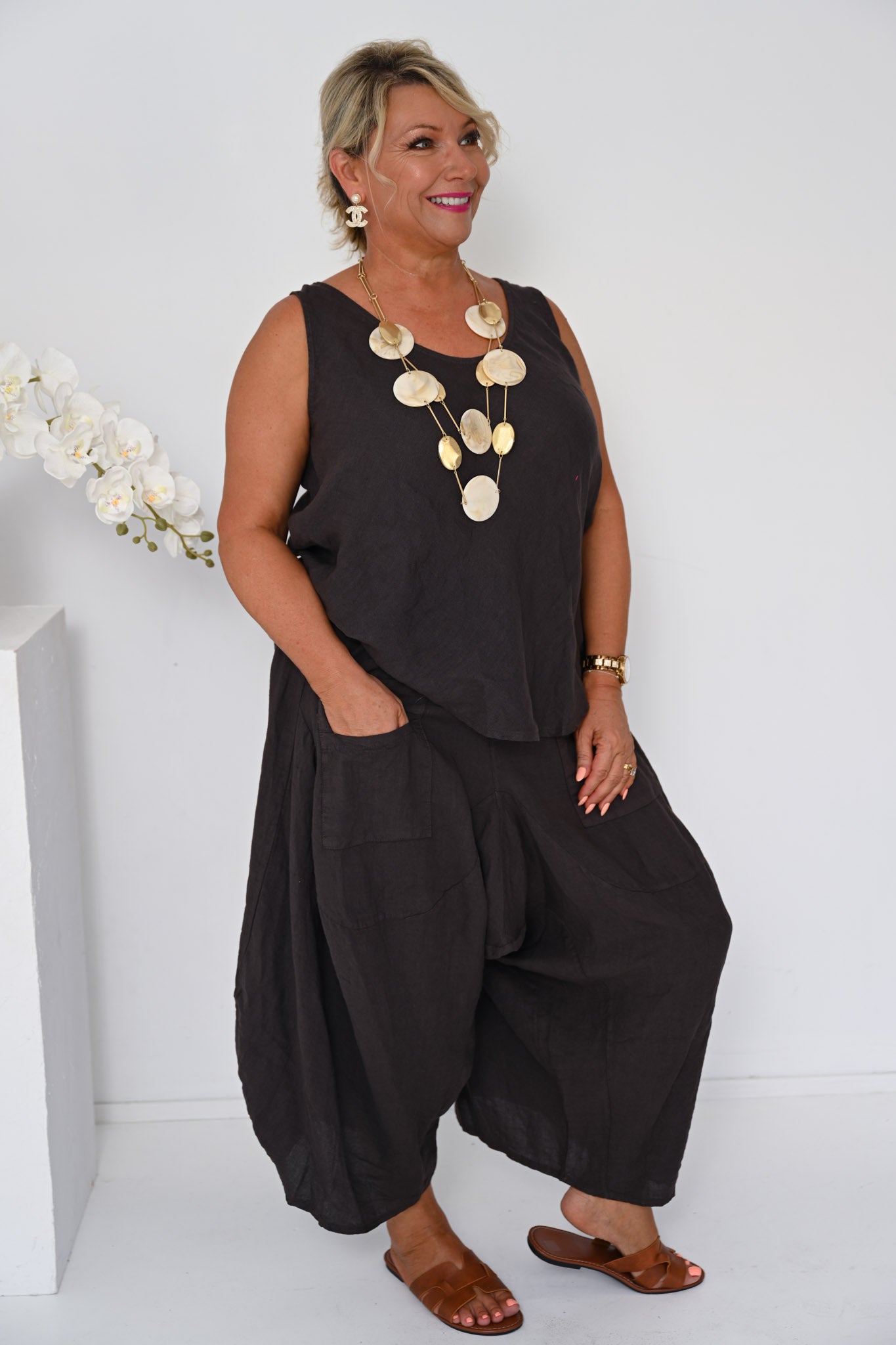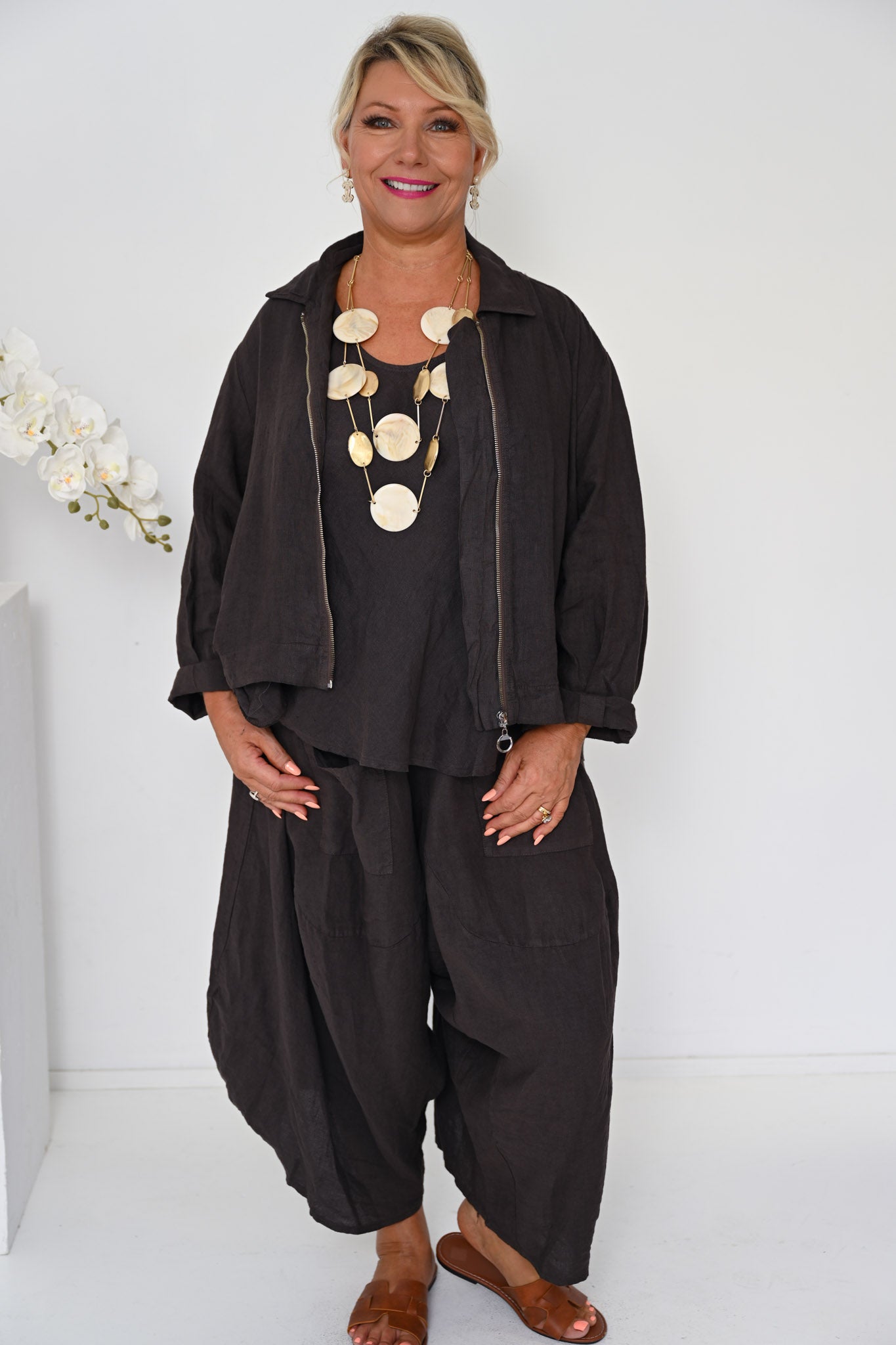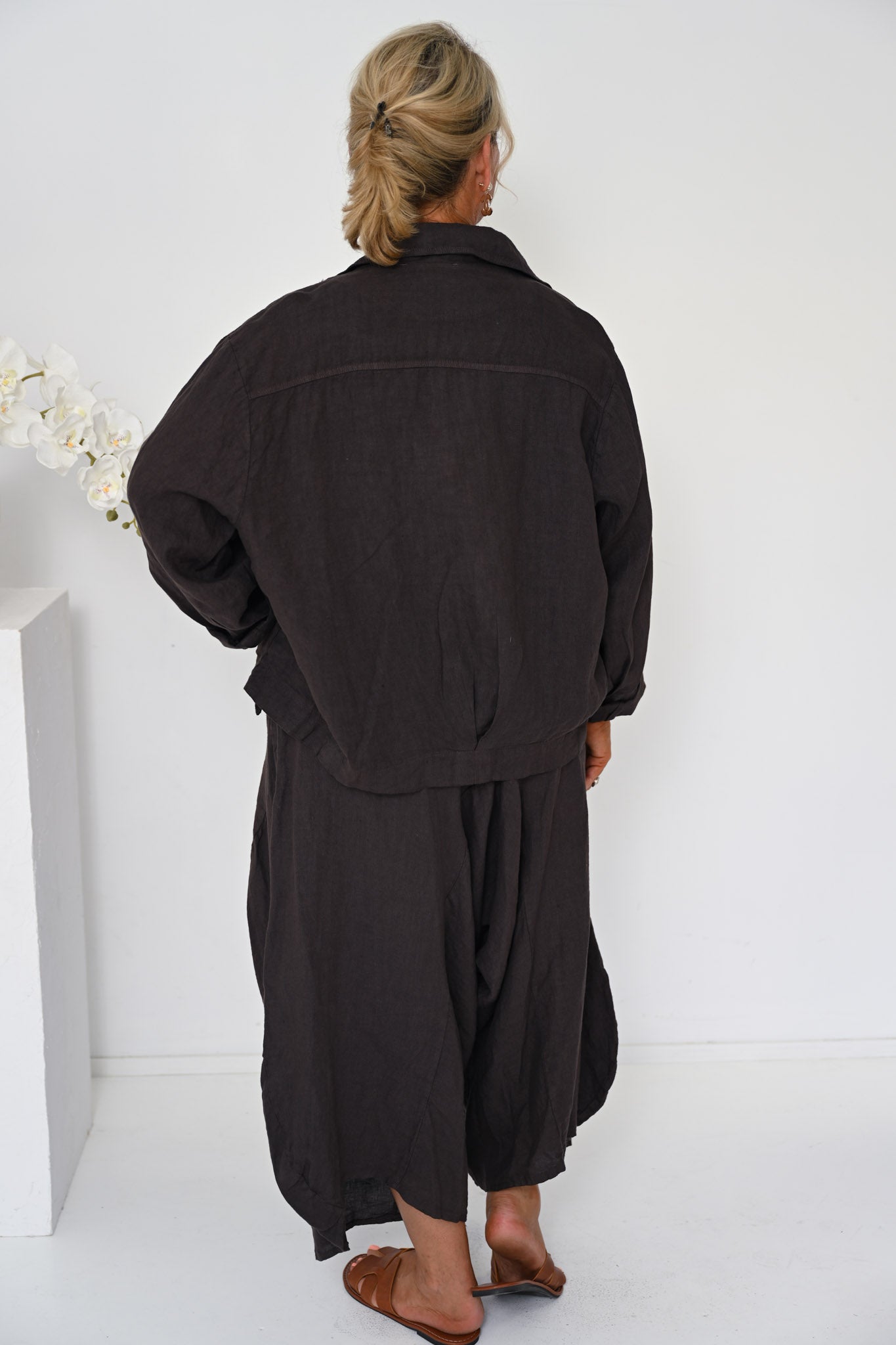 Add understated elegance with our Odyssey Turkish Pants in Cocco, a versatile piece that brings warmth and depth to any look. Pair them with the Linen Camio for a coordinated ensemble, or style them with contrasting pieces for a more eclectic approach. The rich, soft cocoa tone gives the pants a refined, approachable character.