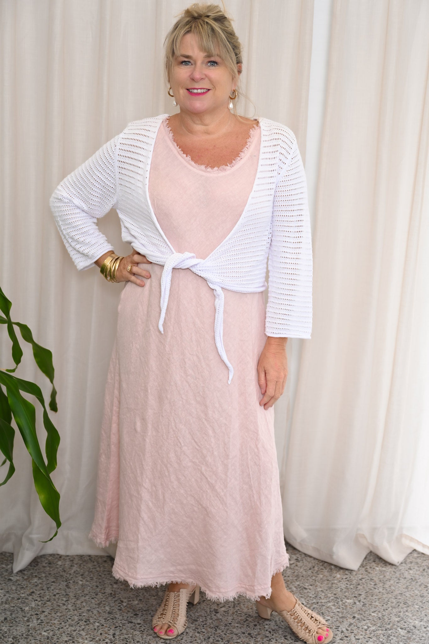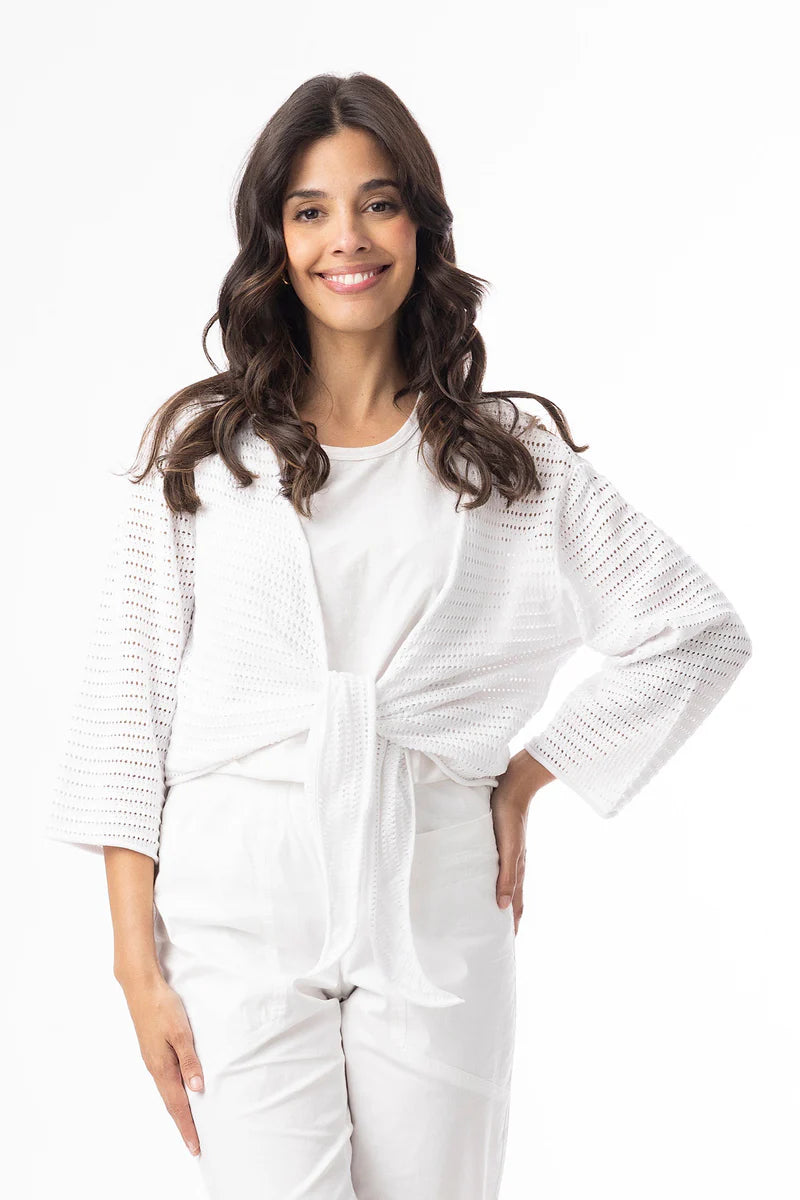 Celebrate summer in our modern garment, the Essential White Knit Shrug, the perfect layering piece for summer. This shrug features an intricate open-knit design and adjustable tie closure that is both stylish and practical for summer. Whether layered over a sundress for a beachside stroll or paired with a sleek evening gown, this shrug is sure to become a staple in your wardrobe.