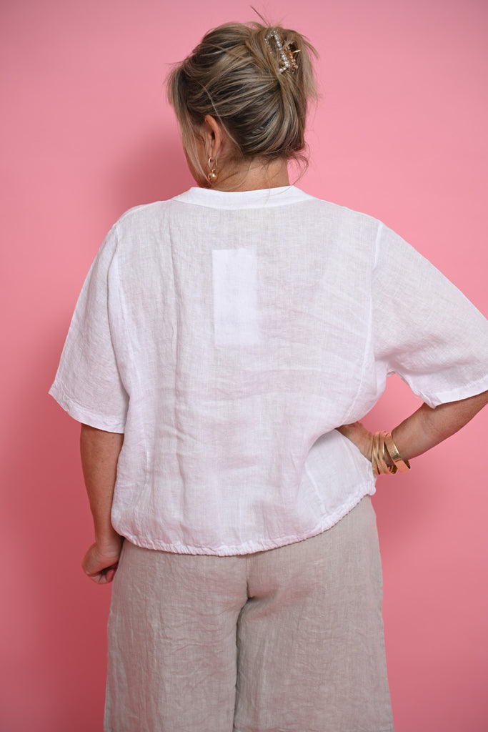 The Ottica Blouse in white is a fresh, airy piece that blends soft structure with relaxed elegance. Crafted from breathable 100% linen, it features a fluid silhouette brought to life with subtle, thoughtful details.