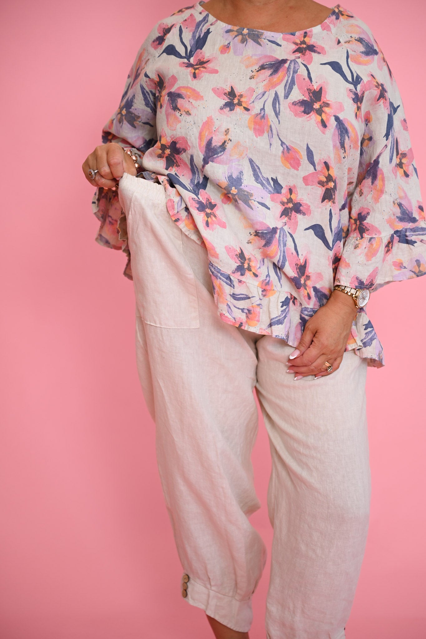 With the elasticised waist and practical hip pockets, these pants perfect the balance of comfort and polish. The tapered leg ends in a thoughtfully designed cuffed ankle with charming button detail, creating a silhouette that's both classic and contemporary. The versatile beige tone pairs seamlessly with everything in your wardrobe, from crisp whites for a fresh summer look to rich darker shades for autumn sophistication. Crafted from high-quality linen, these pants provide year-round style while maintaining that perfect blend of elegance and ease.