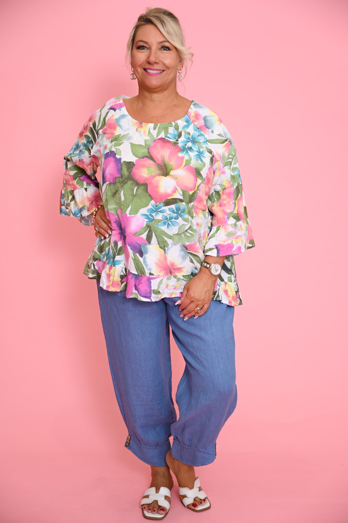 Available in both One Size Fits Most and Plus Size, these linen pants offer versatile comfort for every body type, while the soft blue tone creates stunning synergy with prints, as beautifully demonstrated by Rosaline's styling with our Frascati Top, where it makes the blue florals sing.