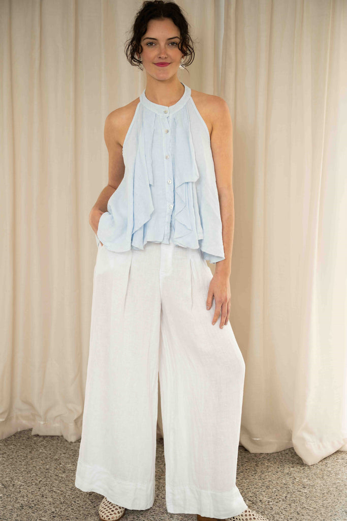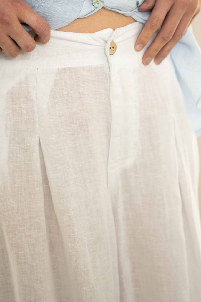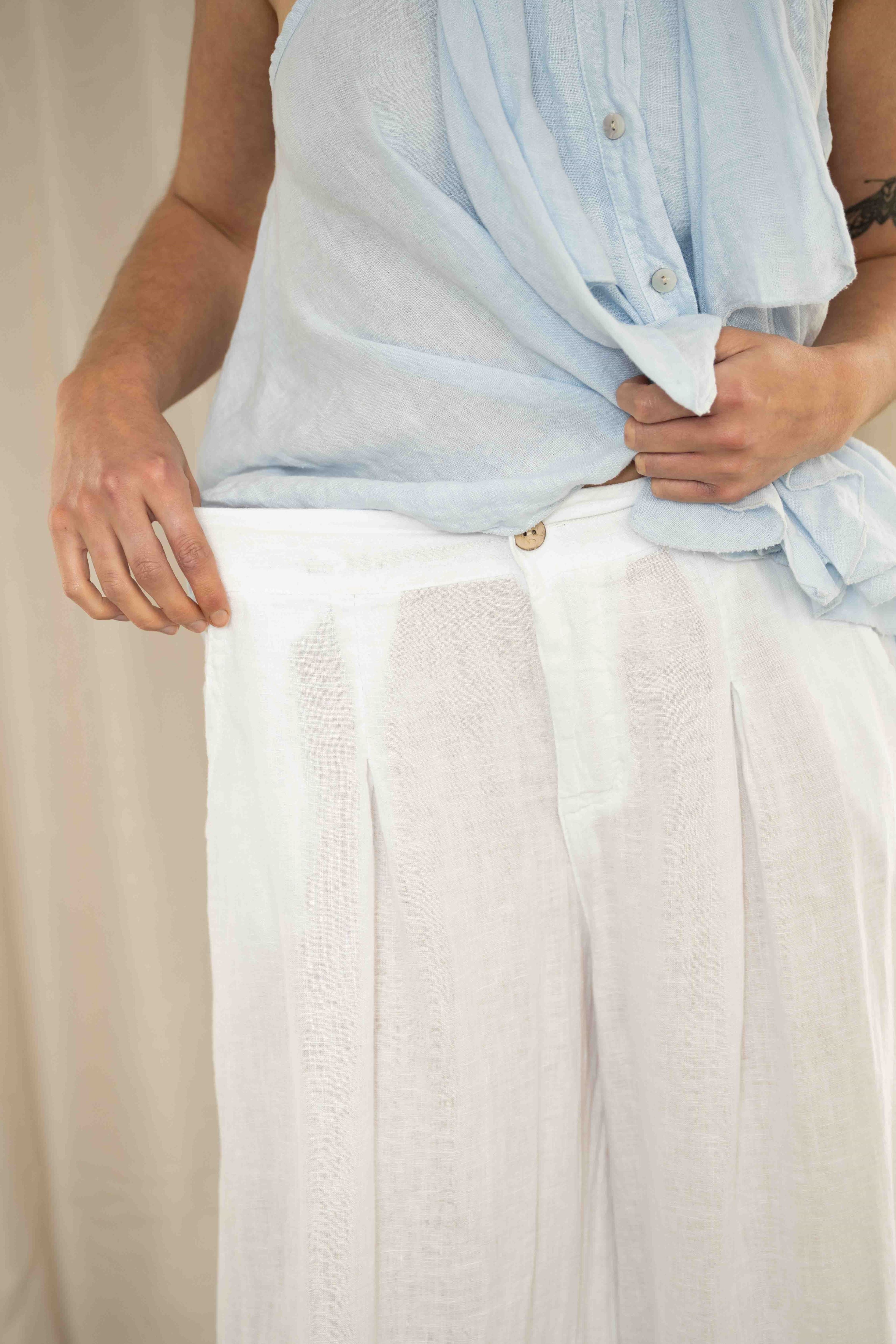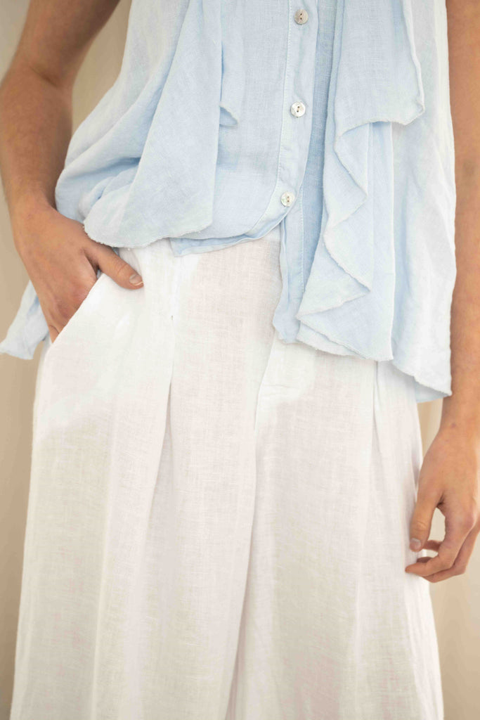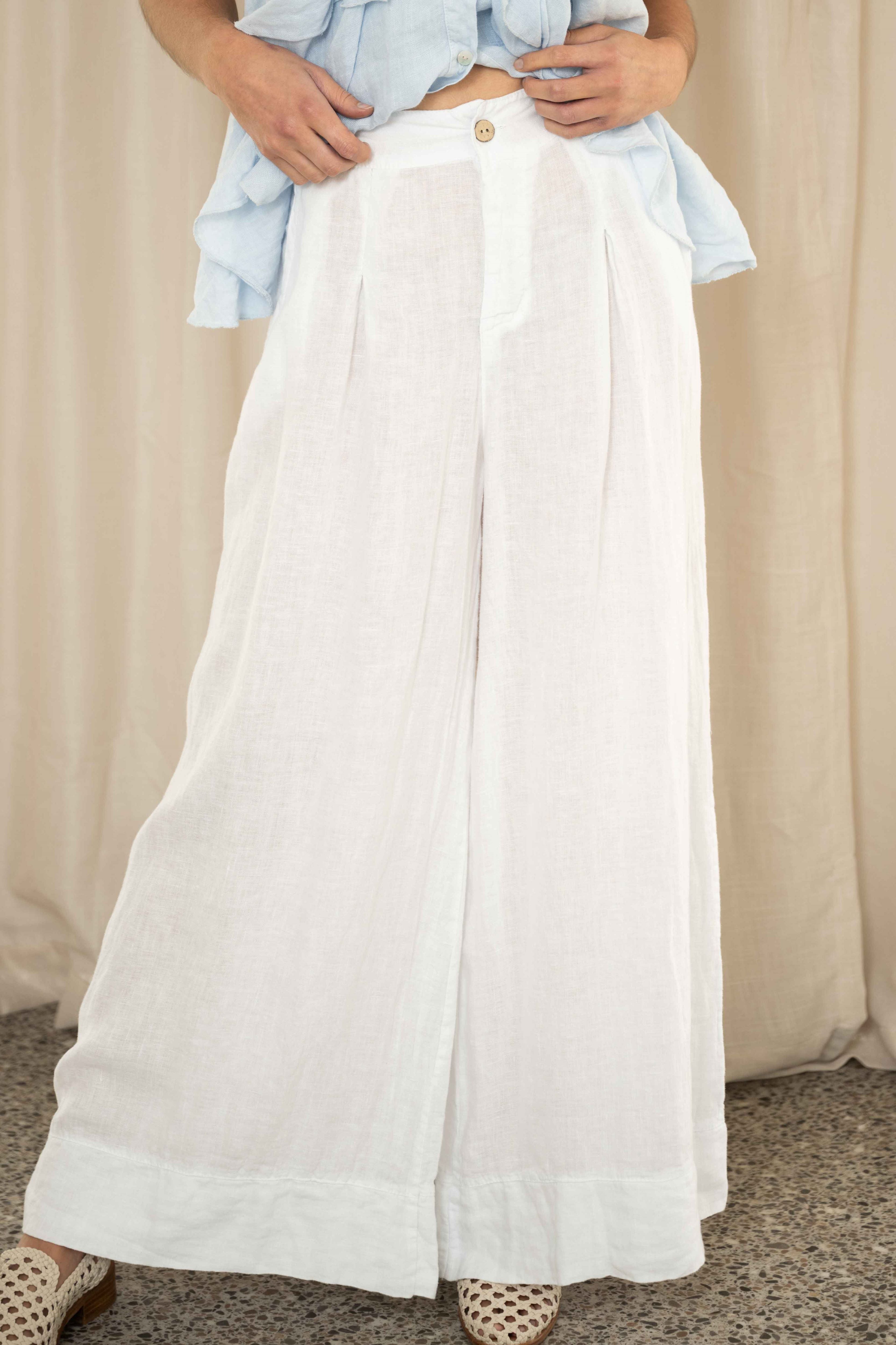 Subtle pin tuck detailing from the hip down enhances the dramatic shape, adding structure and flow. Made from 100% Italian linen, they offer breathable ease for warm-weather wear.