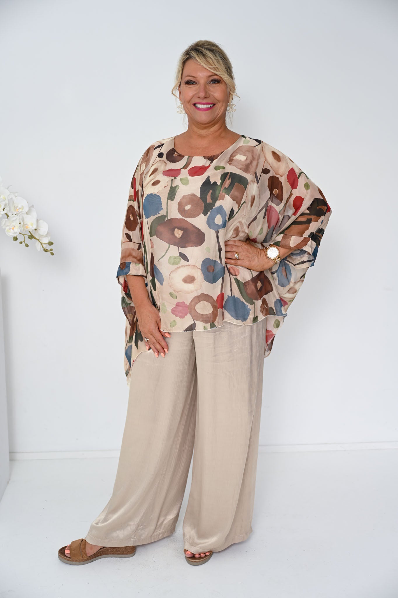 The Poppy Silk Top in Beige offers a warm, sophisticated take on an artful print. Set against a soft beige base, the design features flowing circular motifs in rich burgundy and deep brown tones, creating a layered pattern that feels both earthy and elegant.